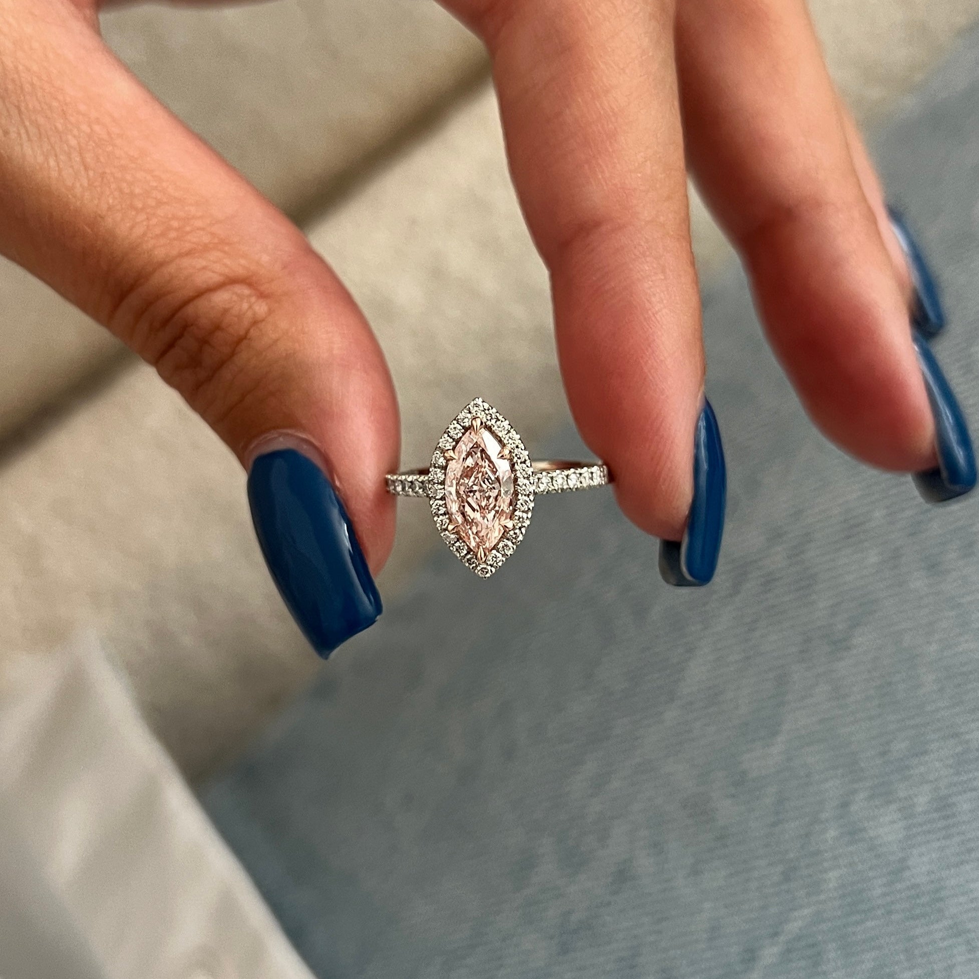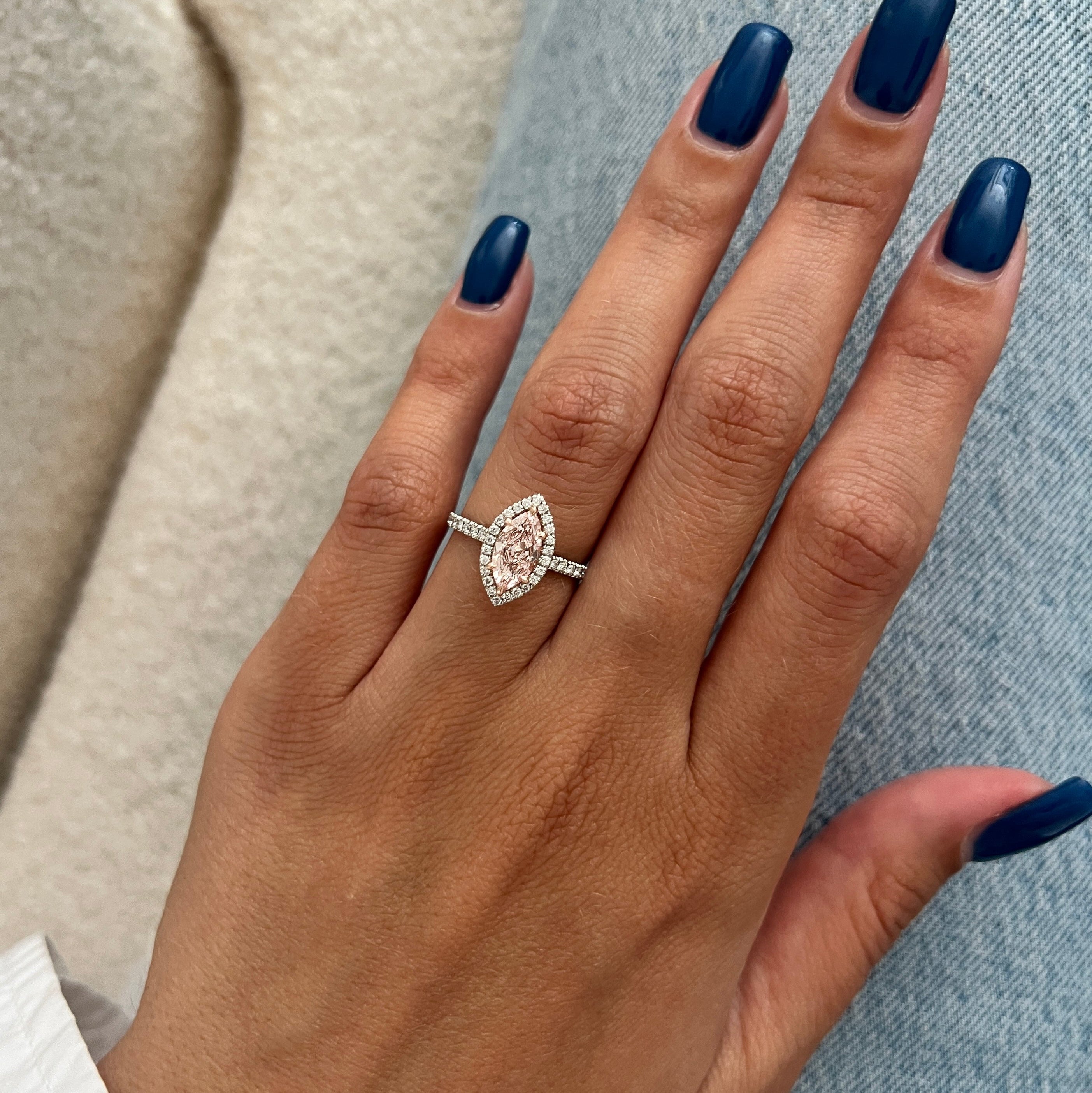 A captivating 1-carat marquise fancy vivid pink lab-grown diamond ring is delicately set in a classic design featuring four graceful cl...