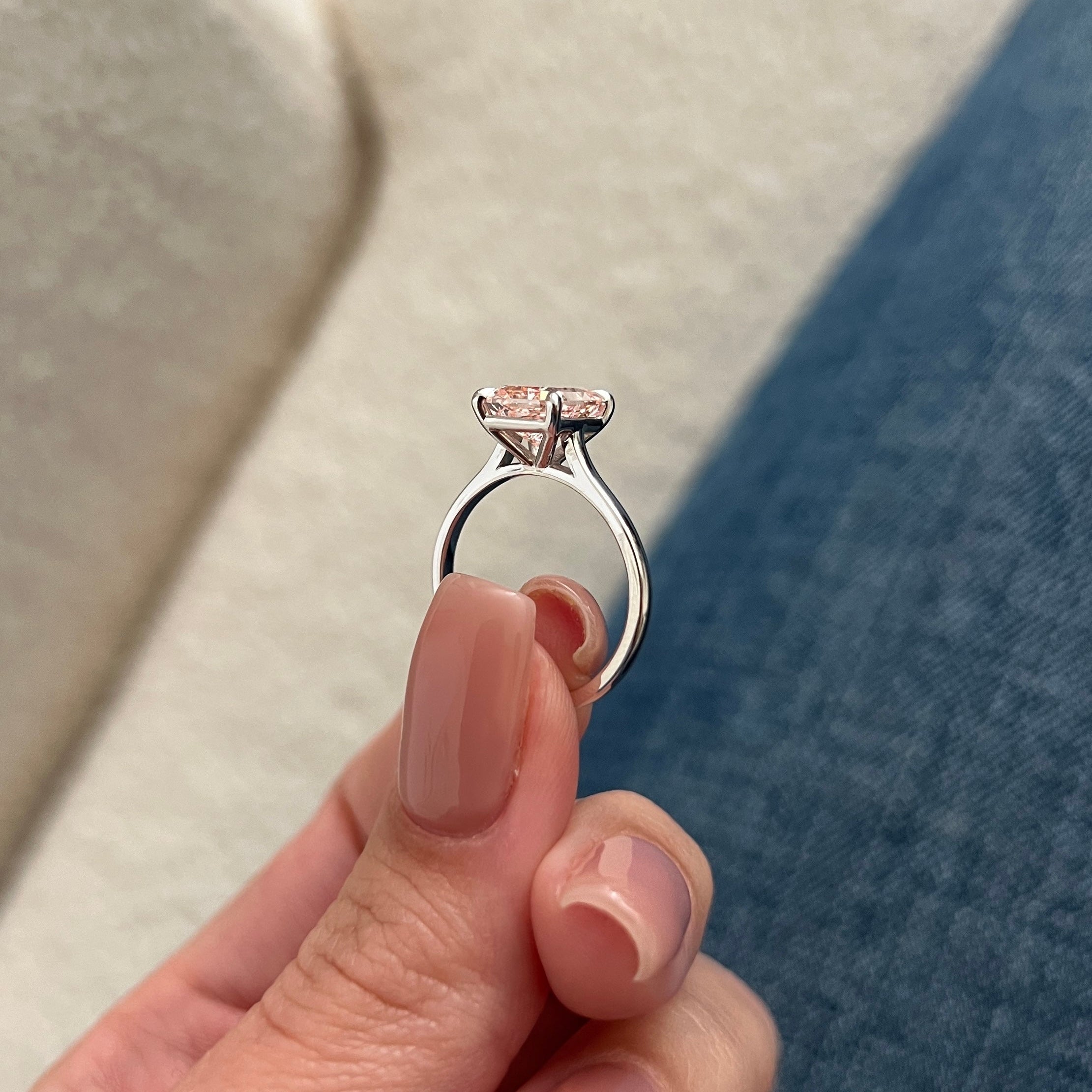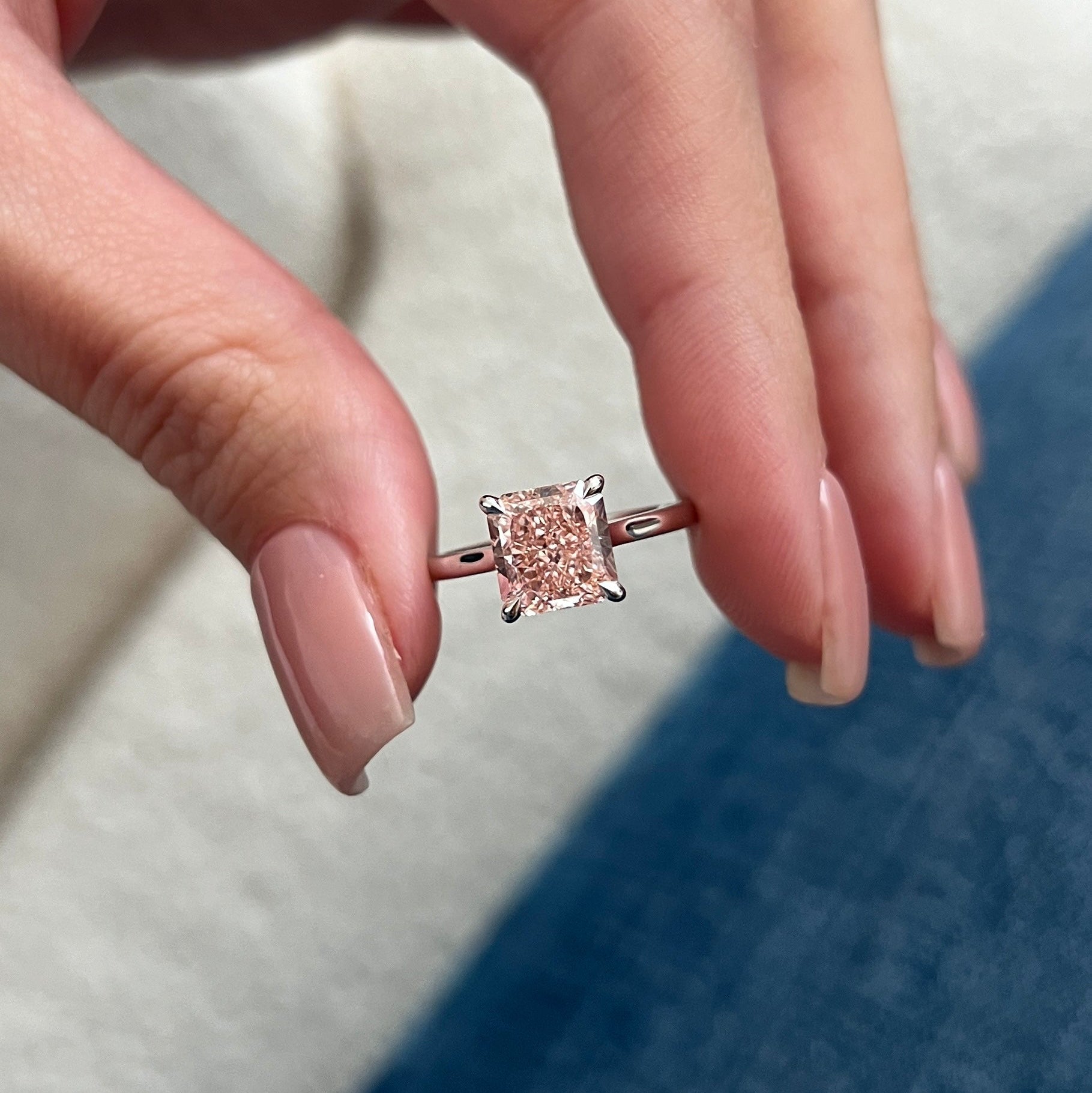 A captivating 2-carat square radiant fancy vivid pink lab-grown diamond ring, delicately set in a classic solitaire design featuring fo...