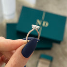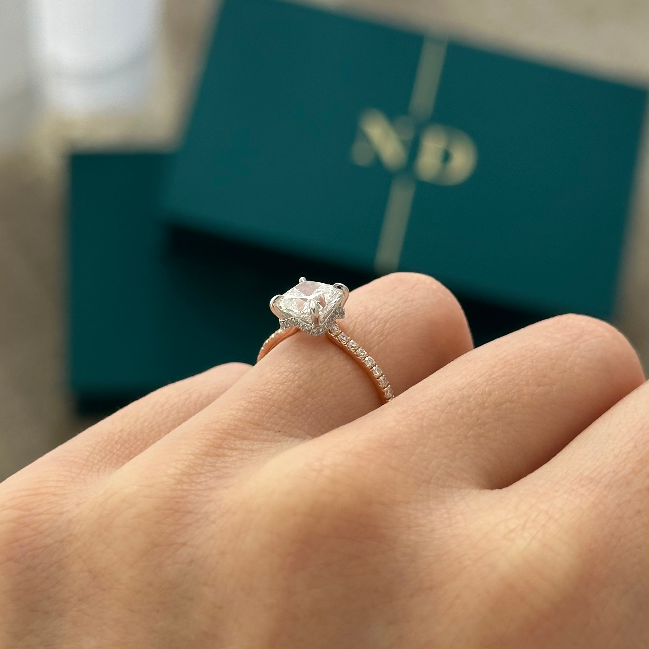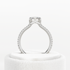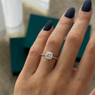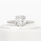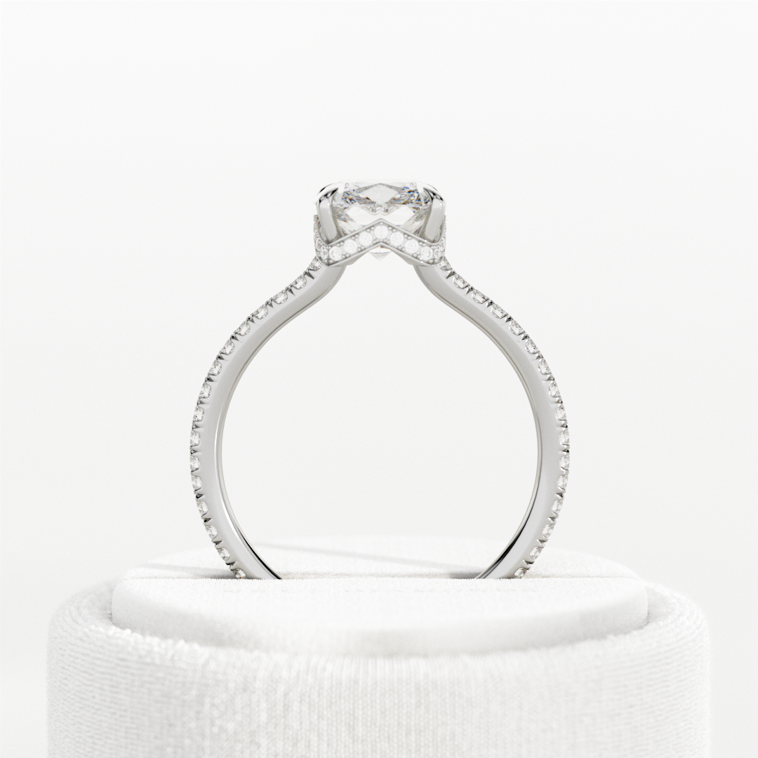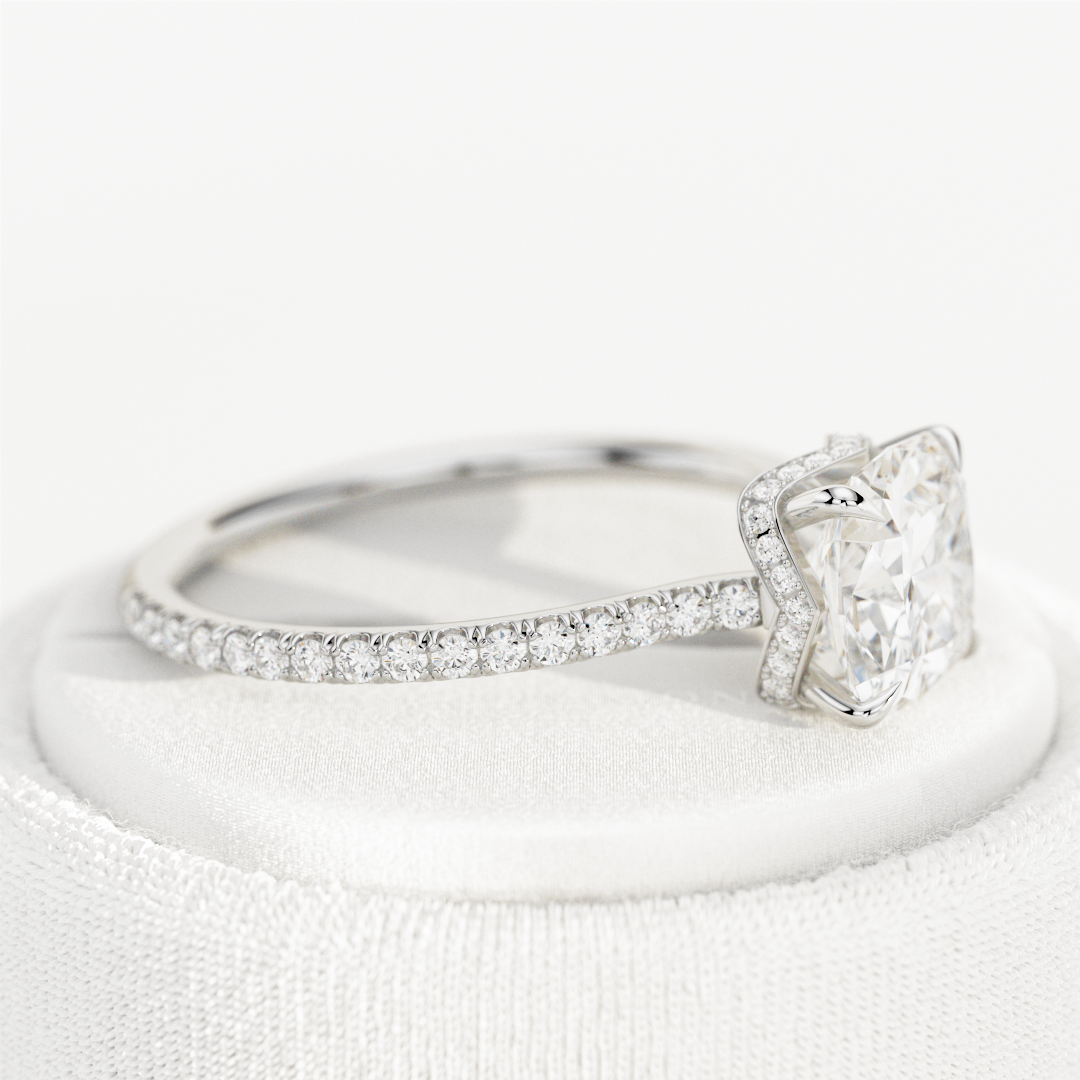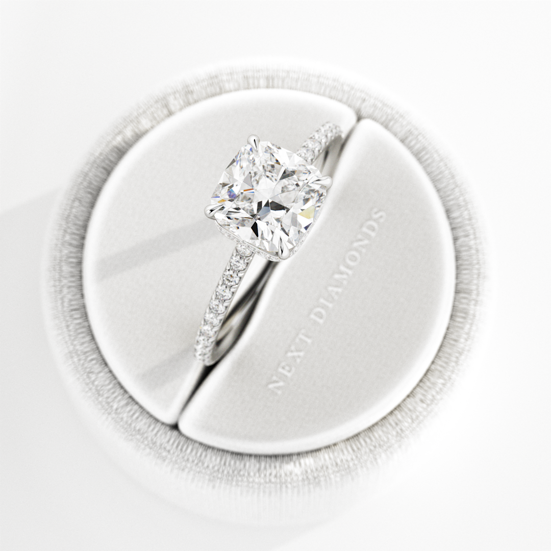 This stunning engagement ring features a 1.5-carat cushion lab-grown diamond elegantly adorned with a special waved hidden halo. The un...