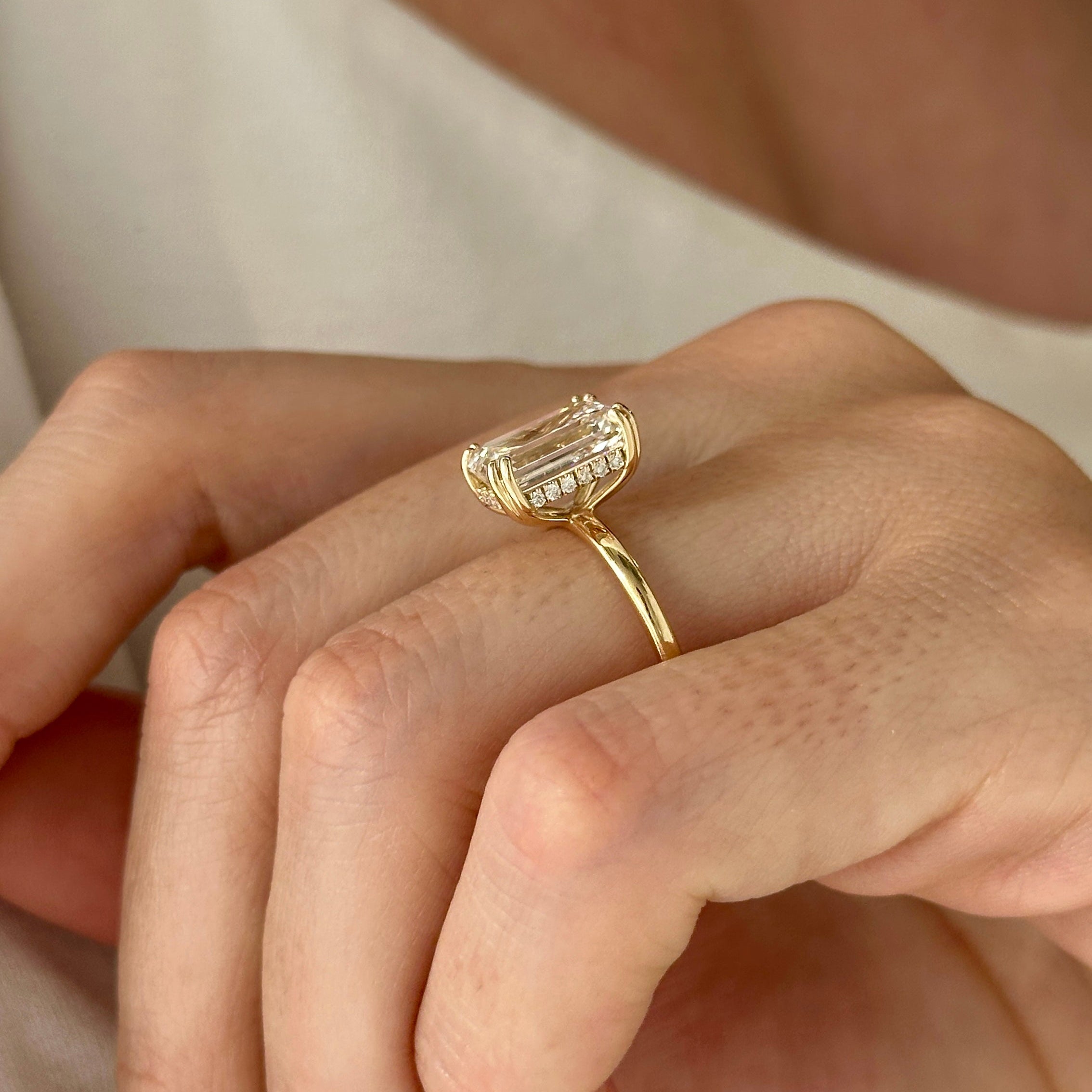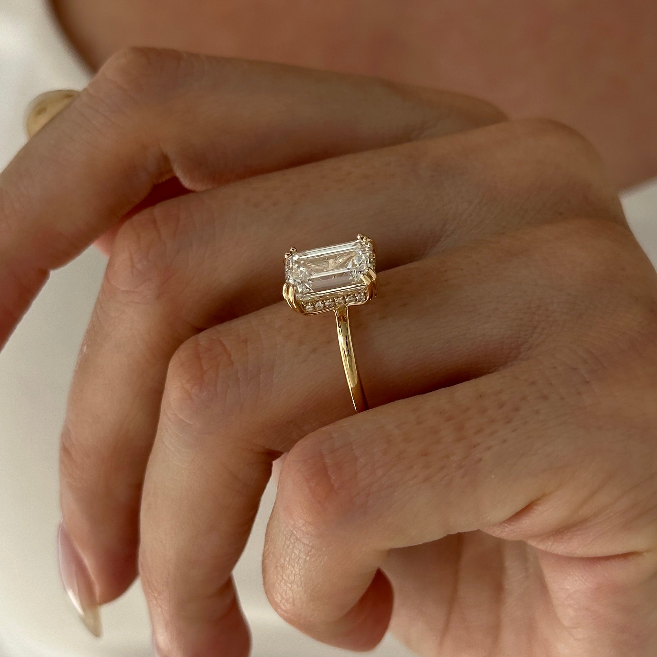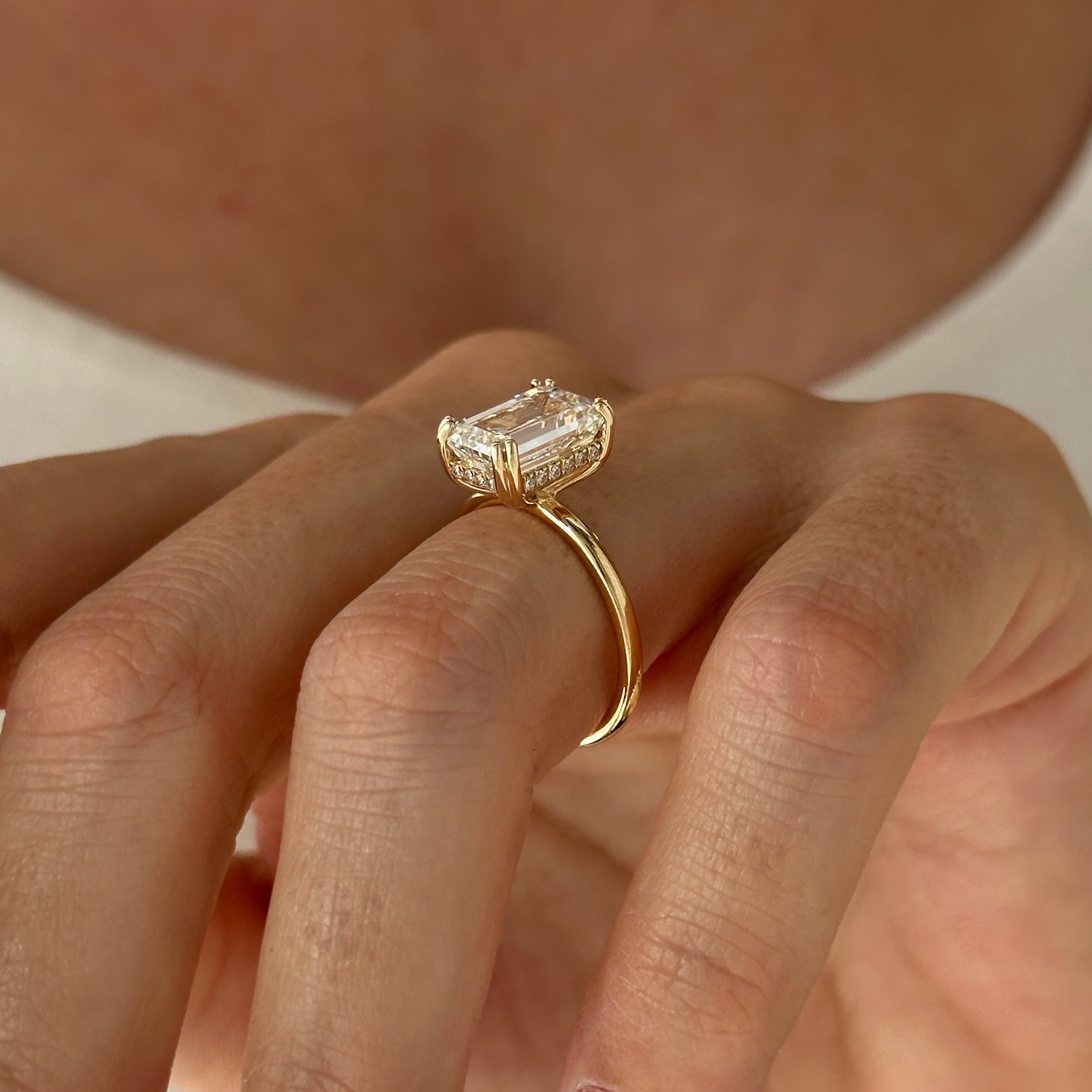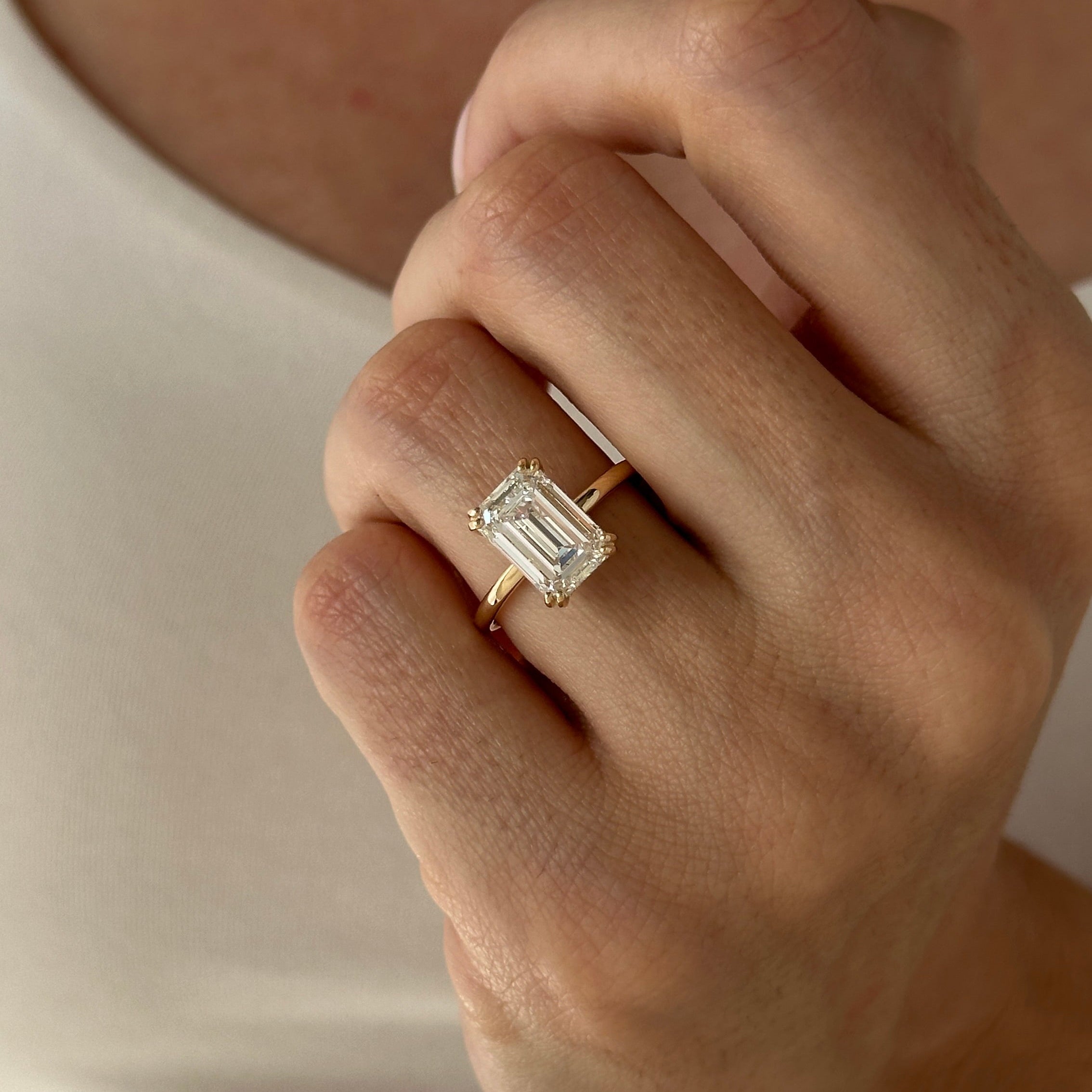 A dazzling 4 carat emerald cut diamond, sparkling like a star in the night sky, held in place by a gorgeous double prong setting that adds an extra touch of glamor to the already stunning piece of jewelry. a delicate hidden halo enhances the diamond's beauty and adds an ethereal glow to the ring's overall design, making it a true masterpiece that will leave everyone mesmerized. It's not just an engagement ring, it's a symbol of love and a statement of style that will make your heart skip a beat every time you look at it.