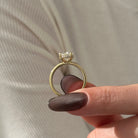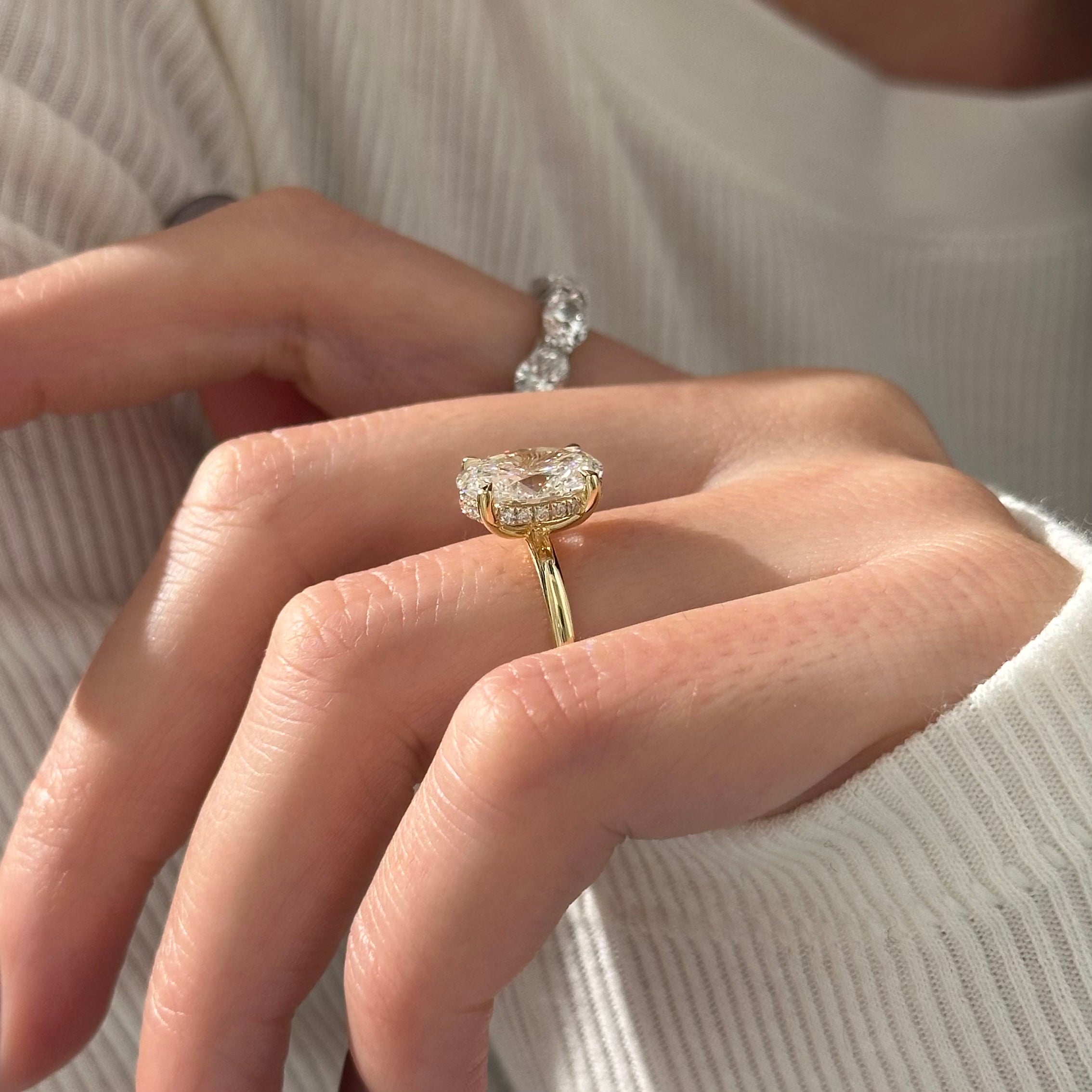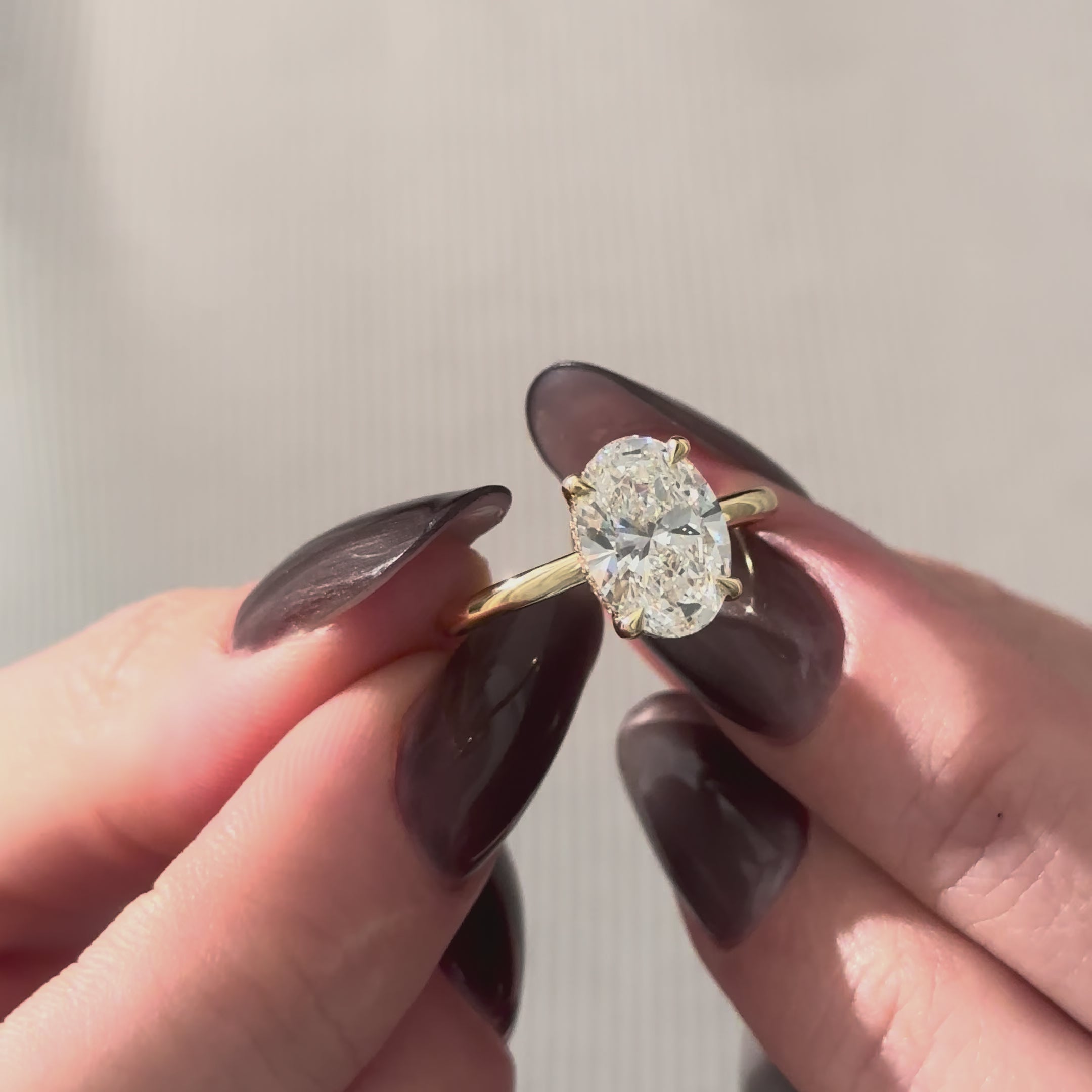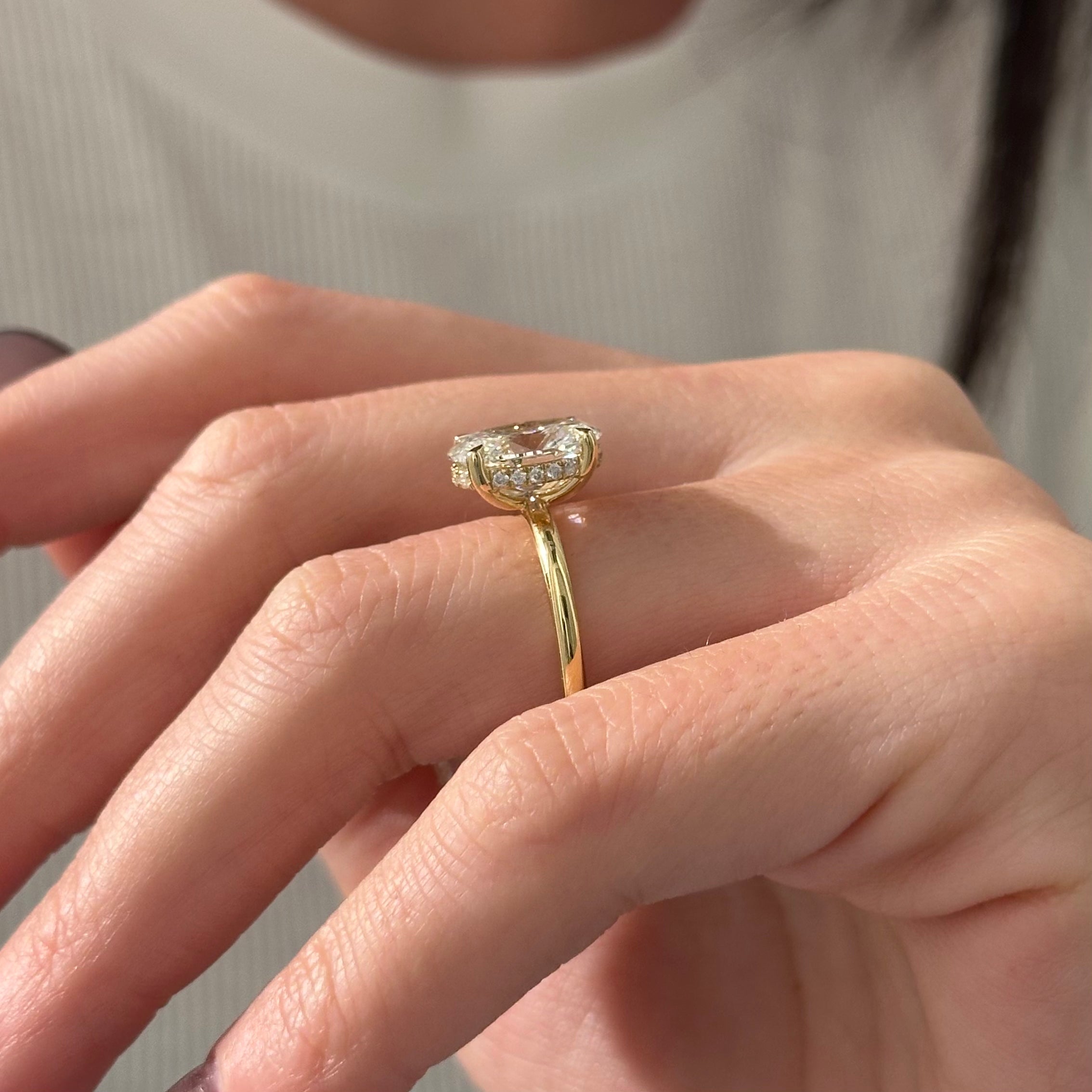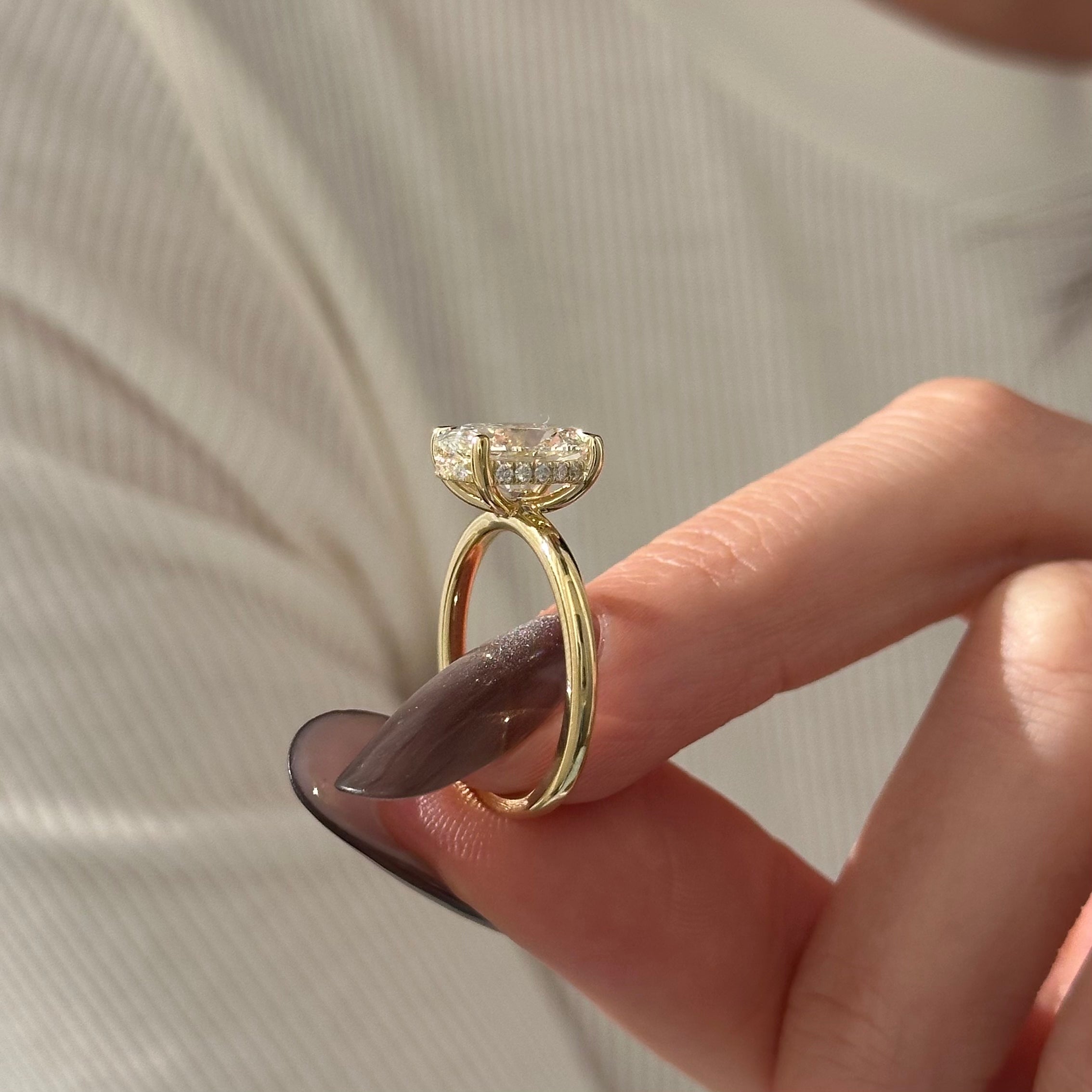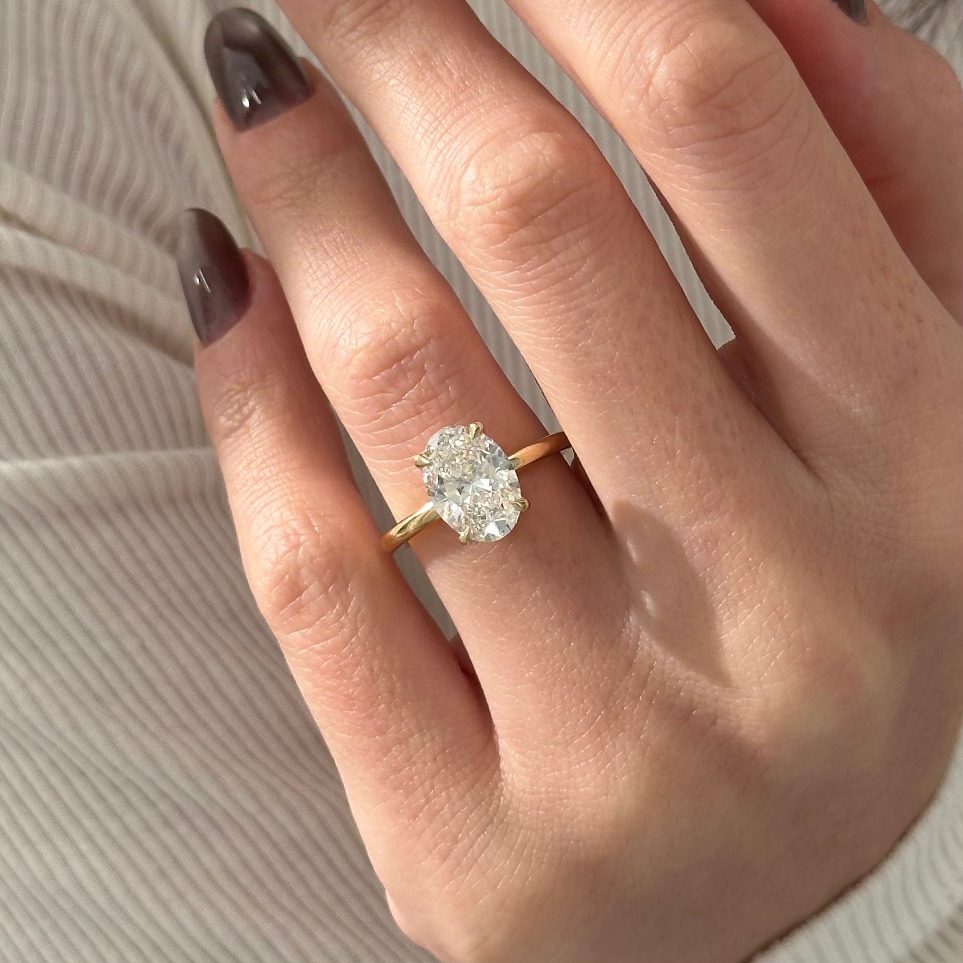 Presenting an exquisite 3-carat oval lab-grown diamond ring, gracefully cradled by four claw prongs. Its minimalist design exudes a contemporary charm, while a subtle hidden halo adds a touch of delicate sophistication. Meticulously crafted, this captivating piece embodies refined elegance, making it a timeless symbol of beauty and style.