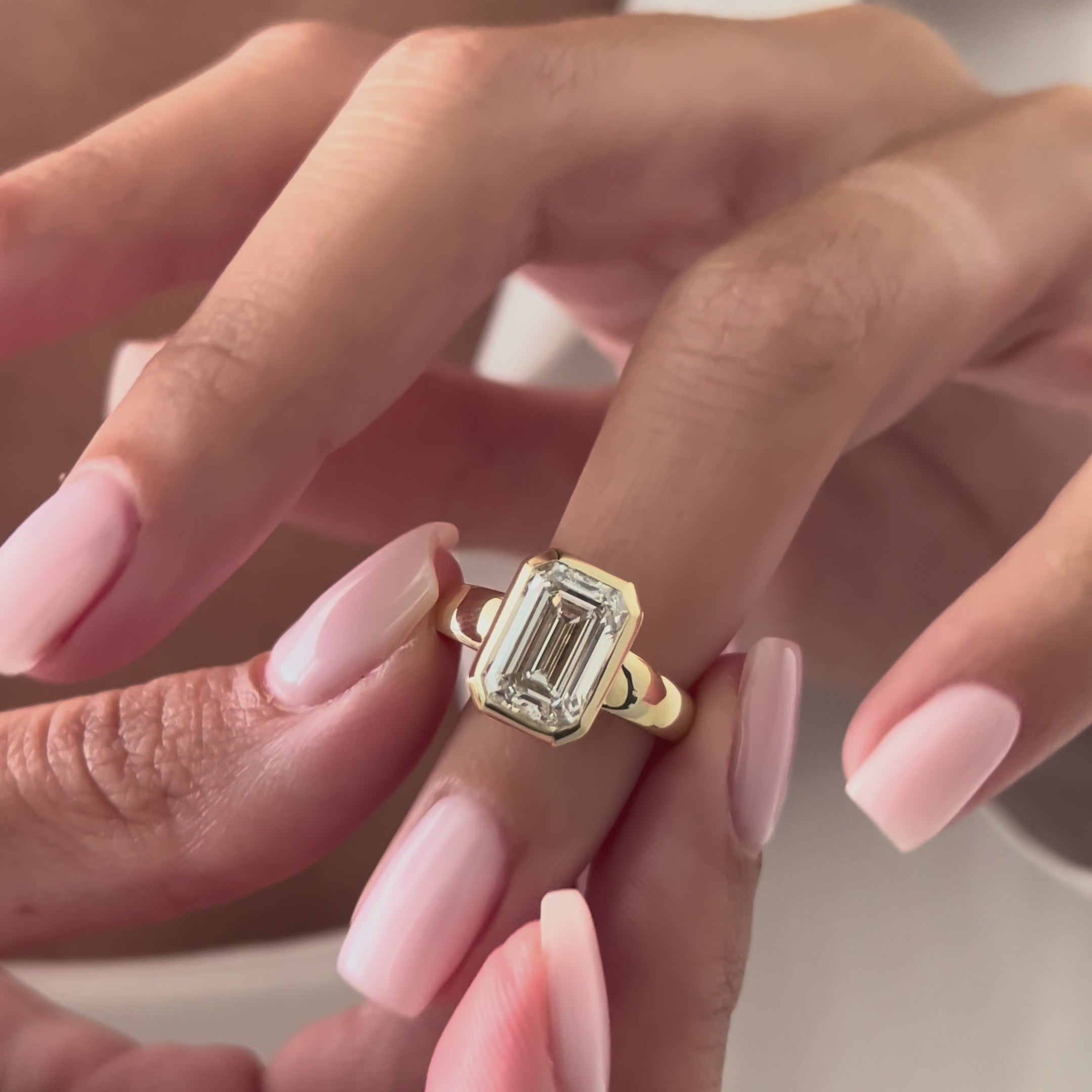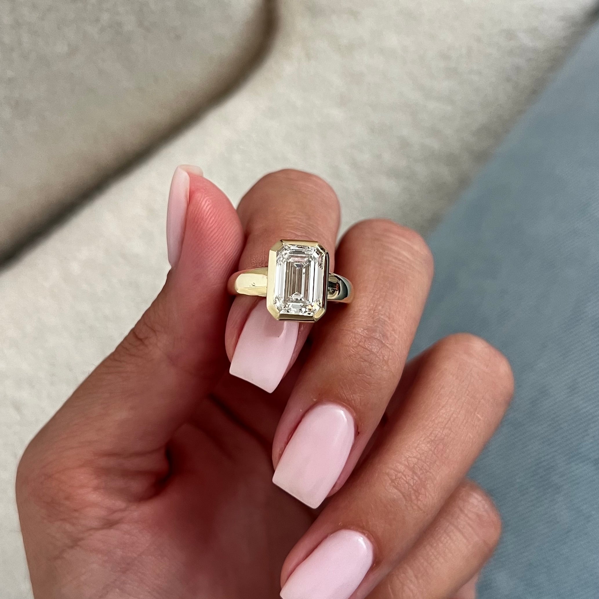 A stunning 3-carat emerald-cut diamond sits in a sleek bezel setting, showcasing clean lines and a modern, refined style. The design al...