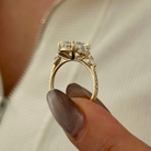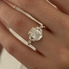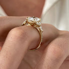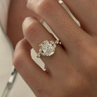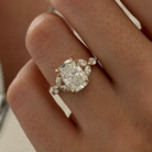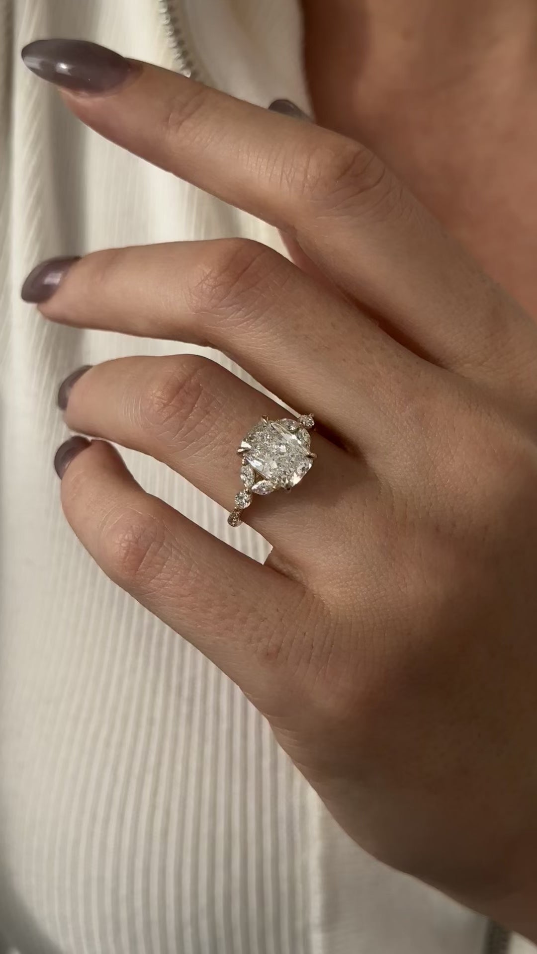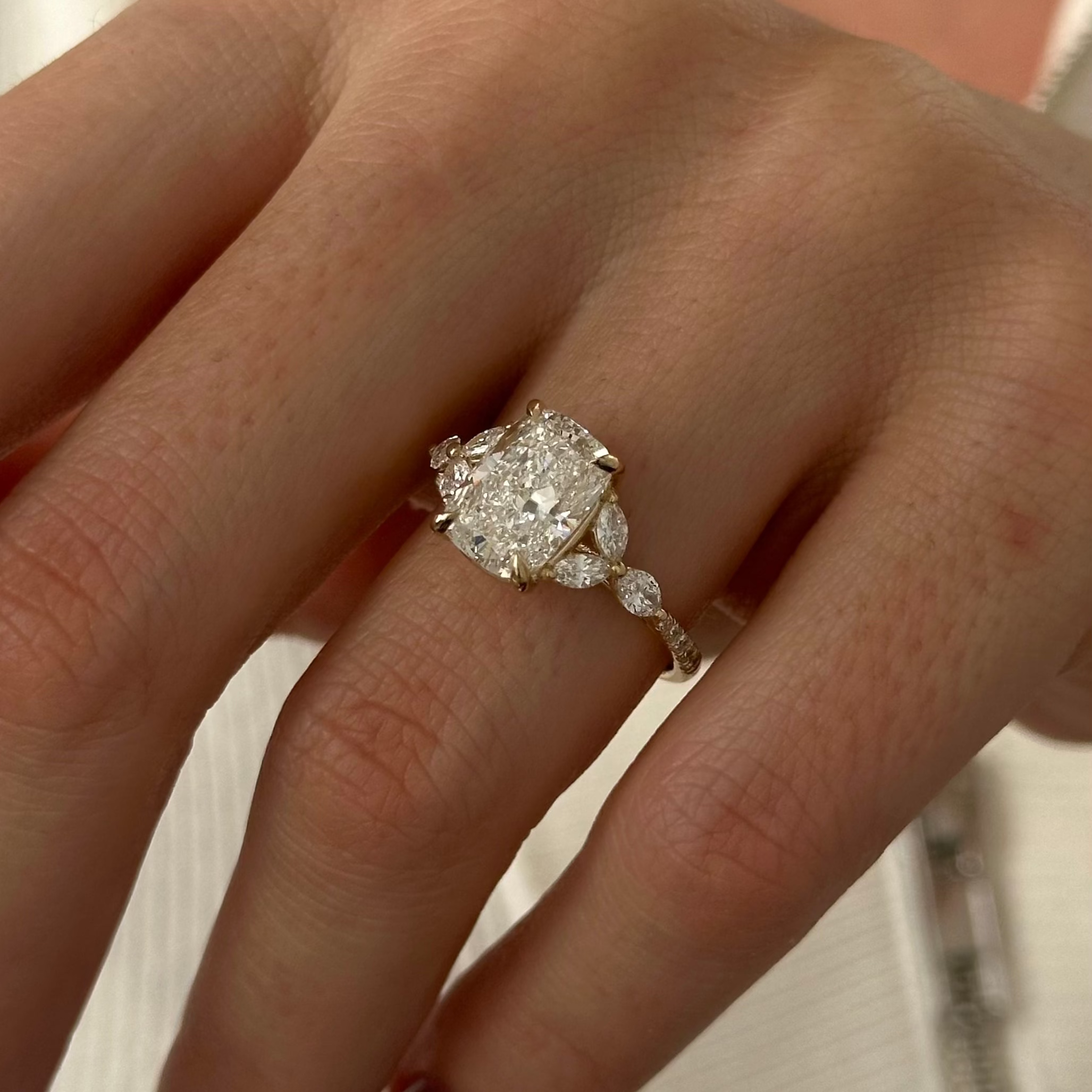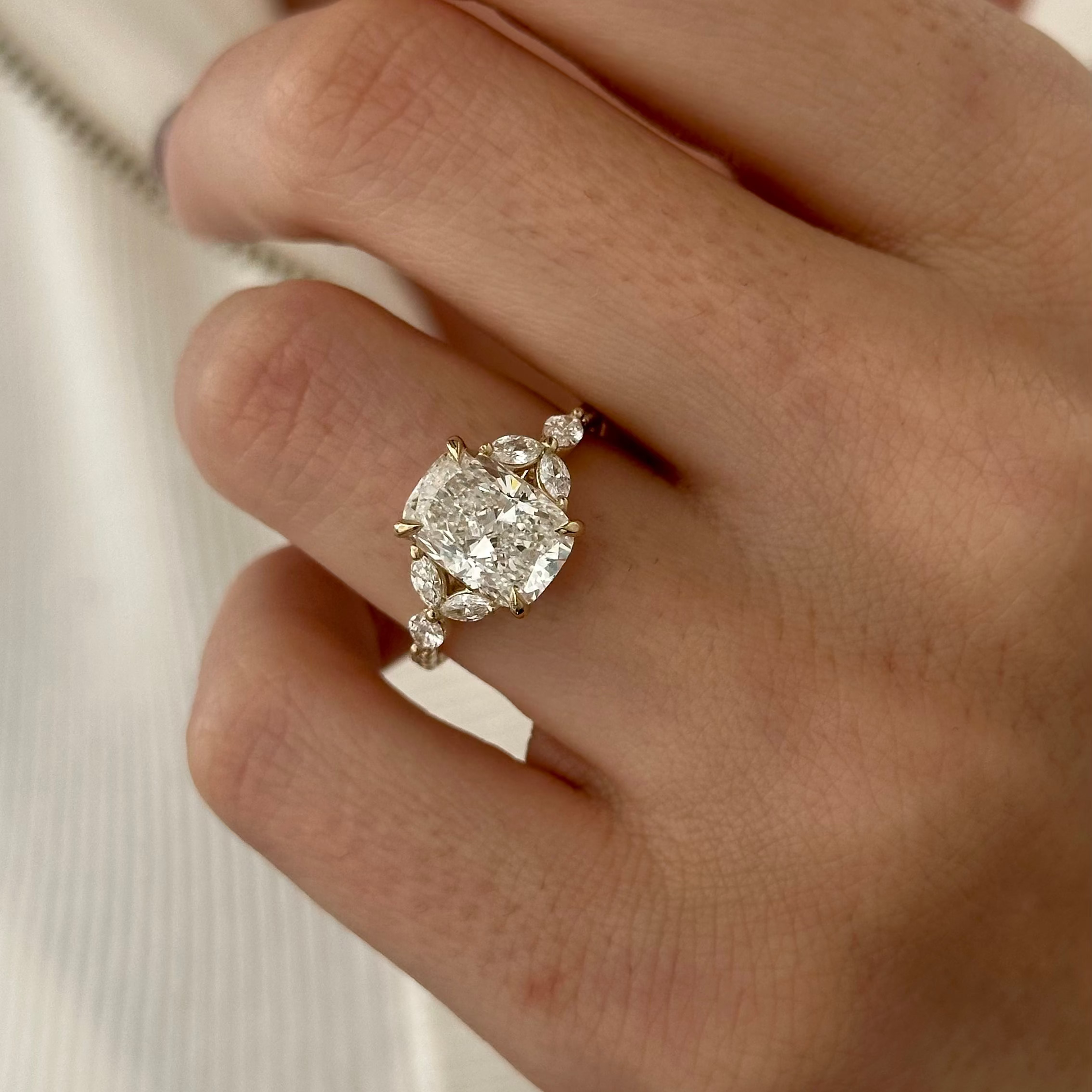 A stunning 3-carat elongated cushion cut lab-grown diamond is set in a nature-inspired engagement ring, featuring marquise and round si...