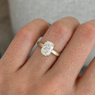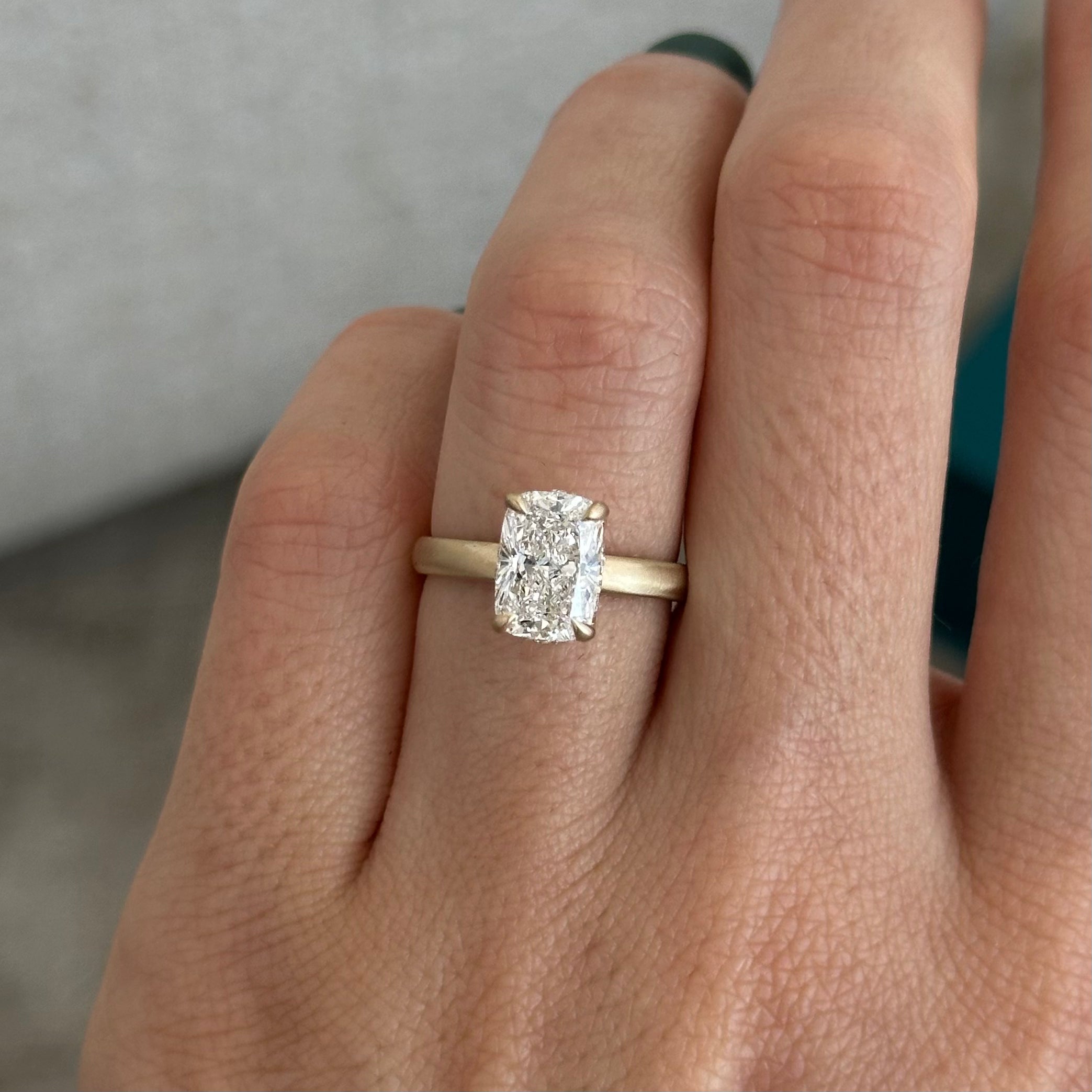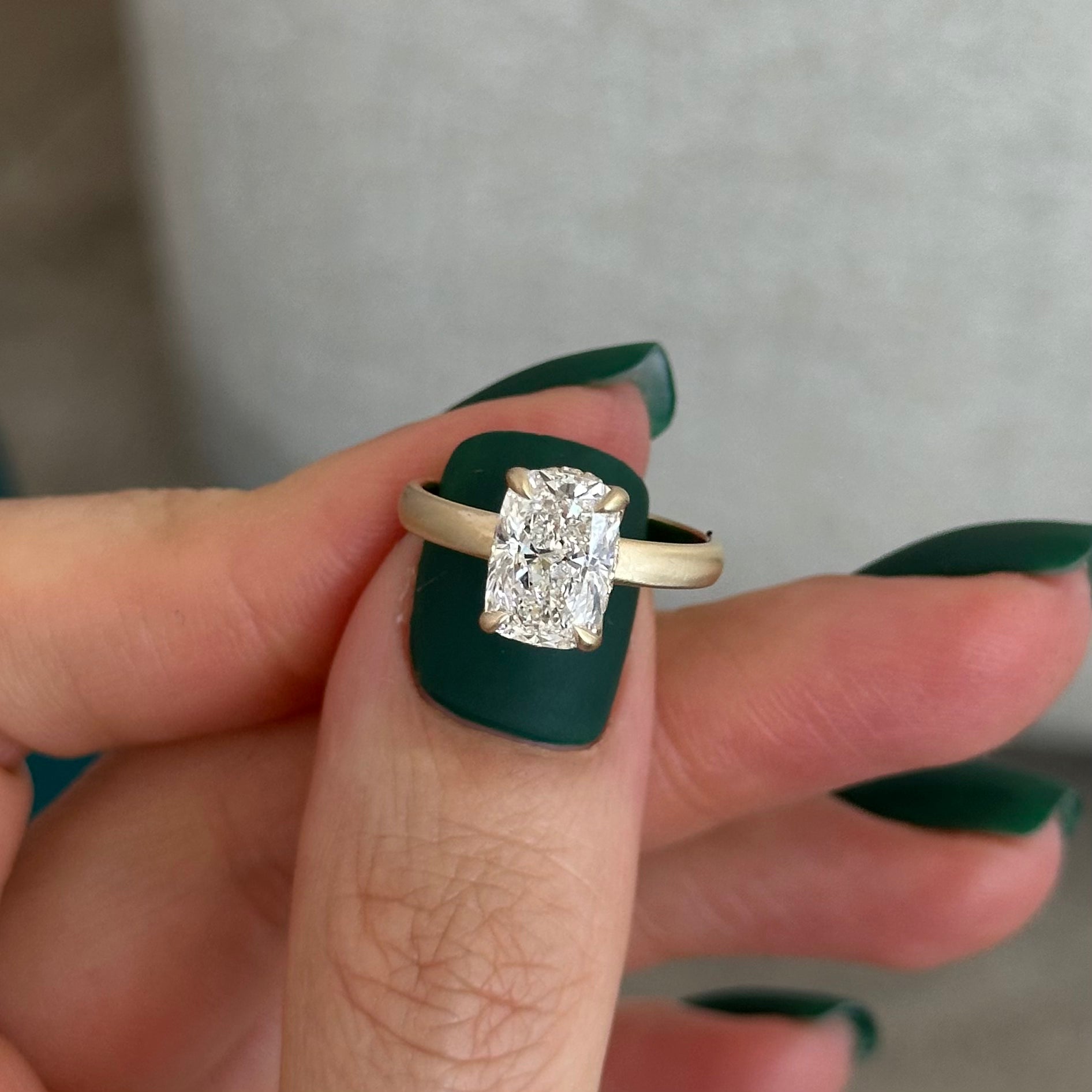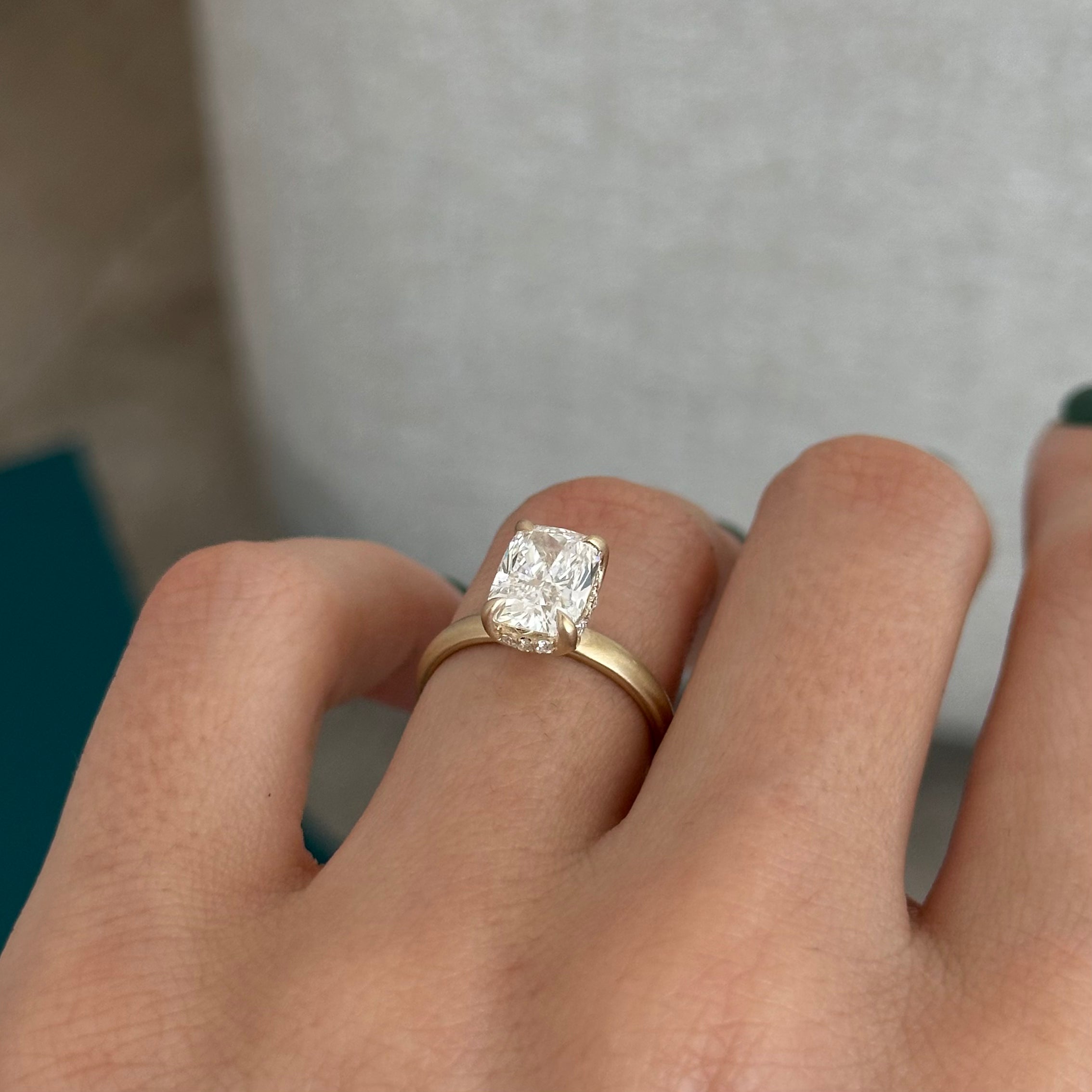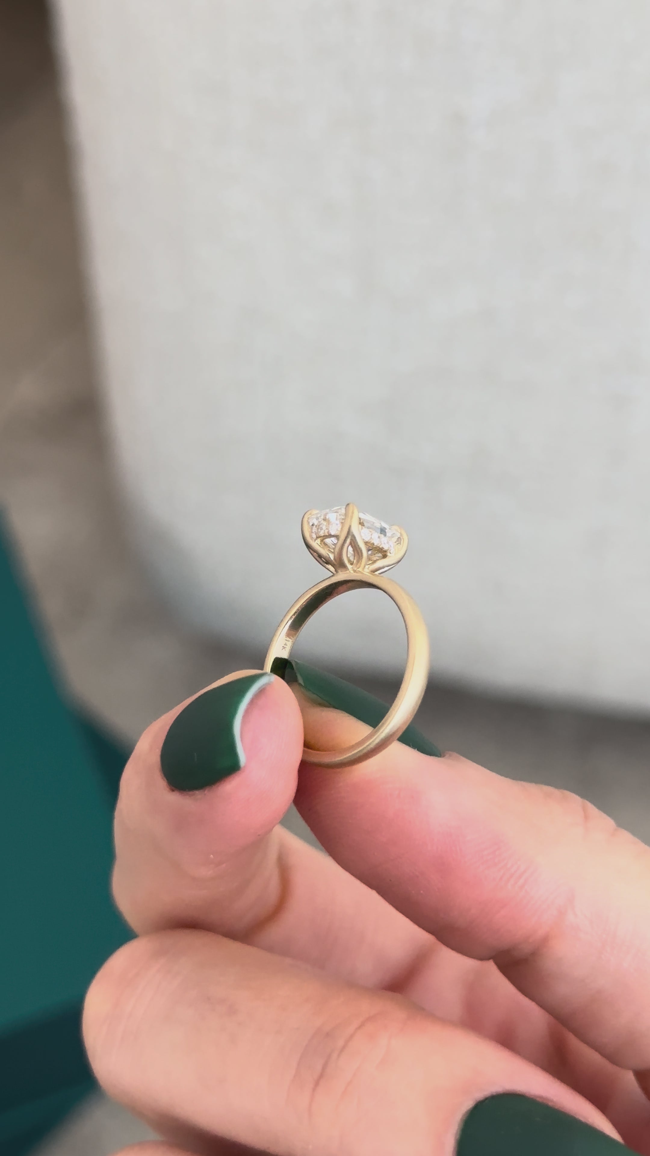 The exquisite 2-carat elongated cushion lab-grown diamond ring features prongs designed in a delicate lotus flower pattern, adding a un...