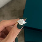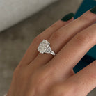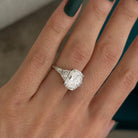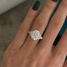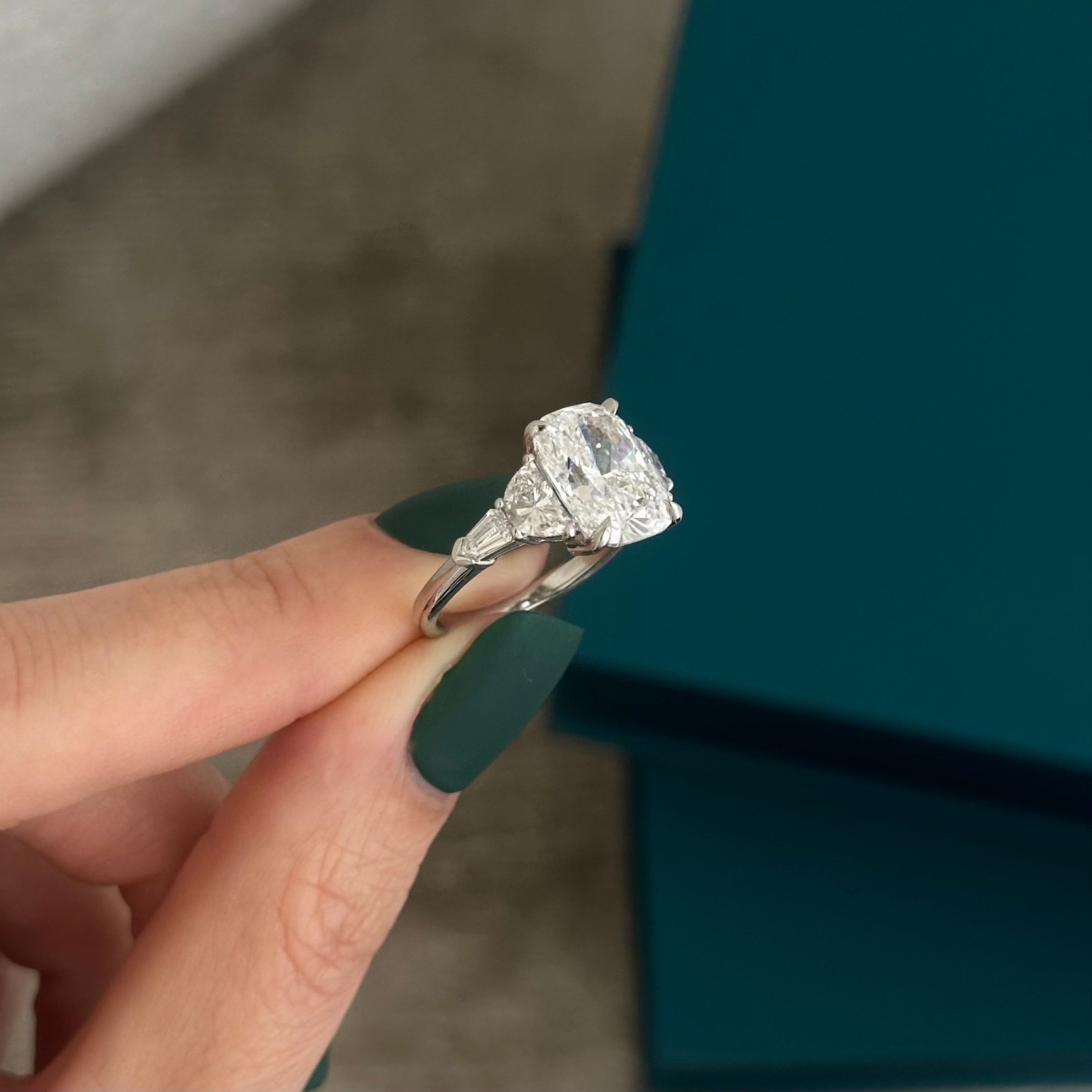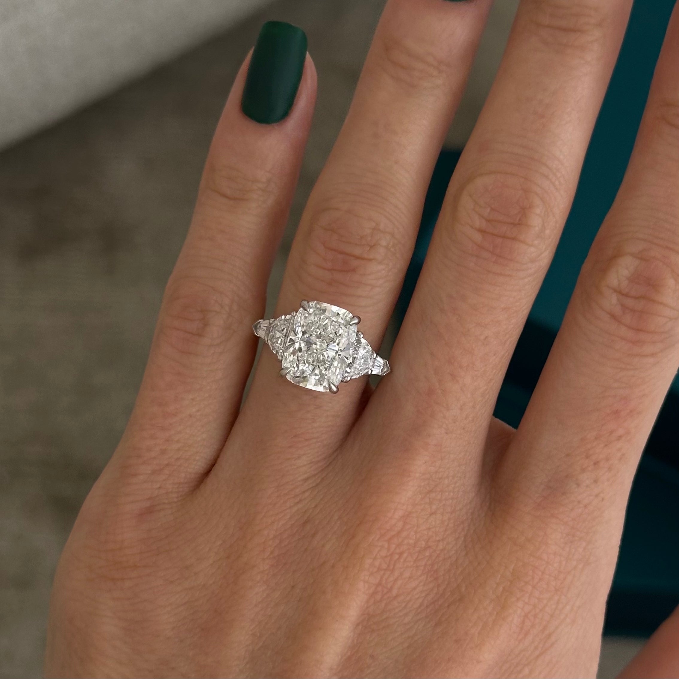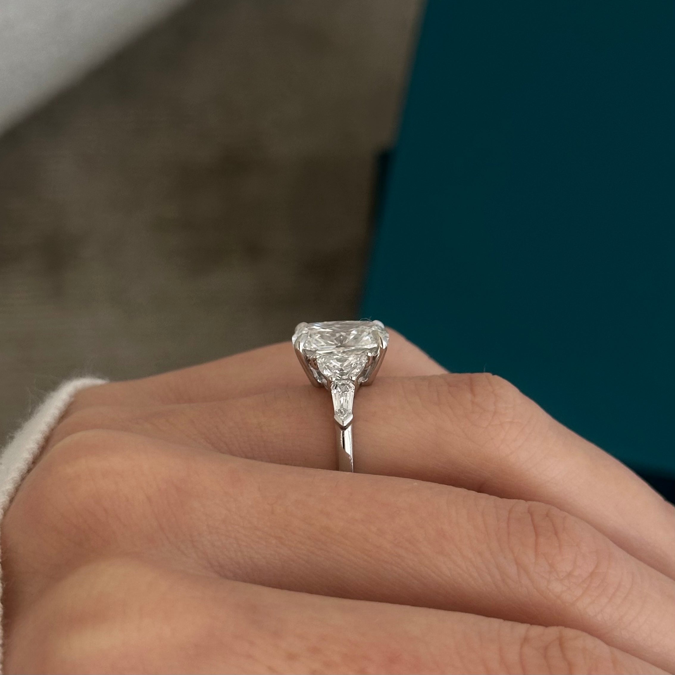This captivating ring showcases a 5 carat elongated cushion-cut lab-grown diamond, accented by 1 carat total of half-moon side stones a...