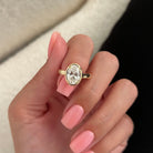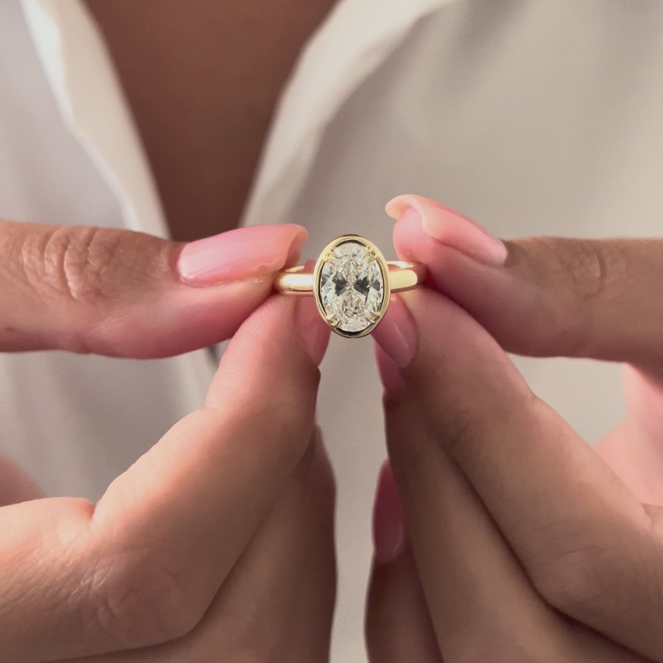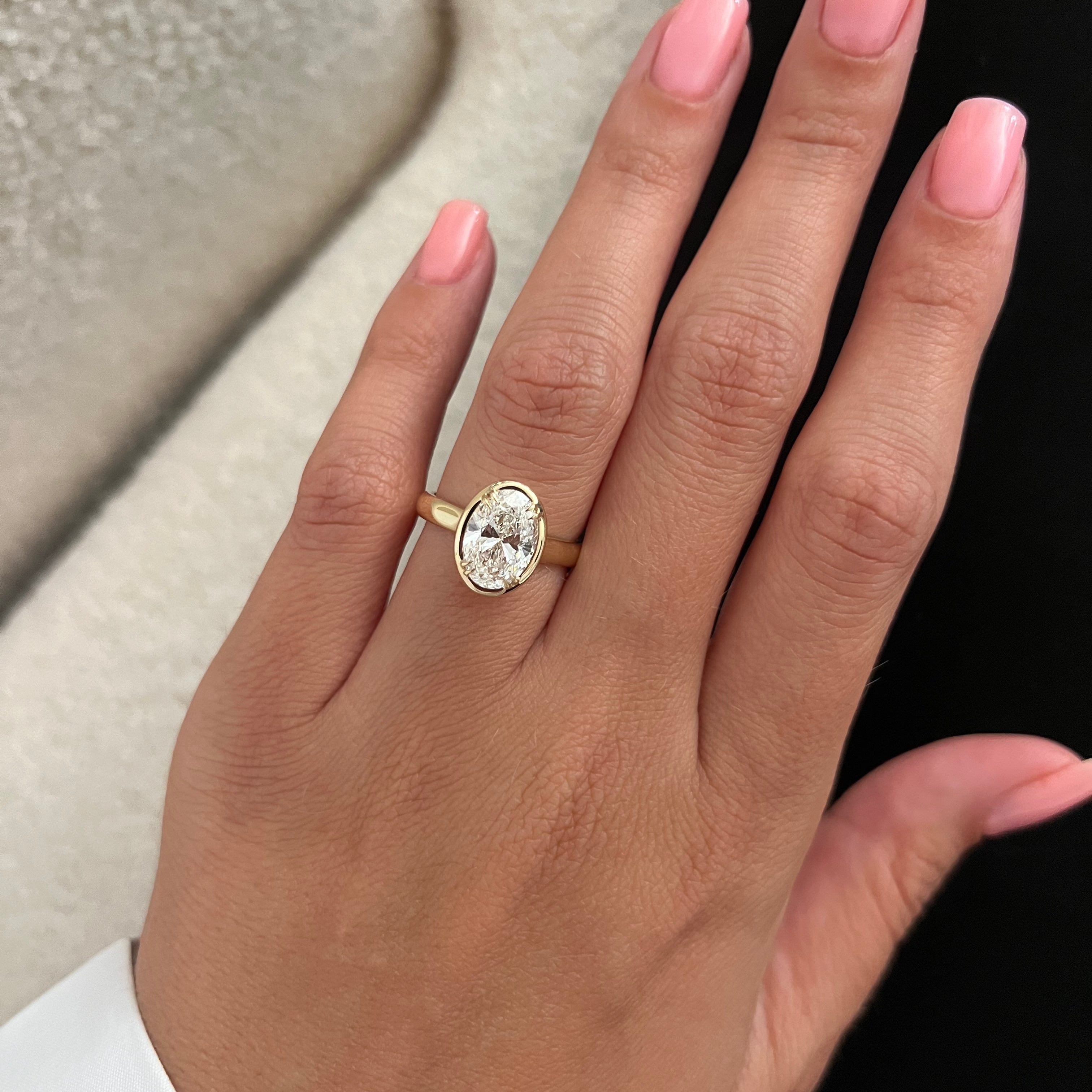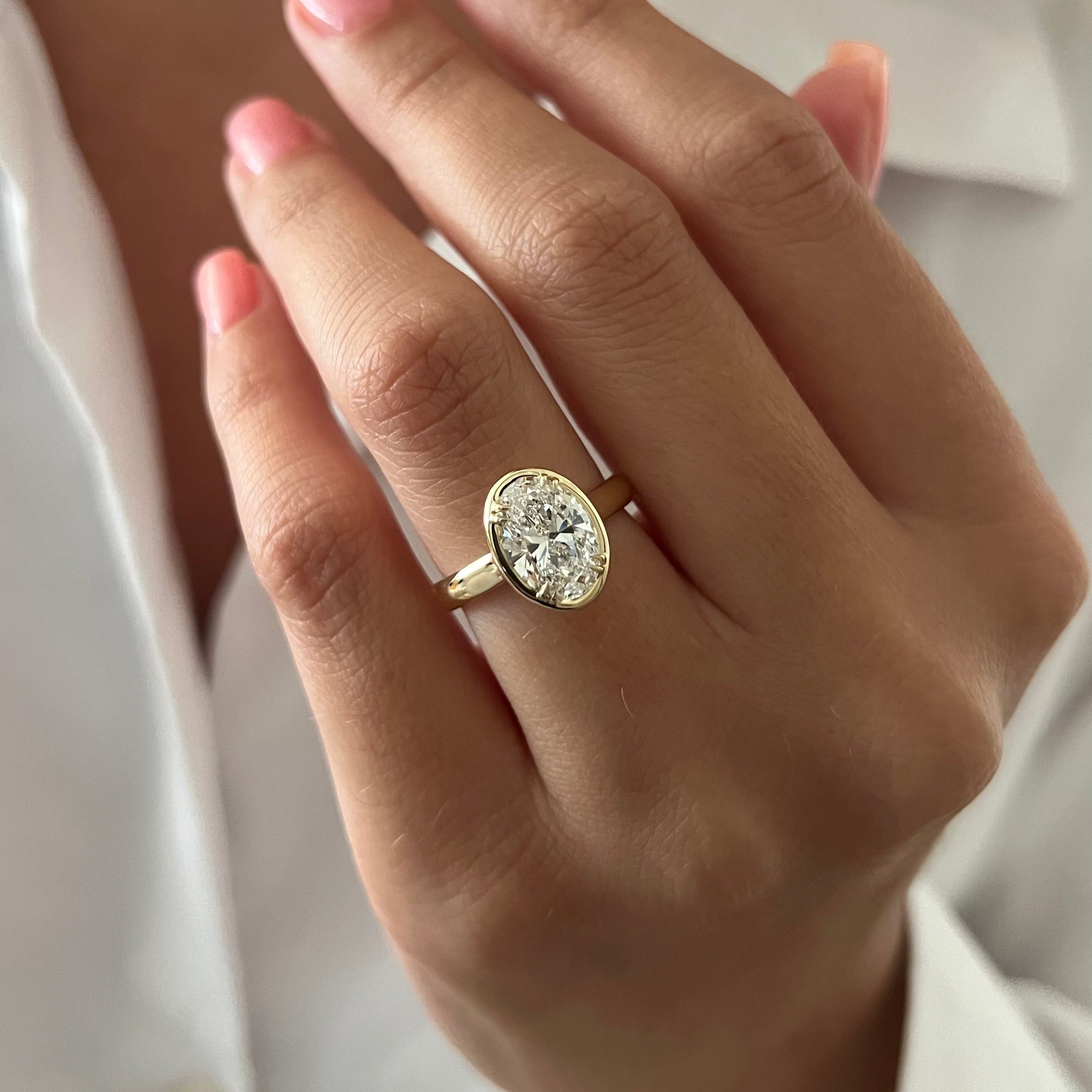 A stunning 3-carat oval-cut diamond sits in a sleek bezel setting, showcasing clean lines and a modern, refined style. The design allow...