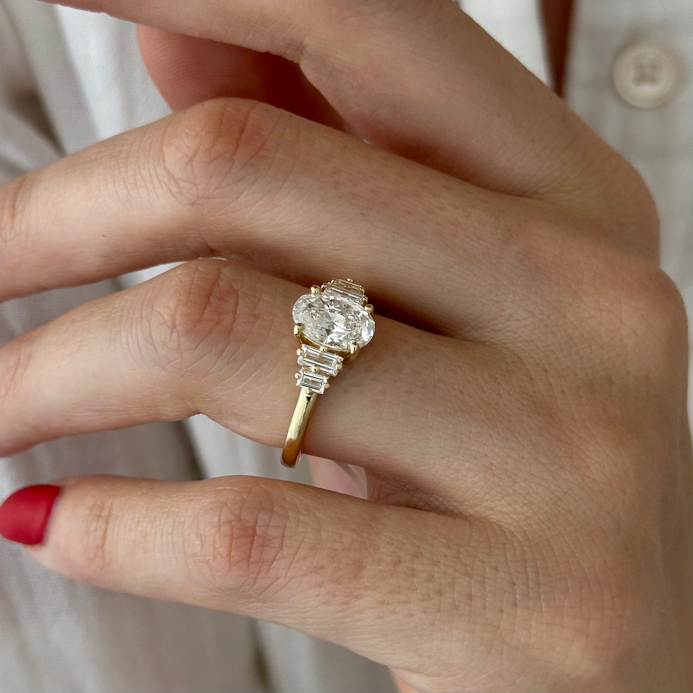 An exquisite engagement ring showcasing a captivating 2-carat oval lab-grown diamond, delicately set in four prongs. Complementing the ...