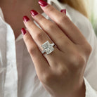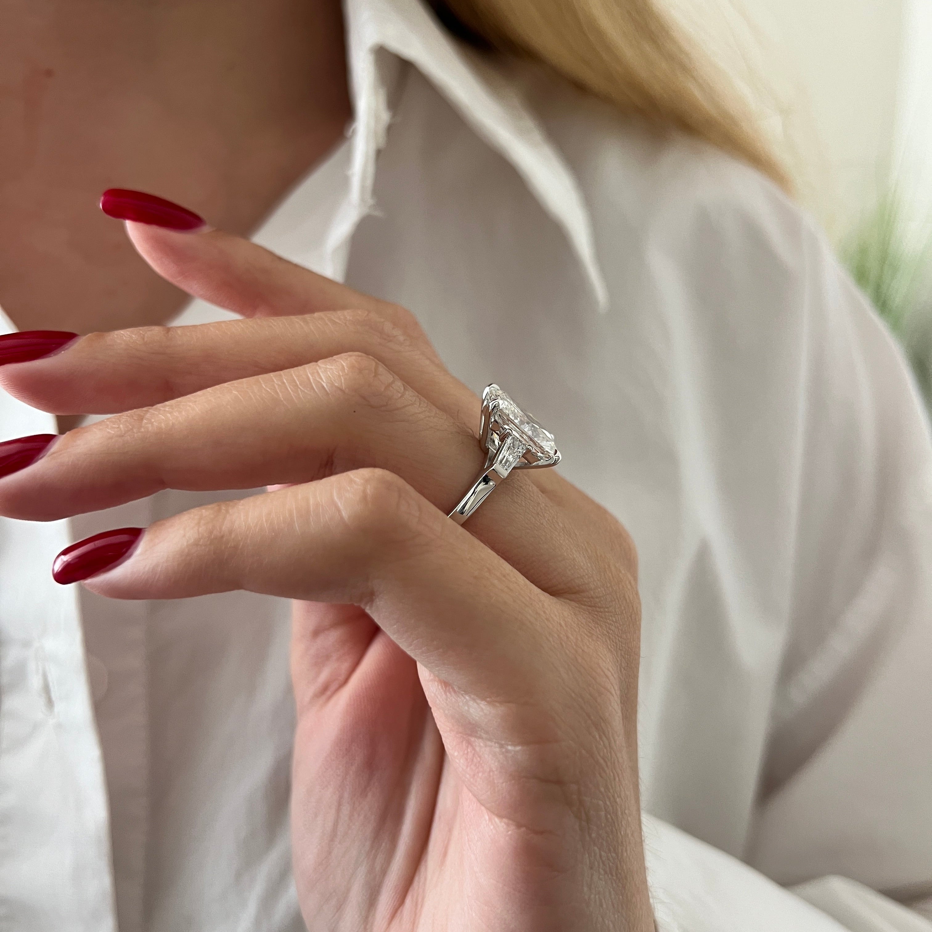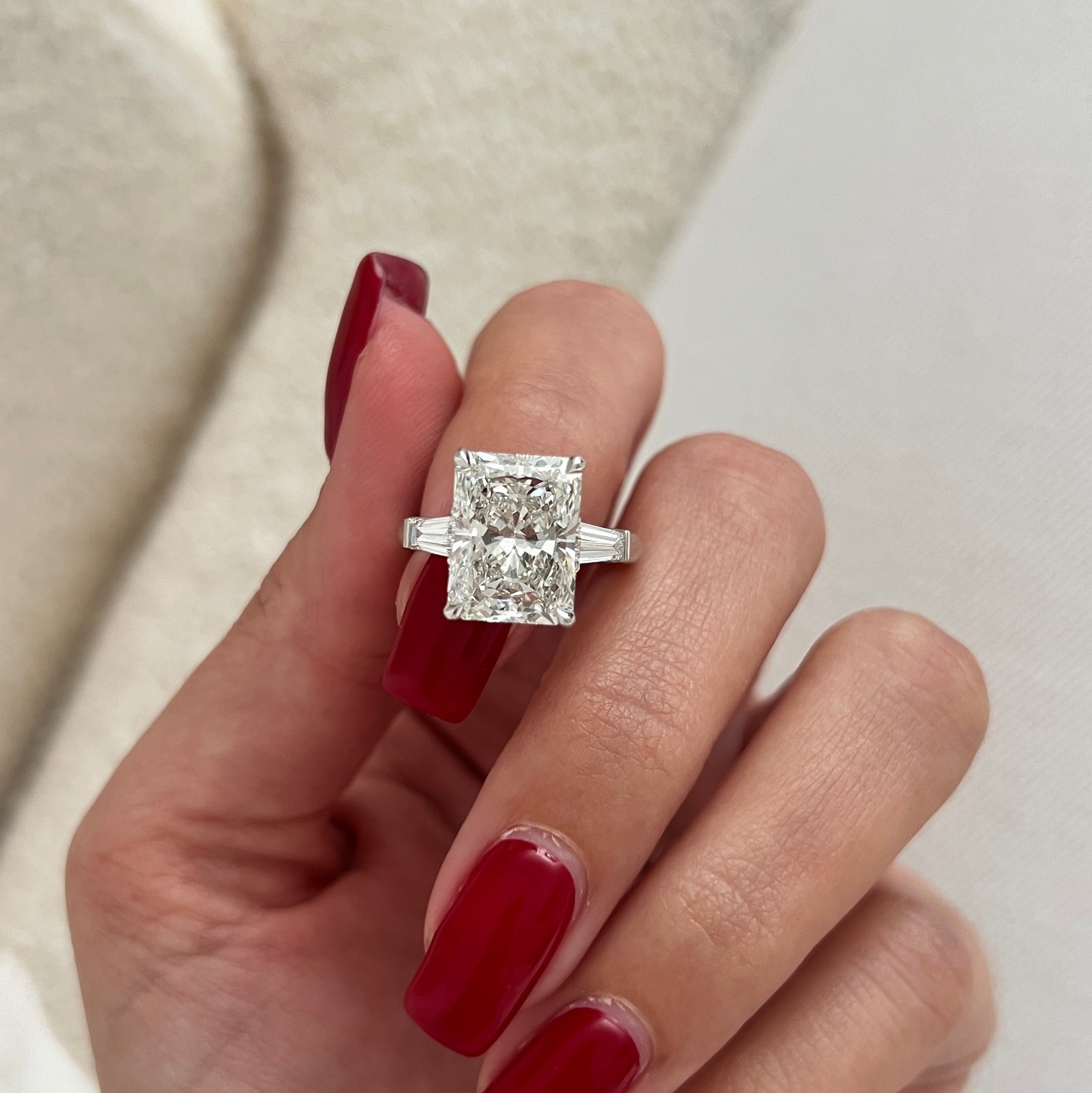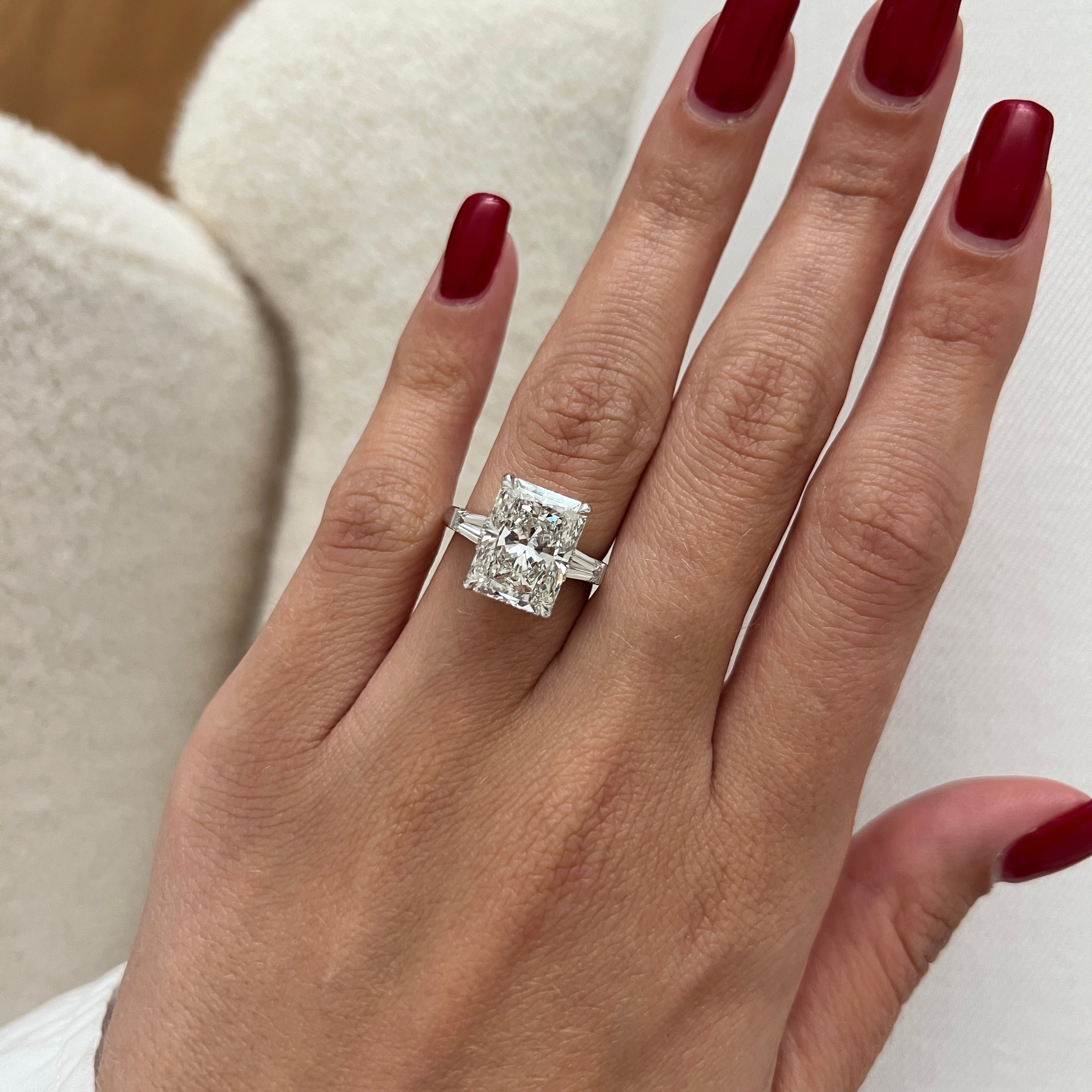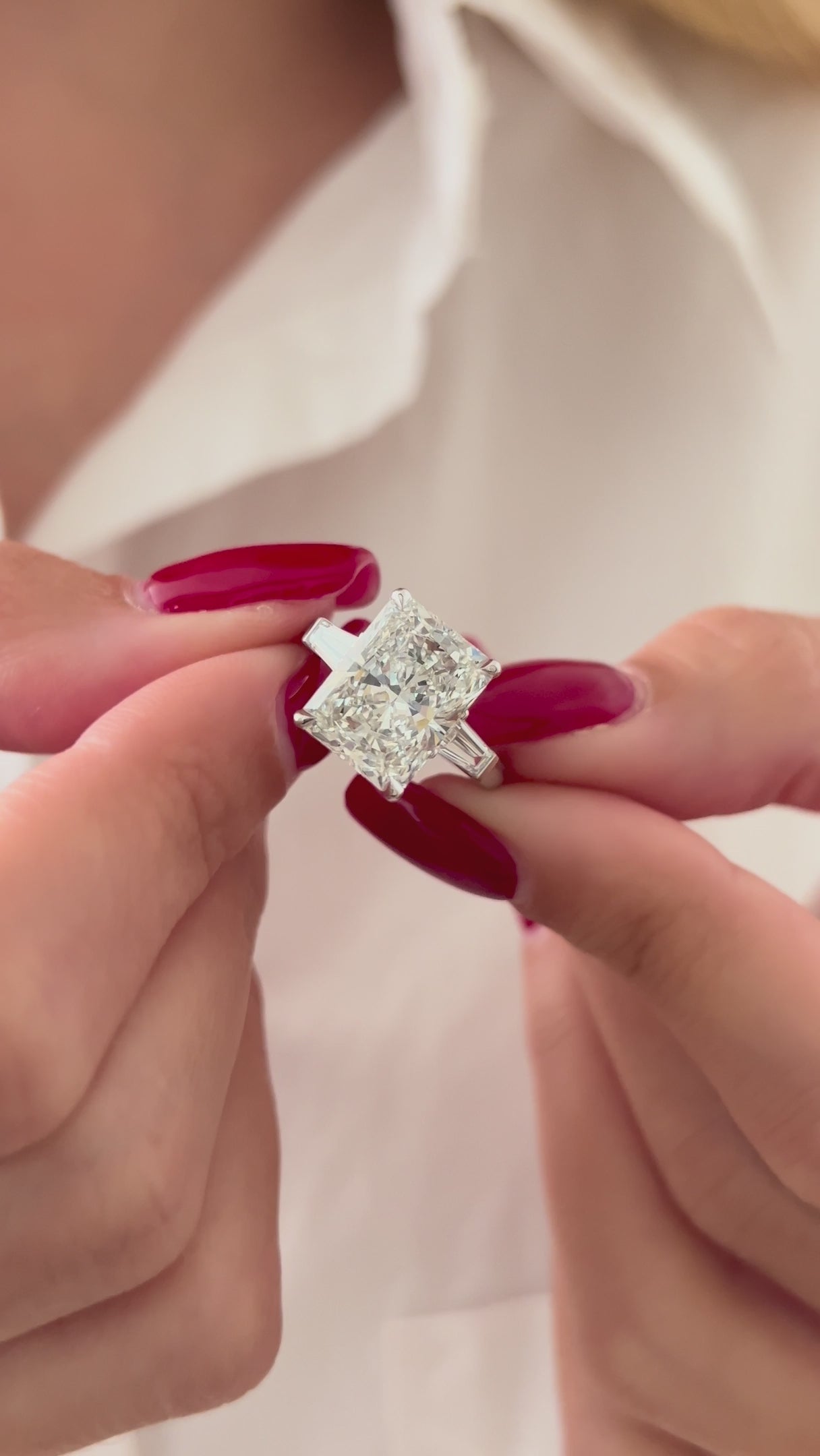 A stunning three-stone ring, designed for maximum comfort, features a remarkable 4-carat radiant-cut lab-grown diamond as its centerpie...
