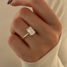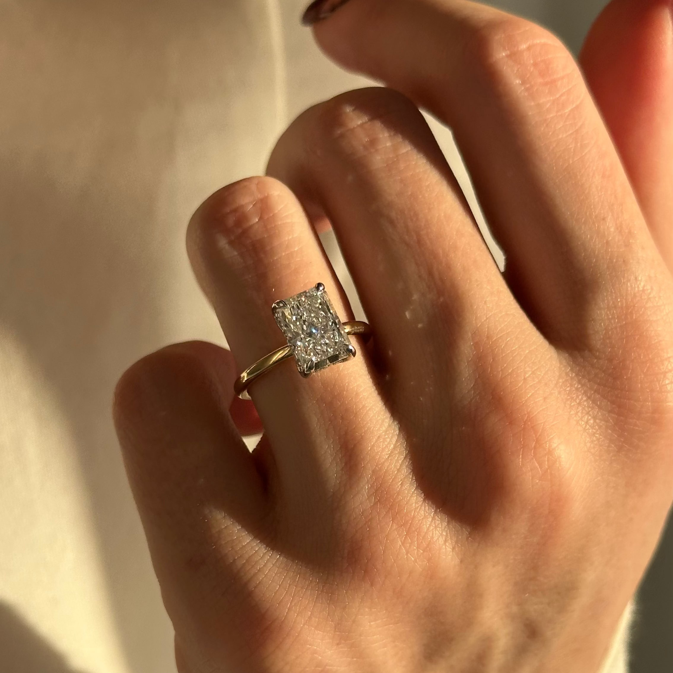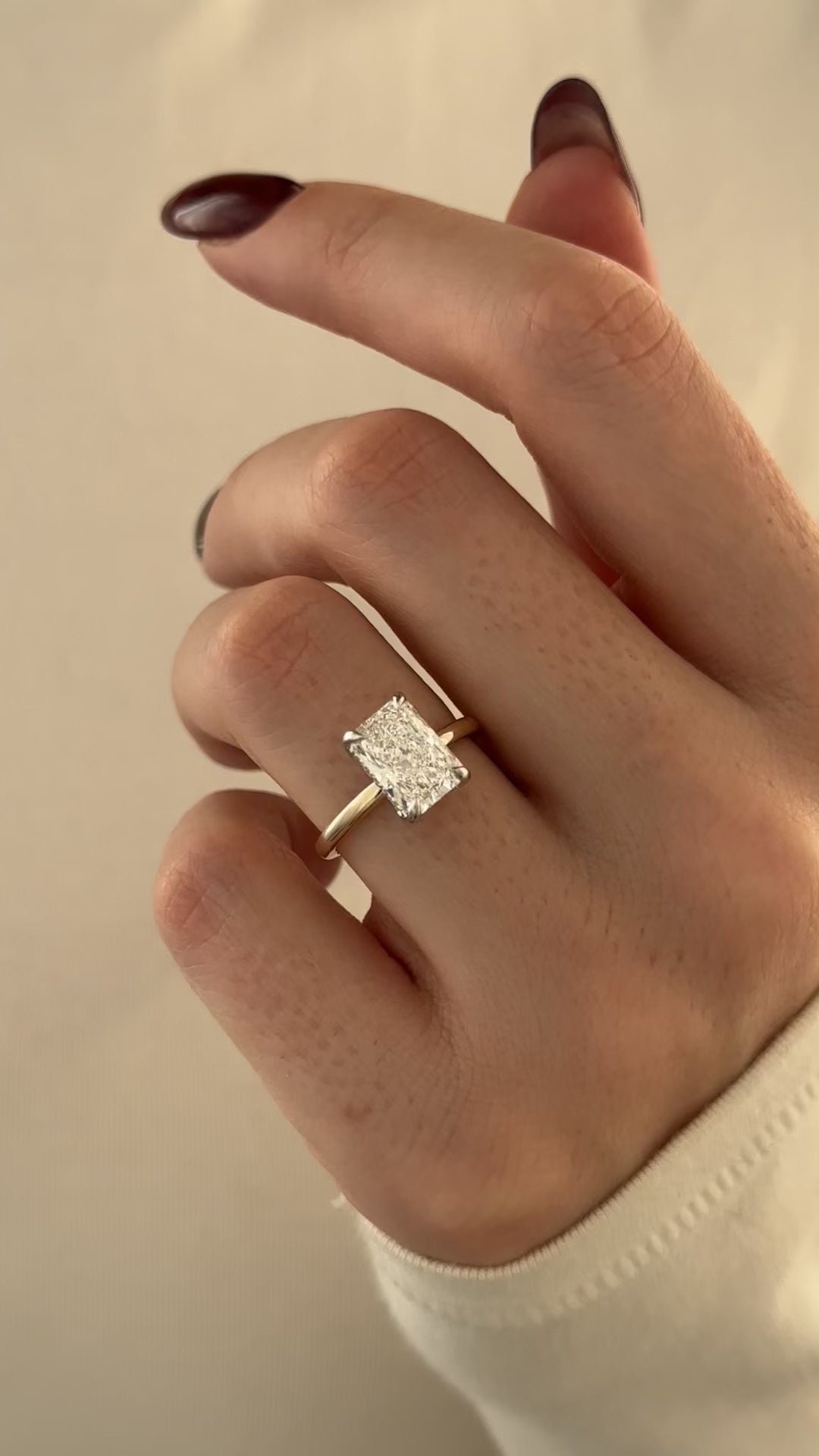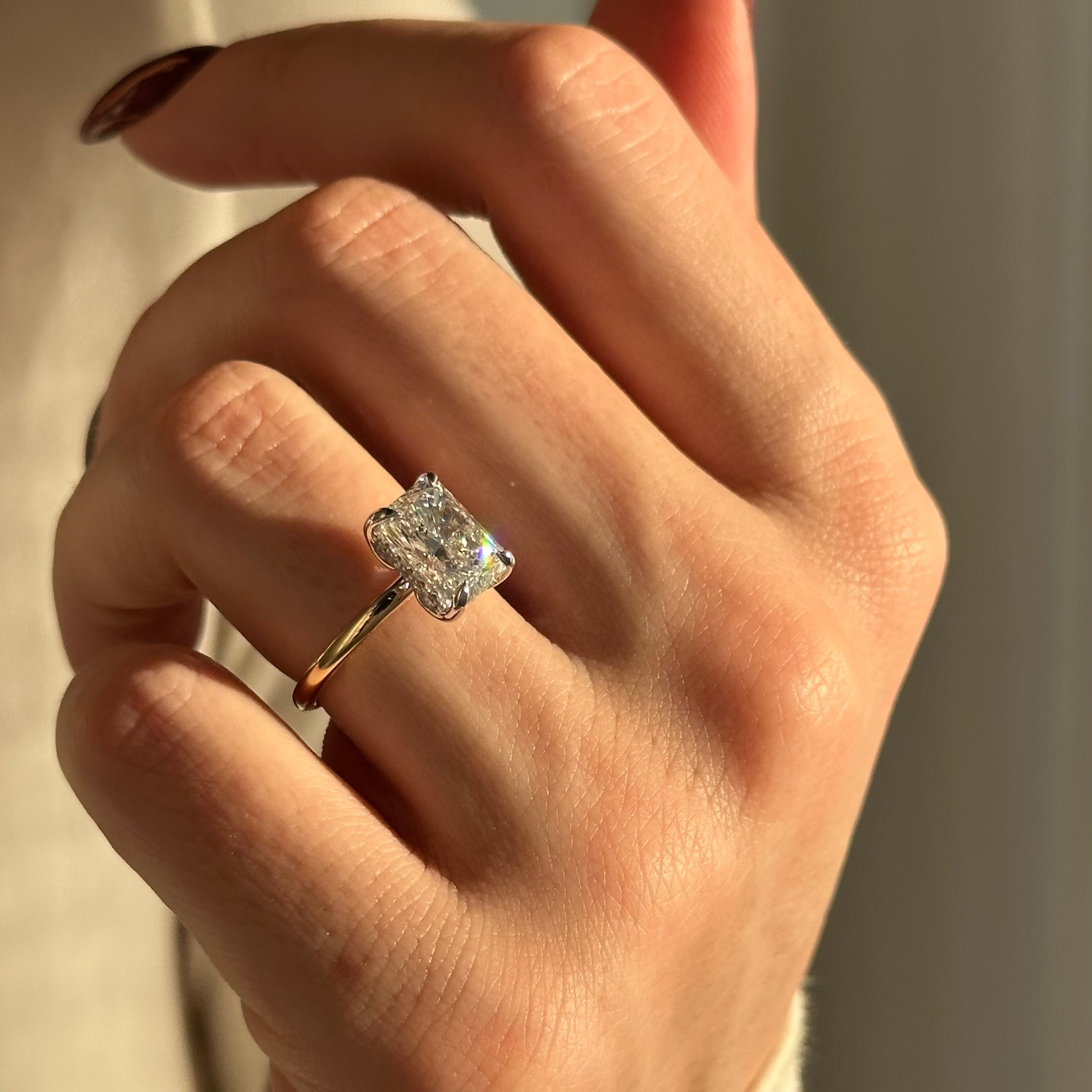The exquisite 2.5-carat radiant cut lab-grown diamond ring features prongs designed in a delicate lotus flower pattern, adding a unique...