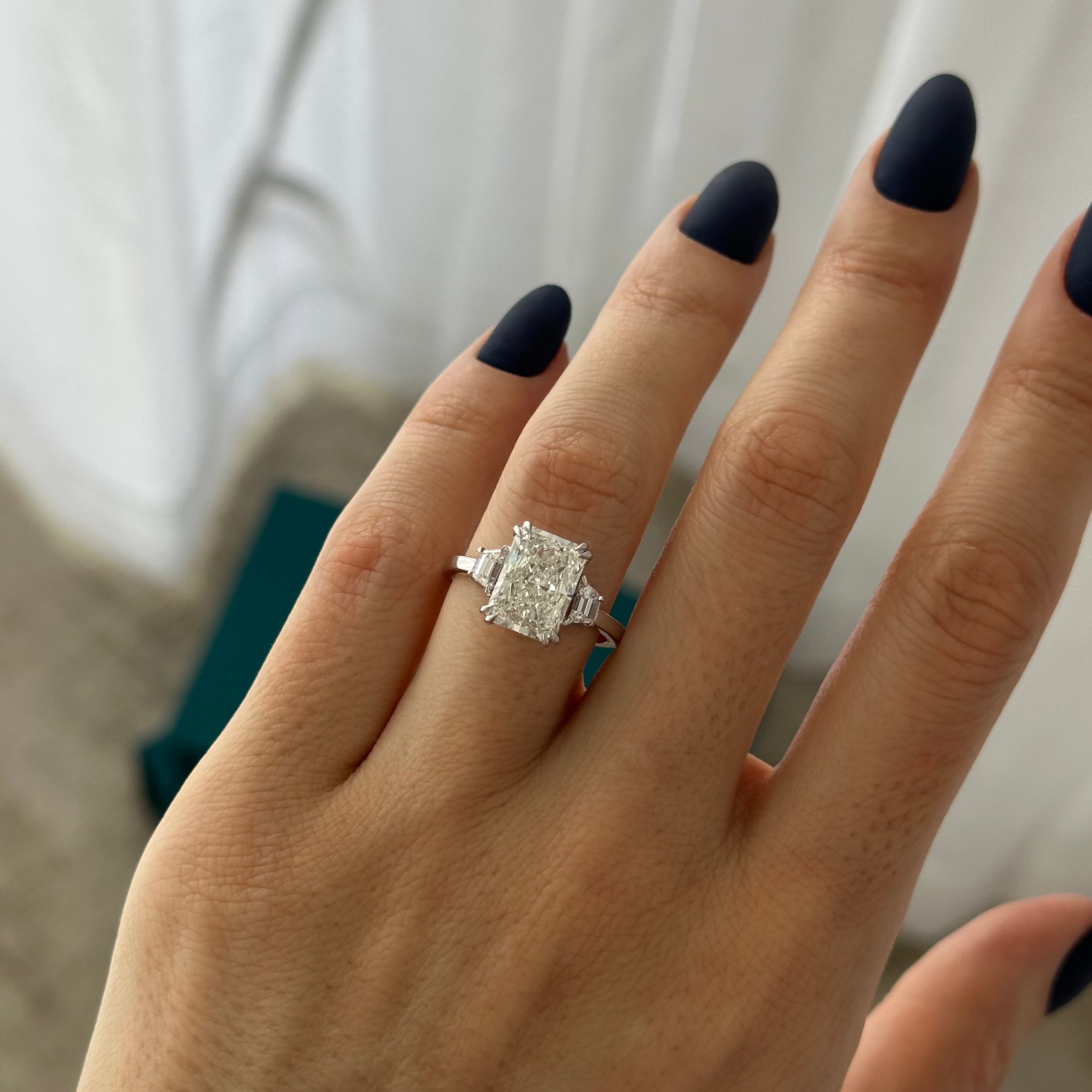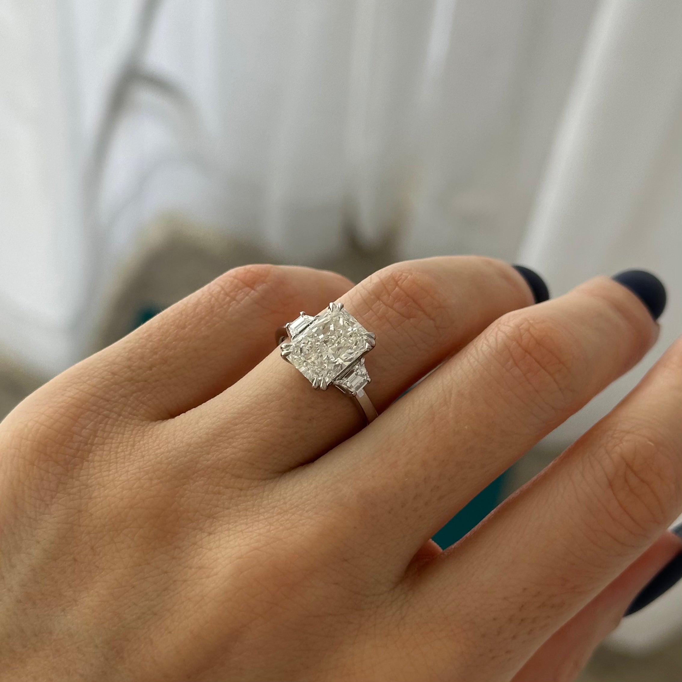 An outstanding three-stone ring features a total carat weight of 4.0, with a stunning 3.5-carat lab-grown diamond in a radiant cut as t...