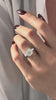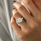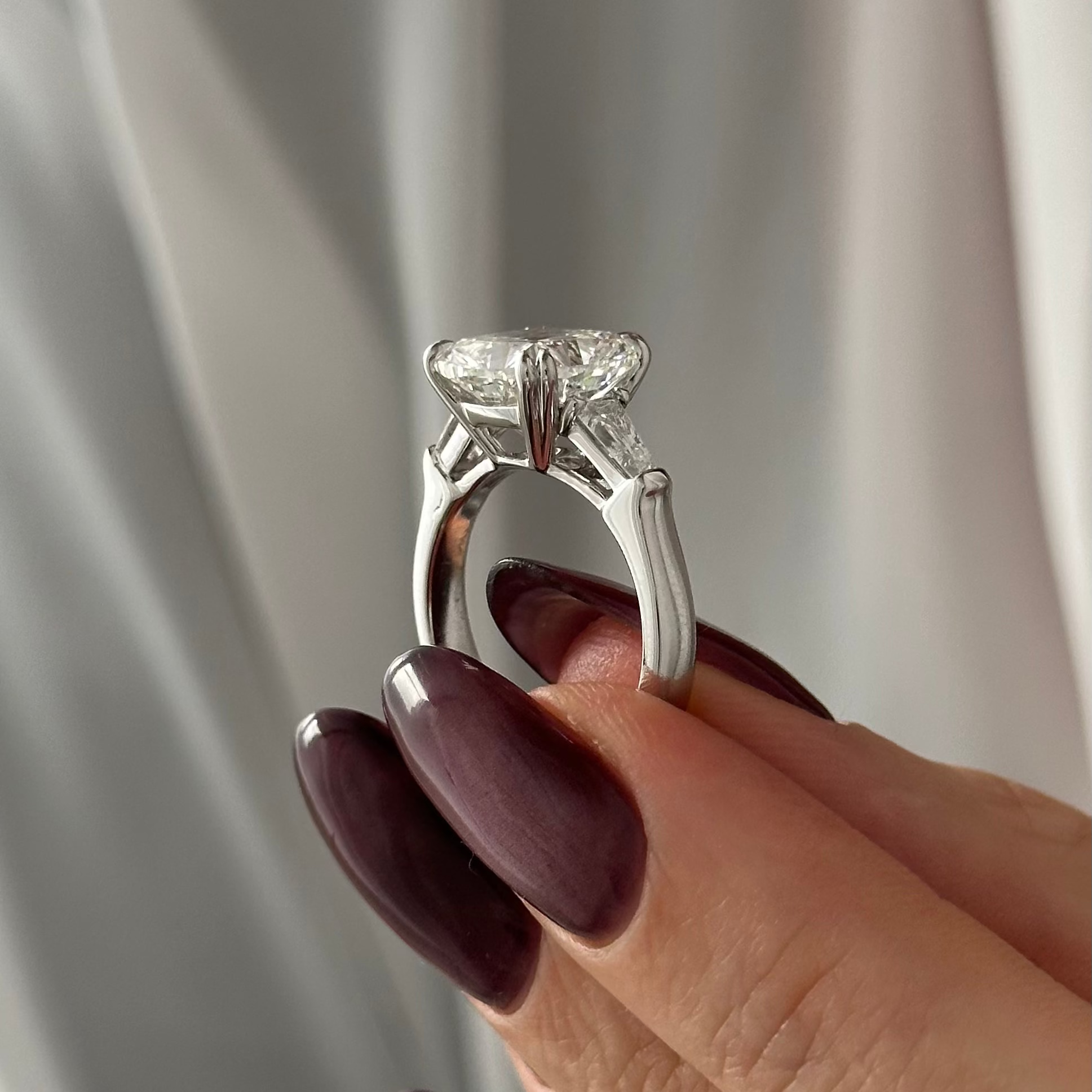 This exquisite ring features a stunning 5-carat lab-grown diamond in a cushion cut at the center, held by double claw prongs. Flanking ...