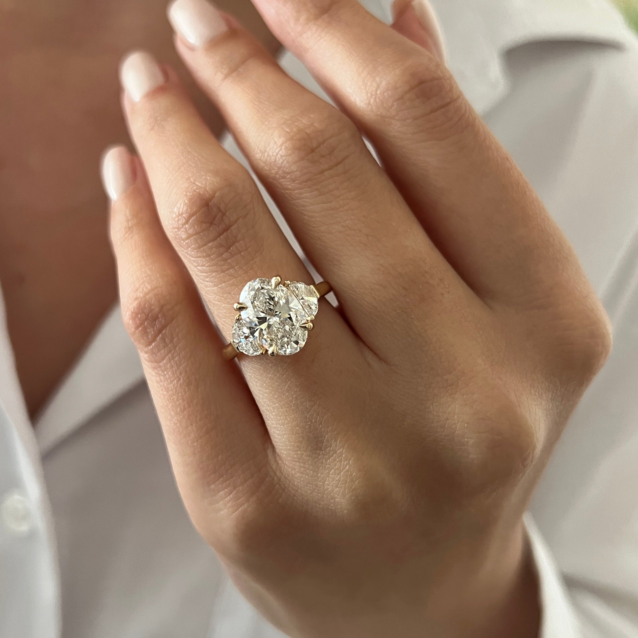 The 3-carat oval lab-grown diamond three-stone ring is a remarkable piece of jewelry crafted with precision and sophistication. Featuri...