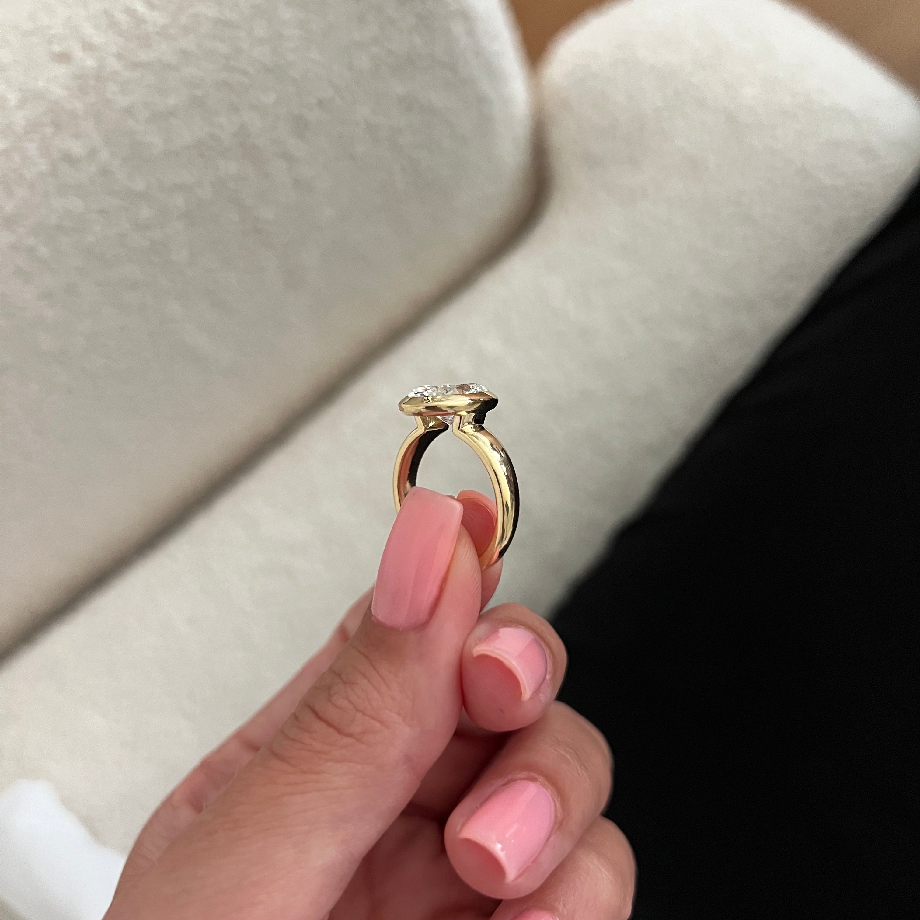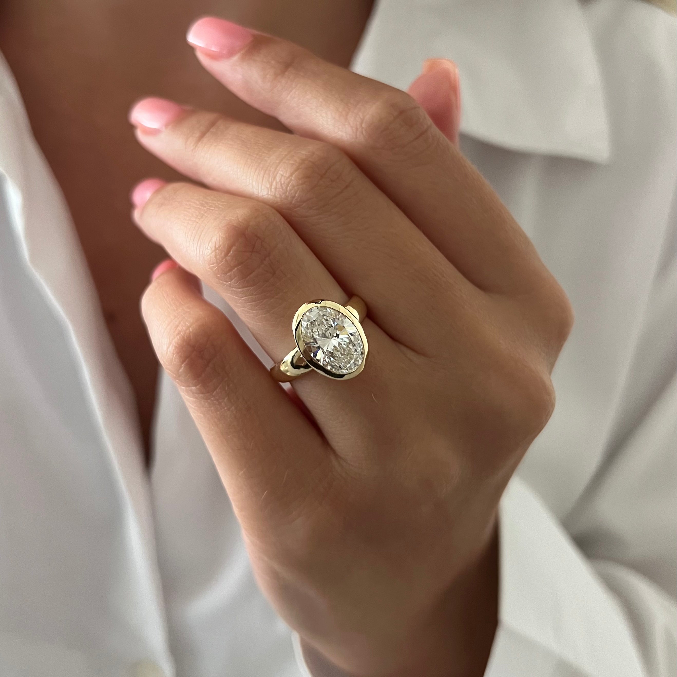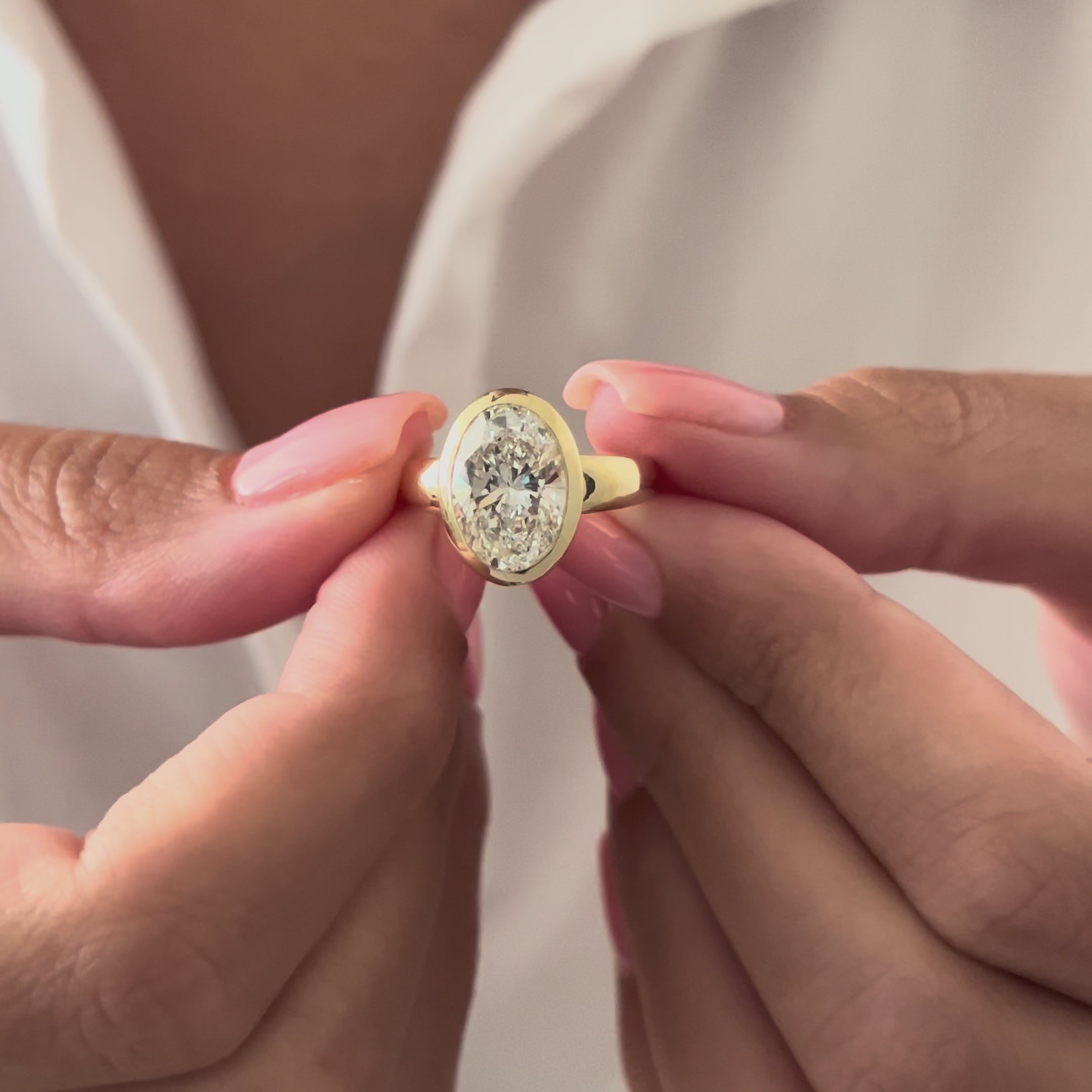 A stunning 3-carat oval-cut diamond sits in a sleek bezel setting, showcasing clean lines and a modern, refined style. The design allow...