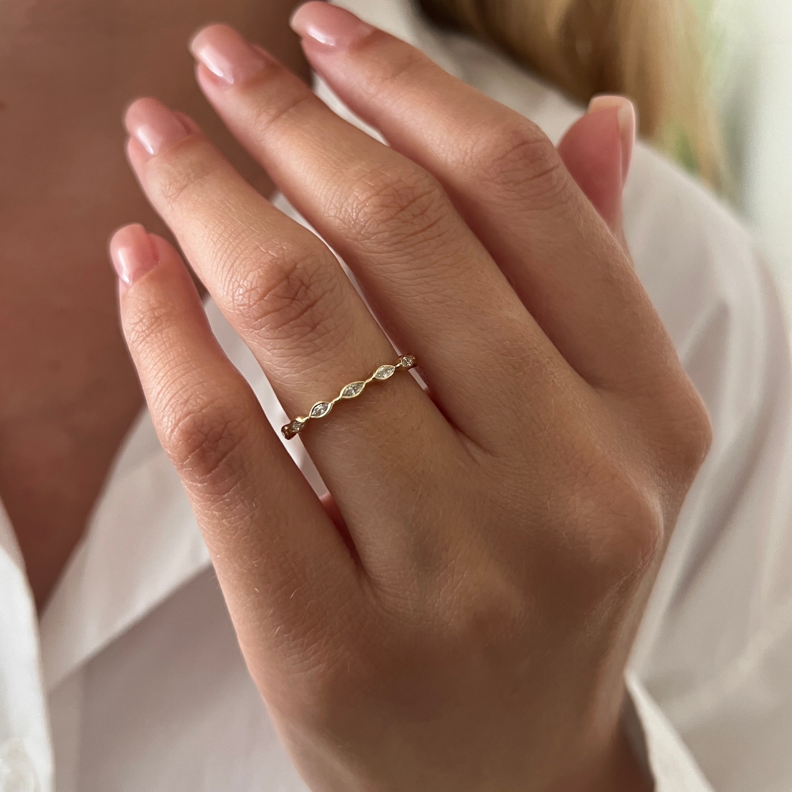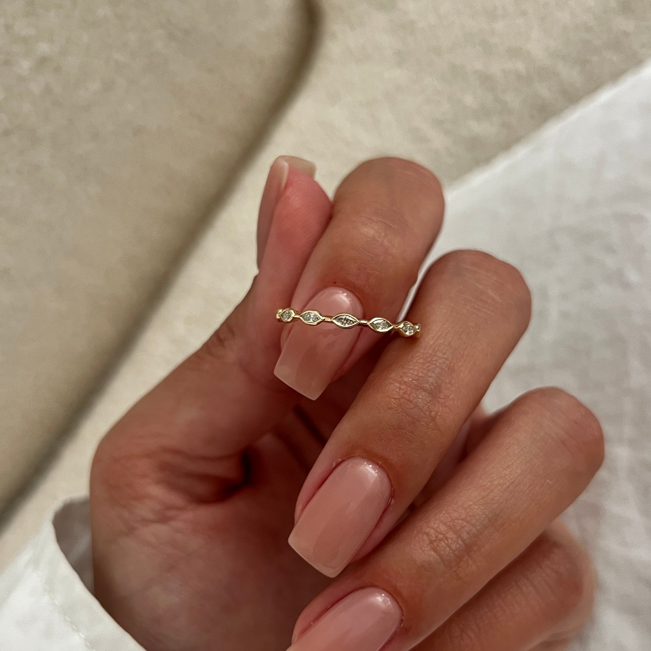 Eternity bands cannot be resized due to their design, which features gemstones encircling the entire band. If the band were to be resized, it would disrupt the pattern of the gemstones, causing them to be misaligned or potentially damaged.