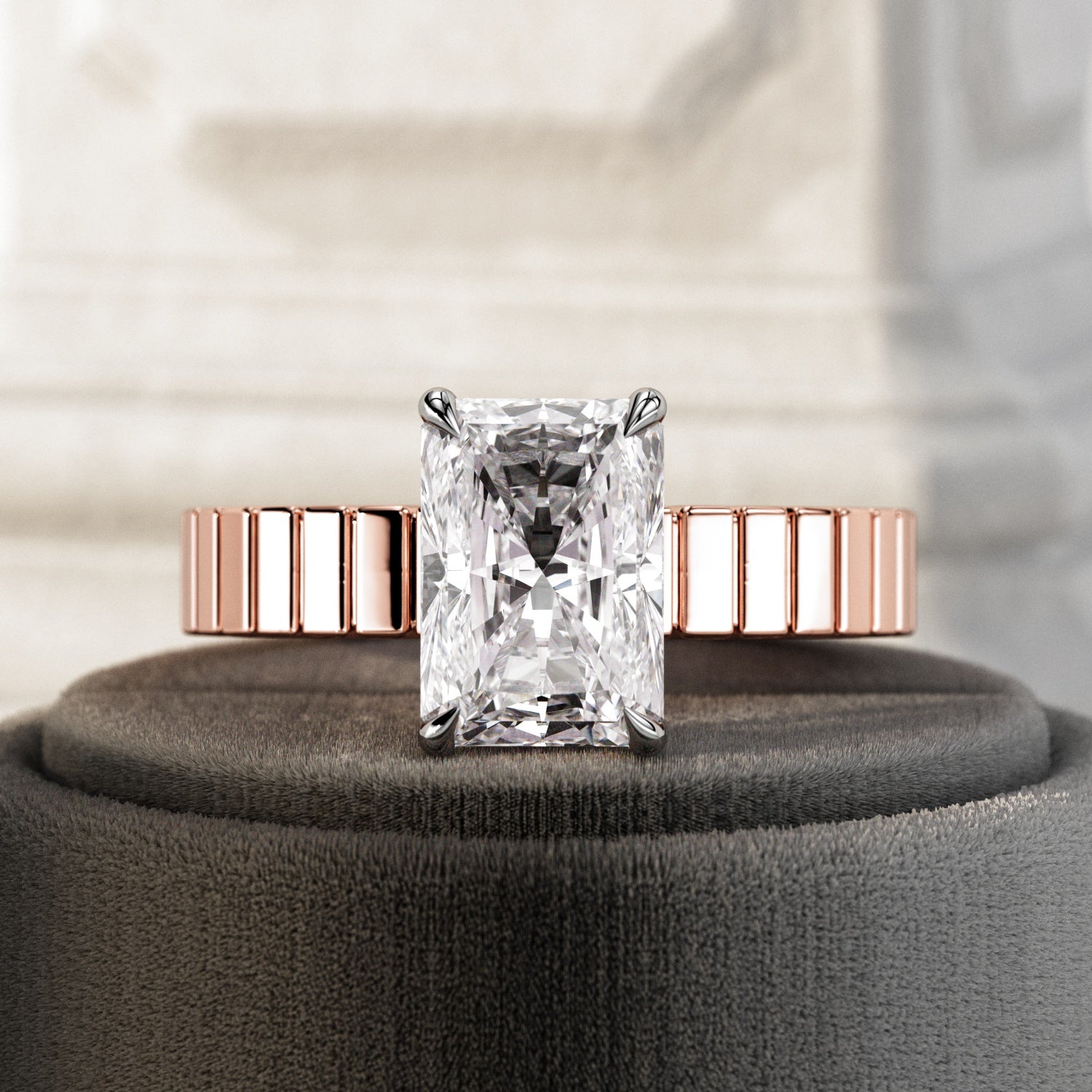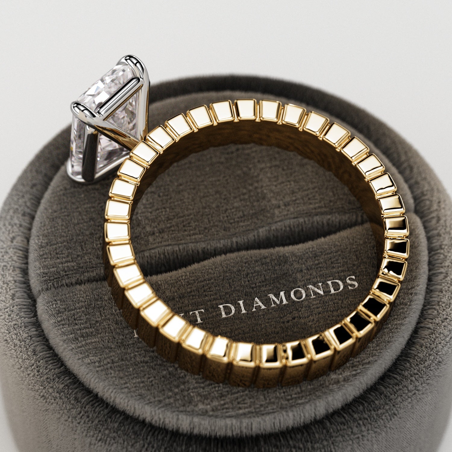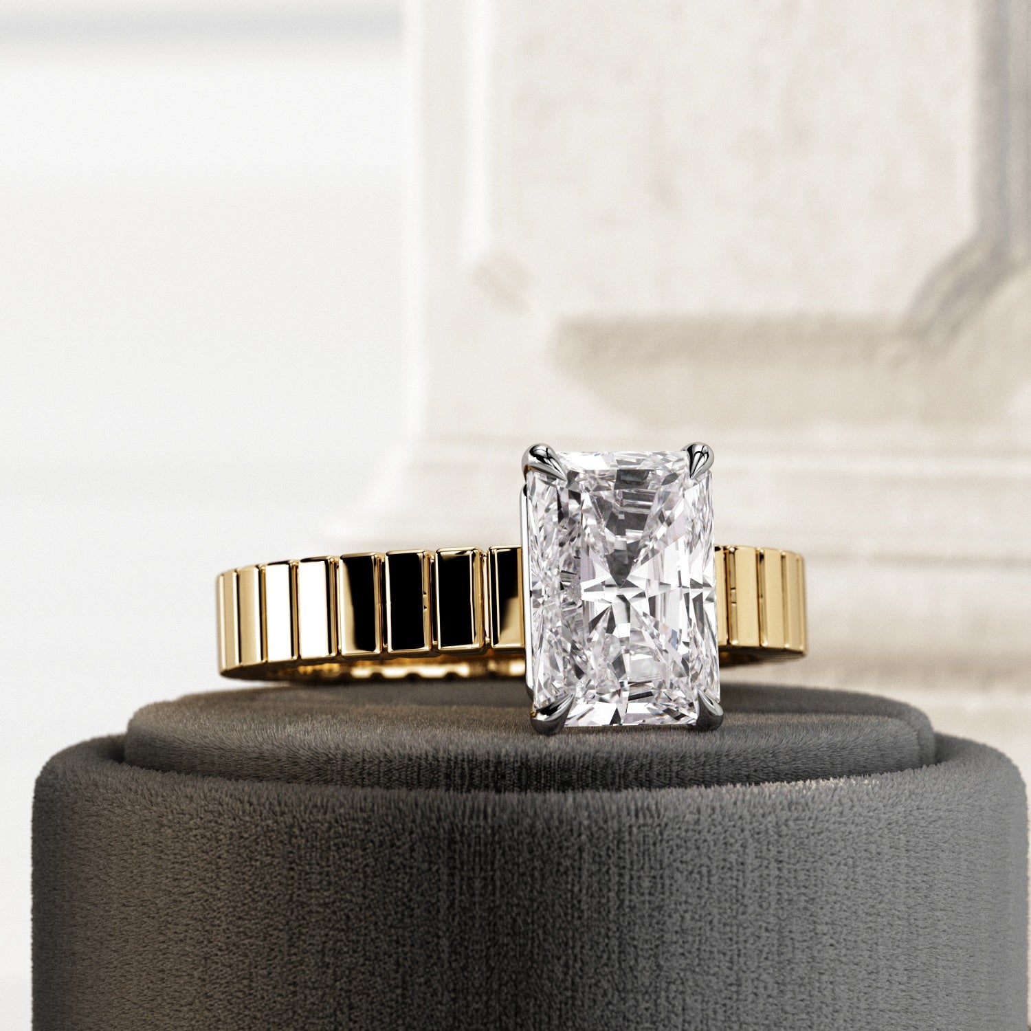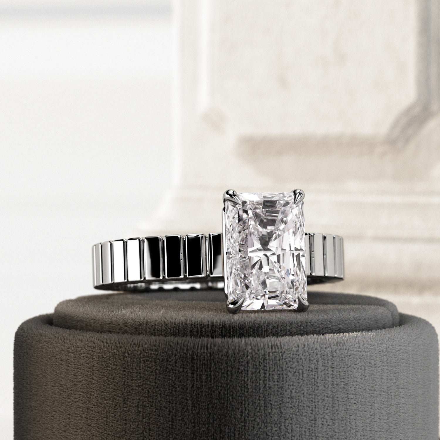 A bridal set ring is a coordinated pair of rings designed to be worn together, typically consisting of an engagement ring and a matching wedding band. These sets are crafted to complement each other aesthetically and symbolize the unity of marriage.