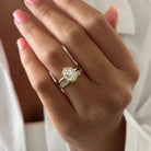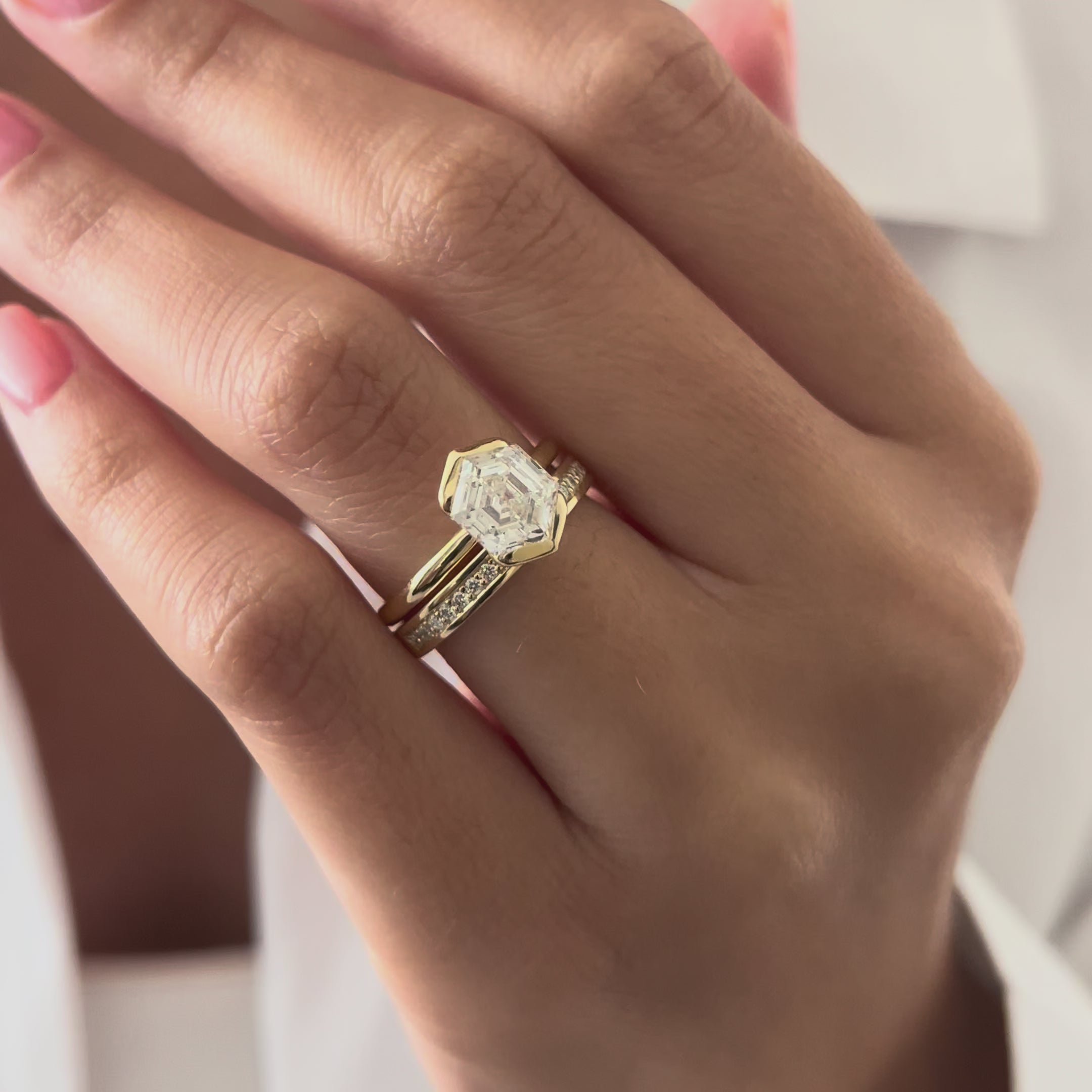 The engagement ring features a striking 2-carat hexagon-cut diamond, set north to south in a refined half bezel. Its low-profile design...