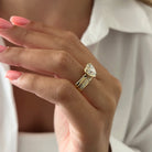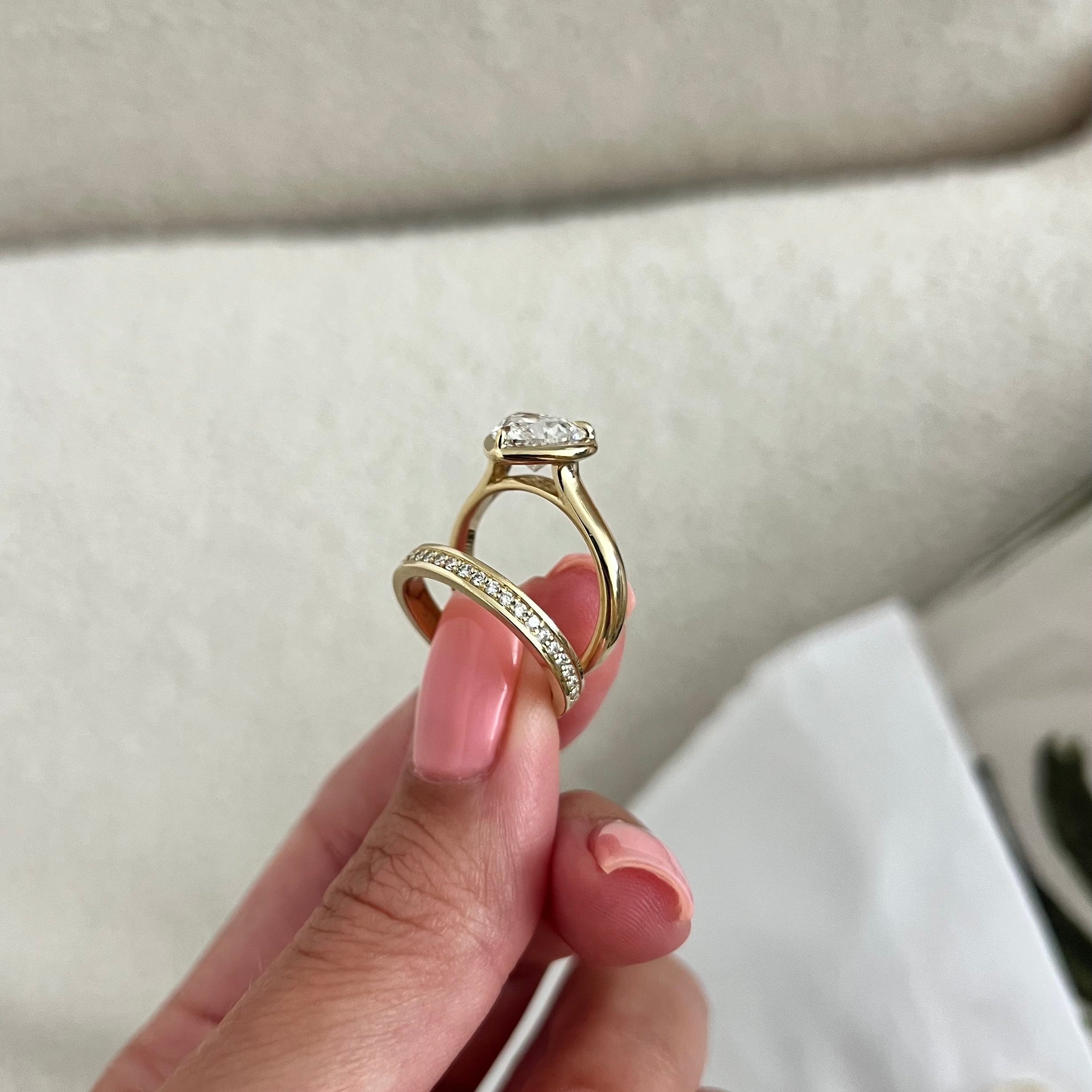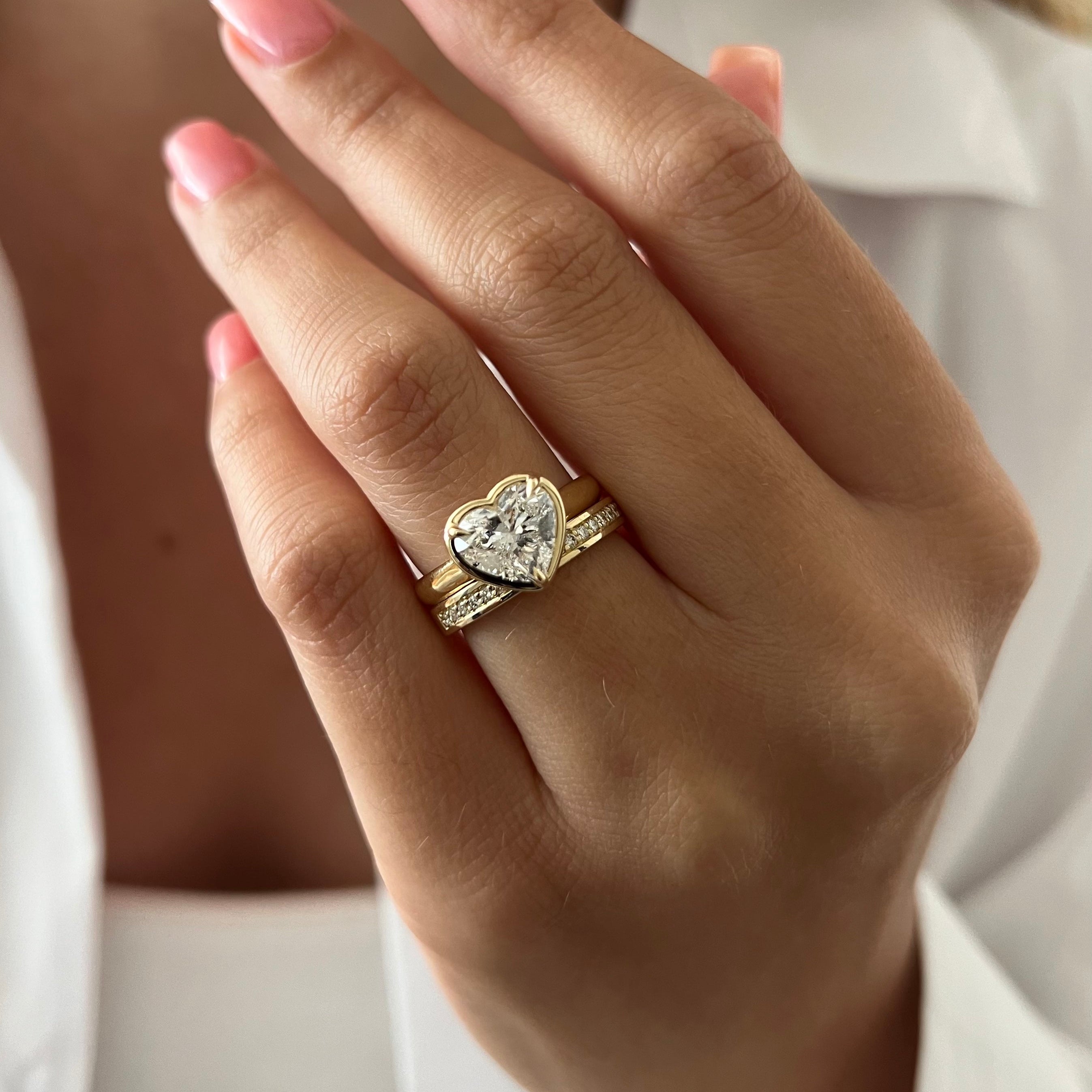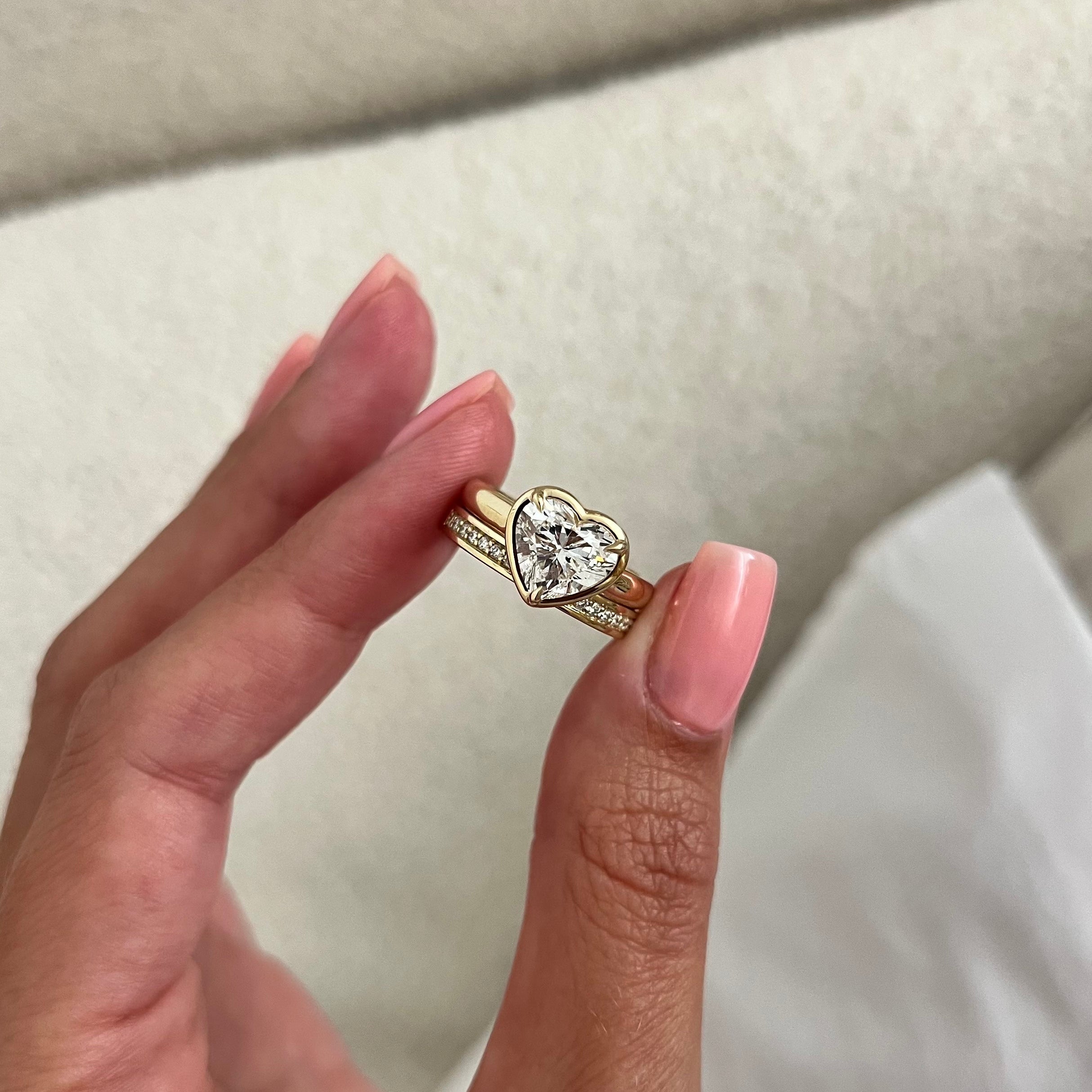 A stunning 2-carat heart diamond shines in a sleek bezel with delicate prongs, offering a modern Art Deco feel. Thanks to the cathedral...