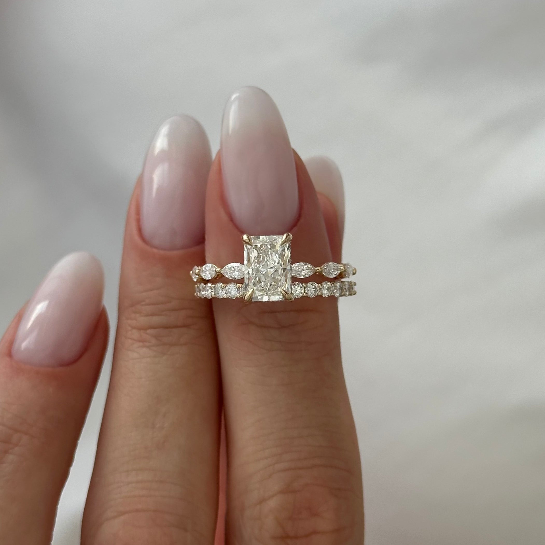 A beautiful bridal set featuring a 1.5-carat radiant-cut lab-grown diamond engagement ring with a hidden halo and marquise-cut diamonds...