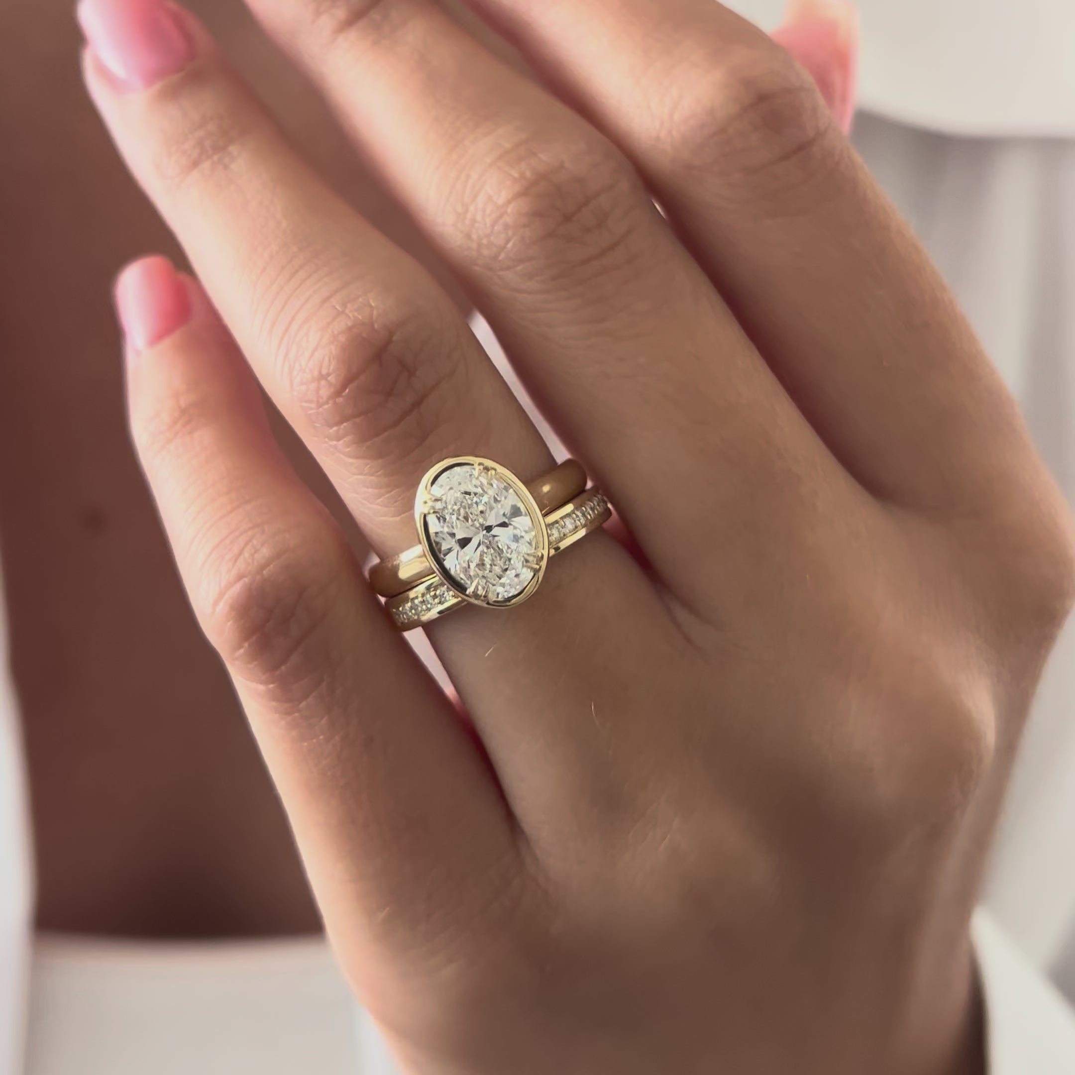 A stunning 2-carat elongated oval diamond shines in a sleek bezel with delicate prongs, offering a modern Art Deco feel. Thanks to the ...
