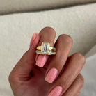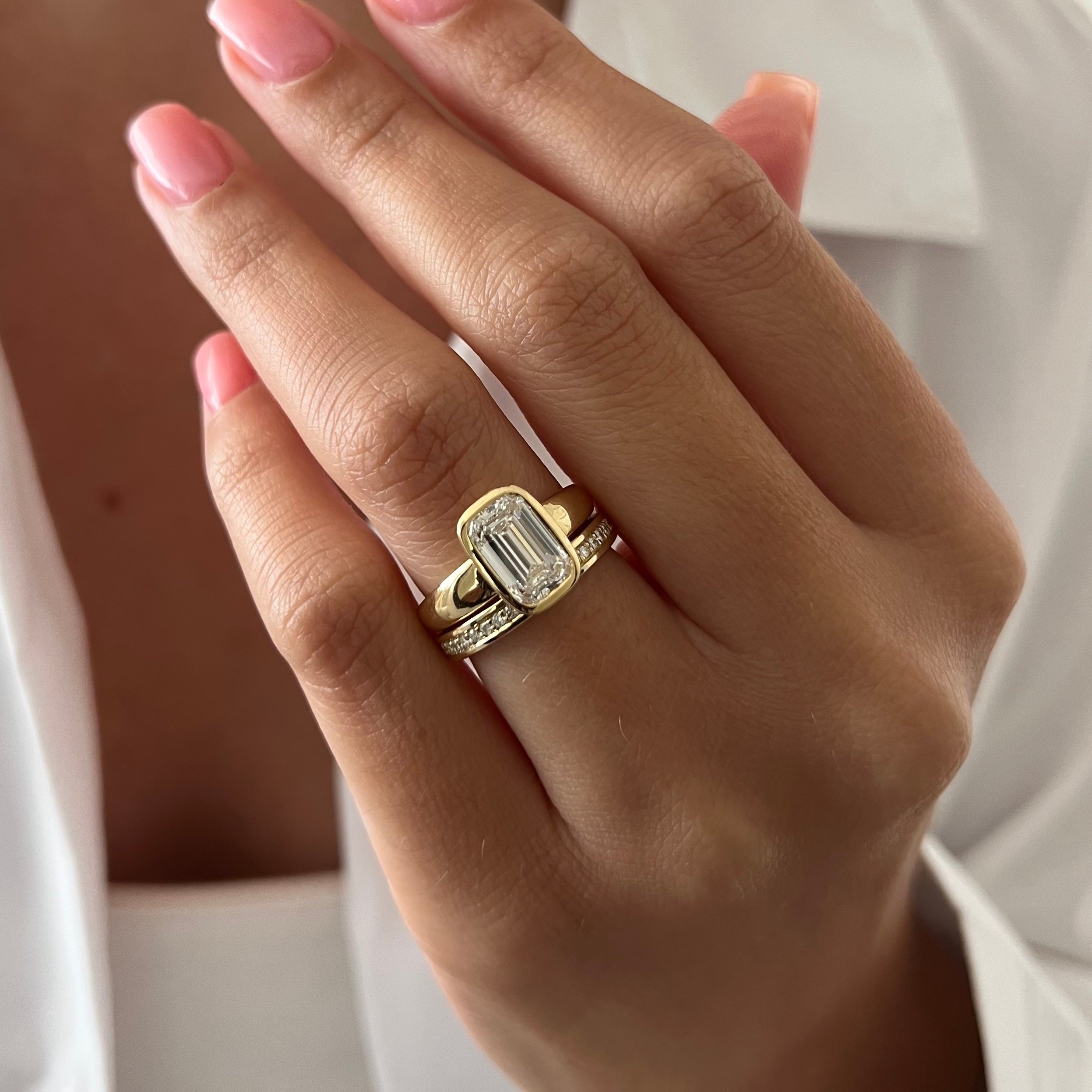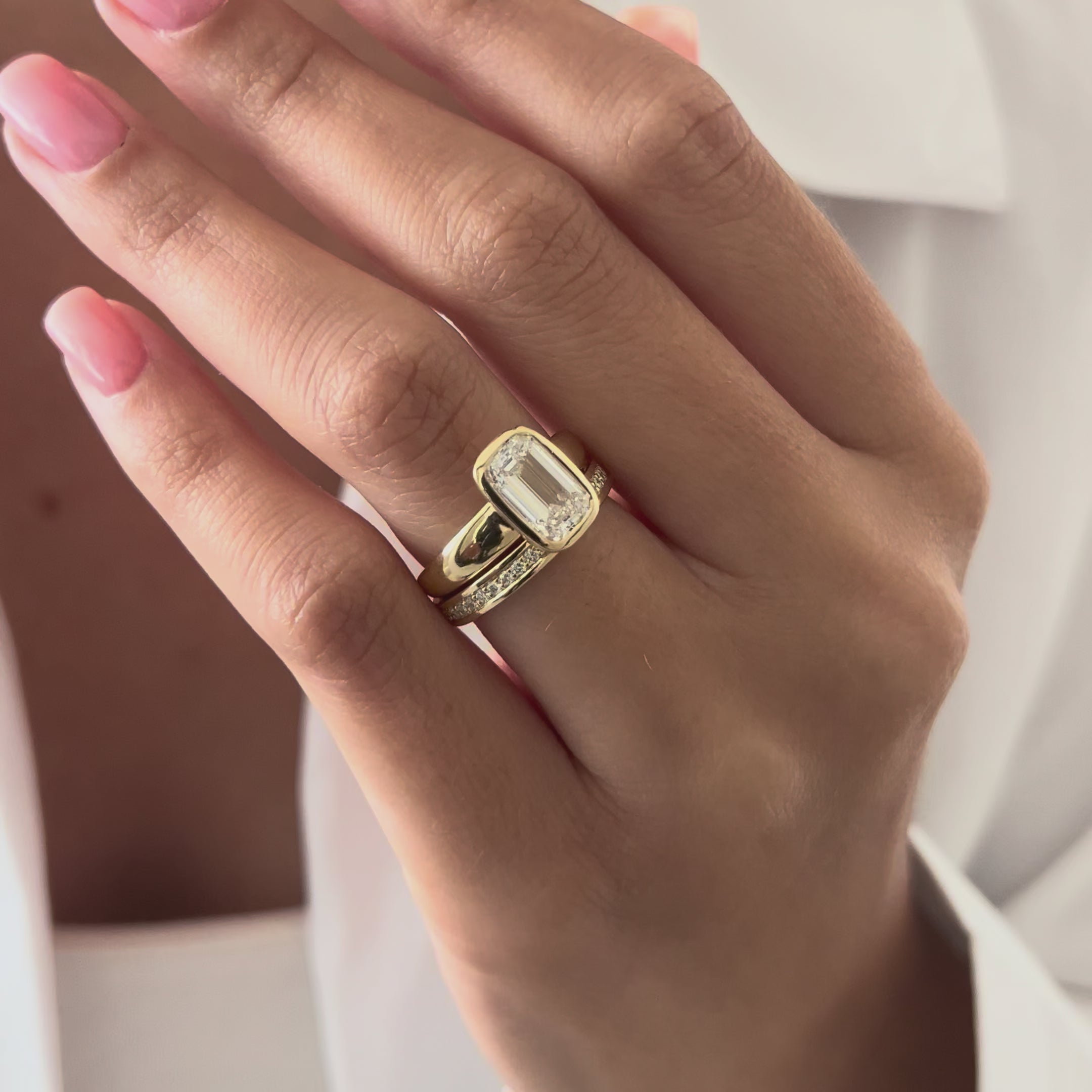 A stunning 2-carat emerald-cut diamond set in a sleek bezel setting, exuding refined modern elegance. The engagement ring features a 4m...