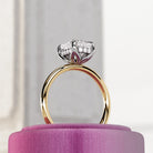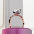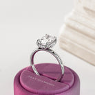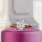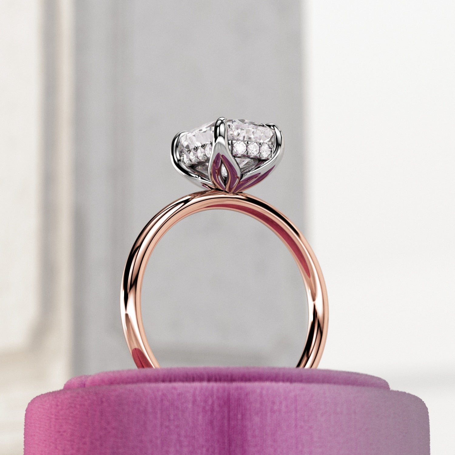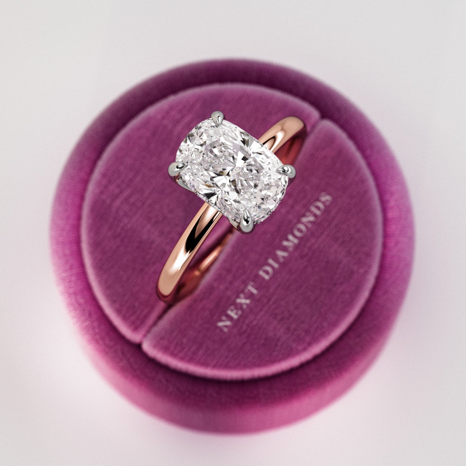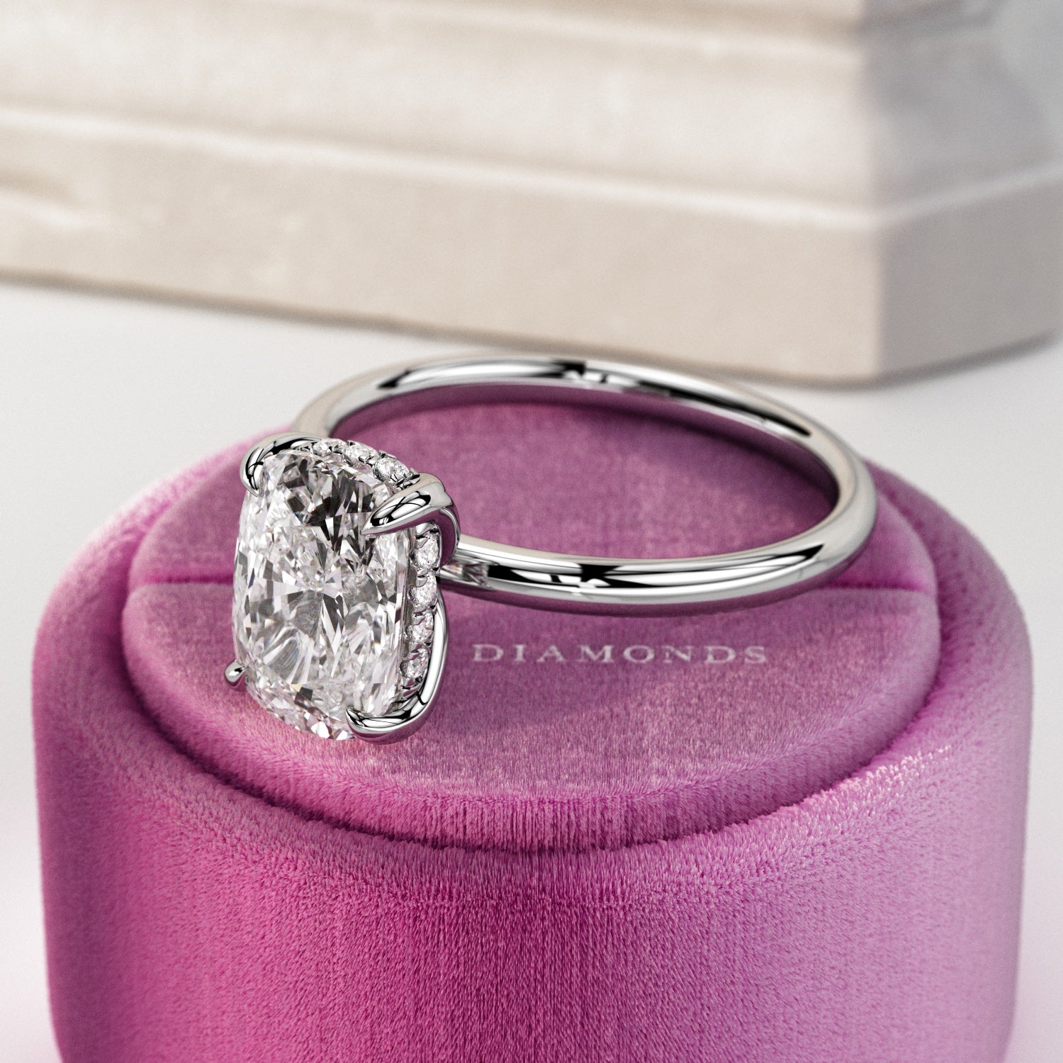 The exquisite 2-carat elongated cushion lab-grown diamond ring features prongs designed in a delicate lotus flower pattern, adding a un...