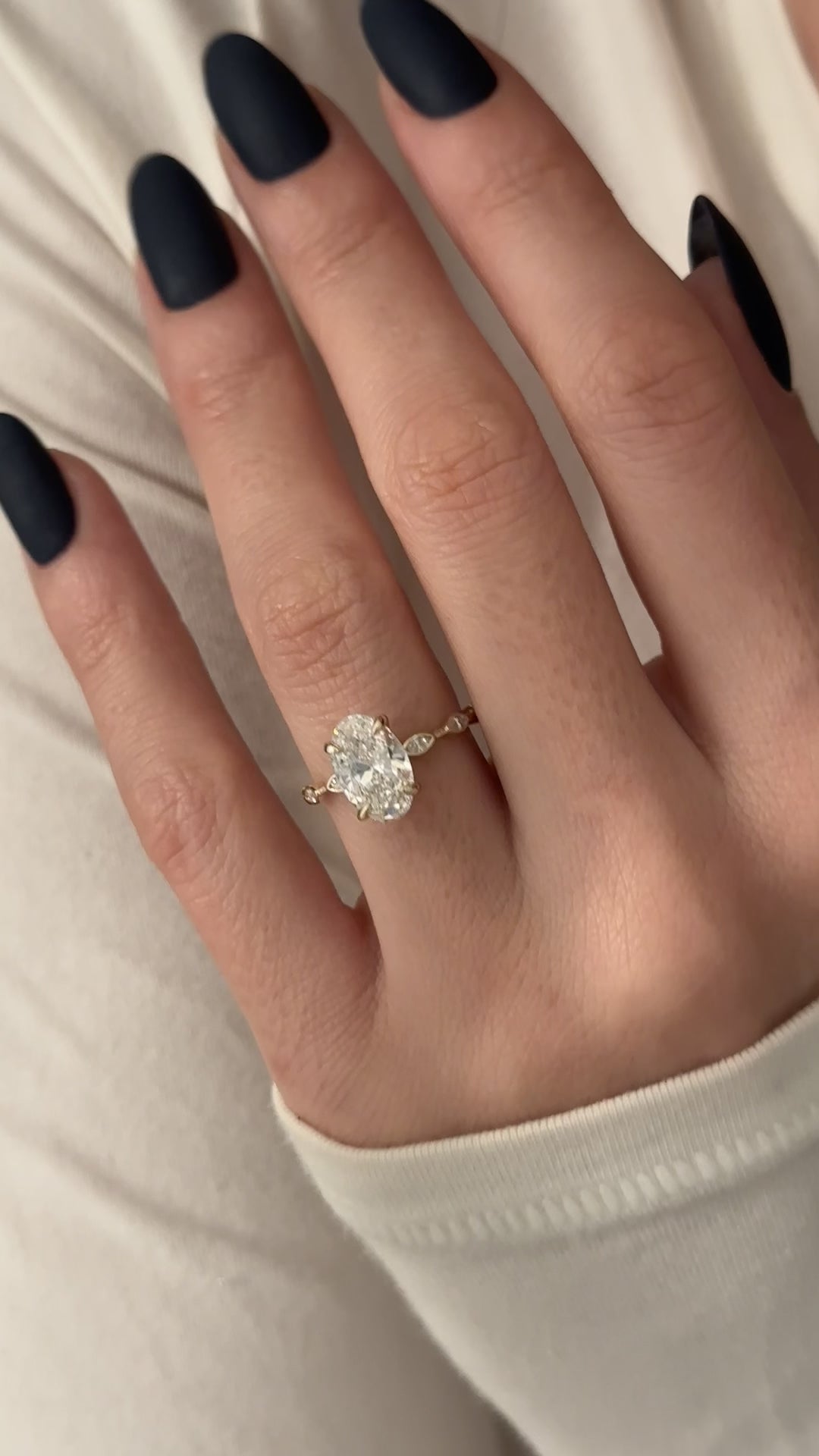 A beautiful engagement ring graces the finger with grace, featuring a dainty band adorned with a brilliant 2-carat oval lab-grown diamo...