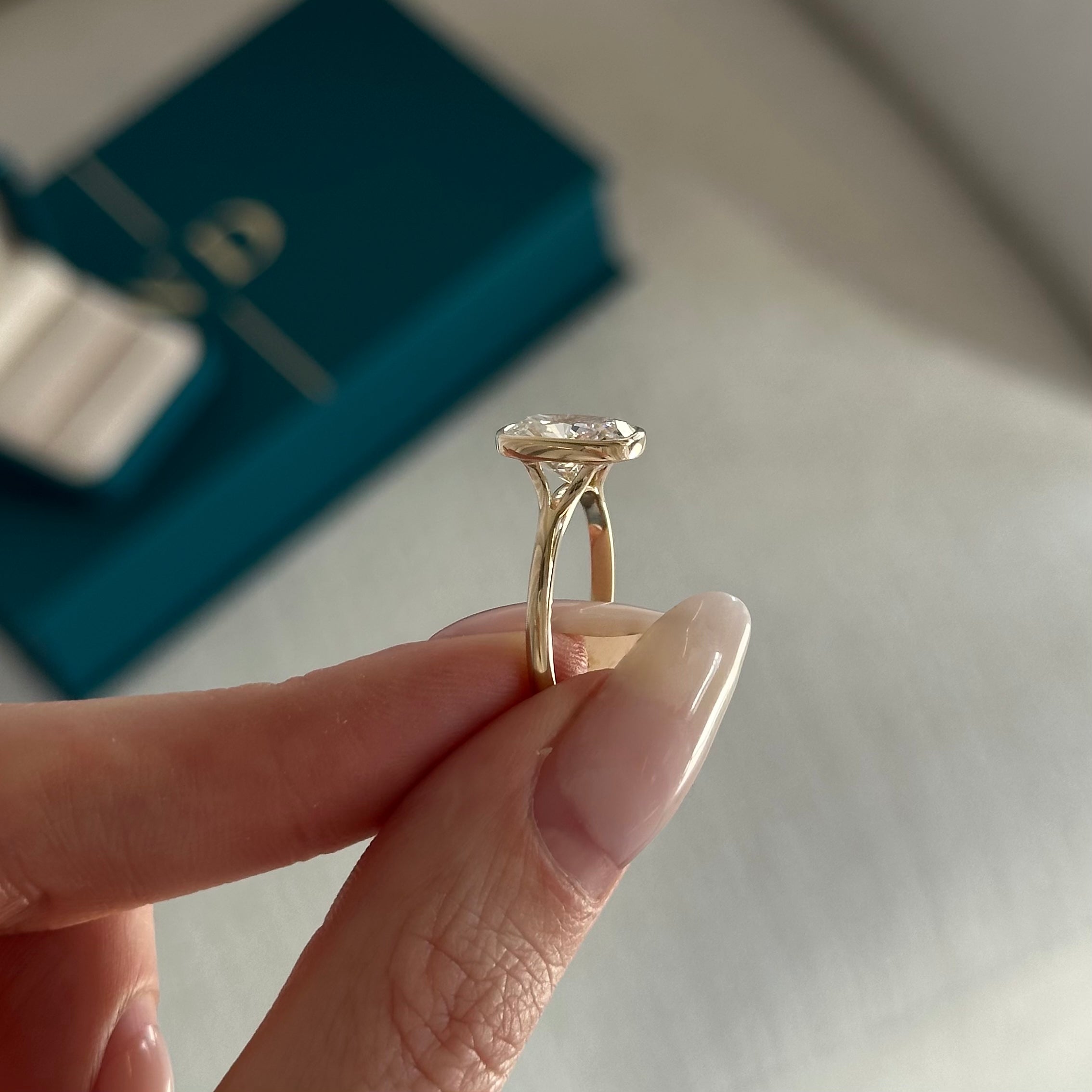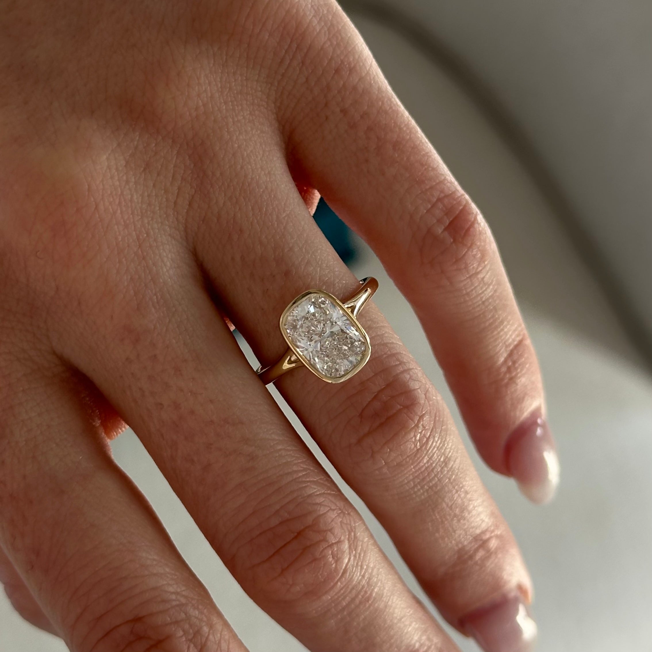A dazzling 3-carat elongated cushion cut lab-grown diamond takes center stage in this elegant solitaire ring. Set in a secure bezel set...
