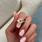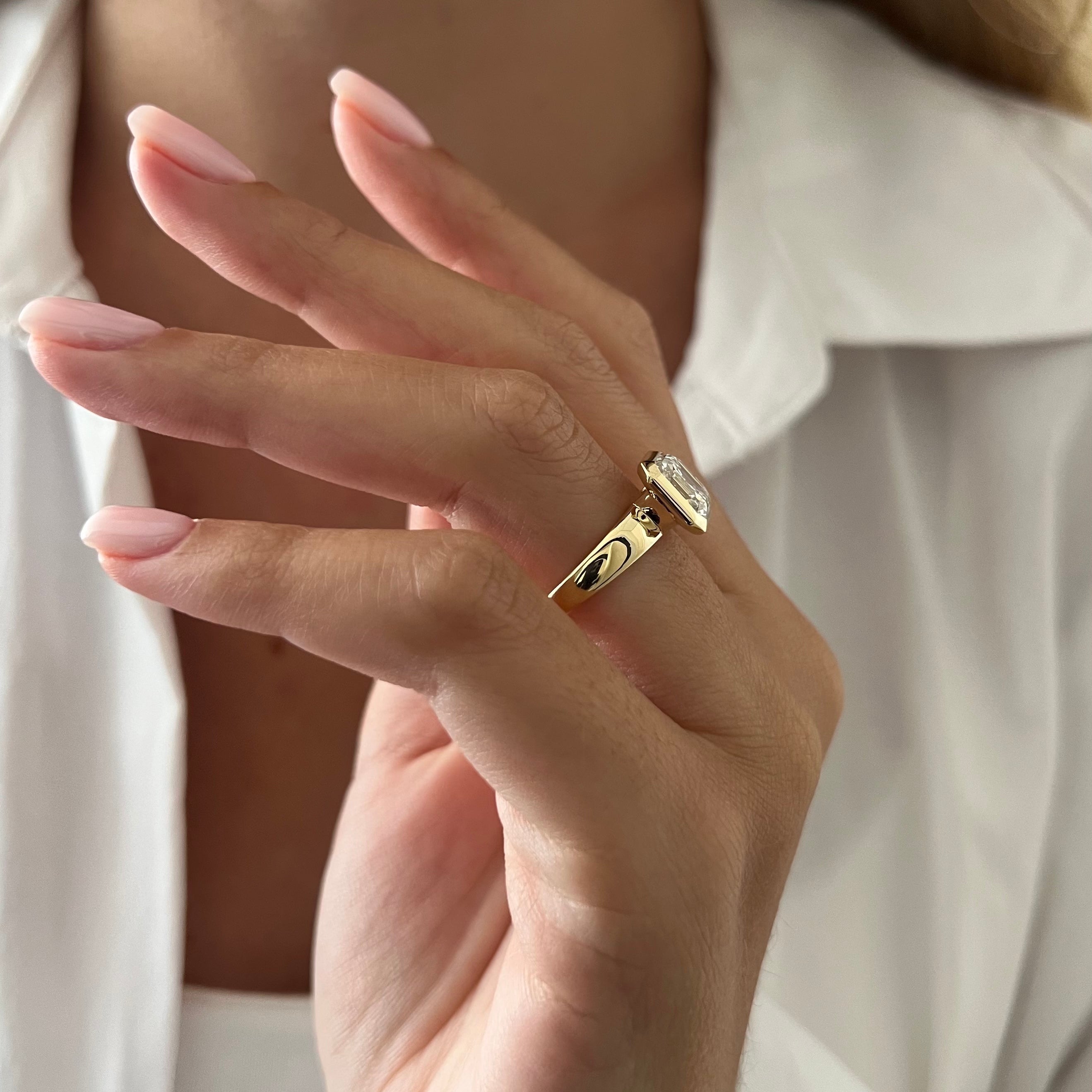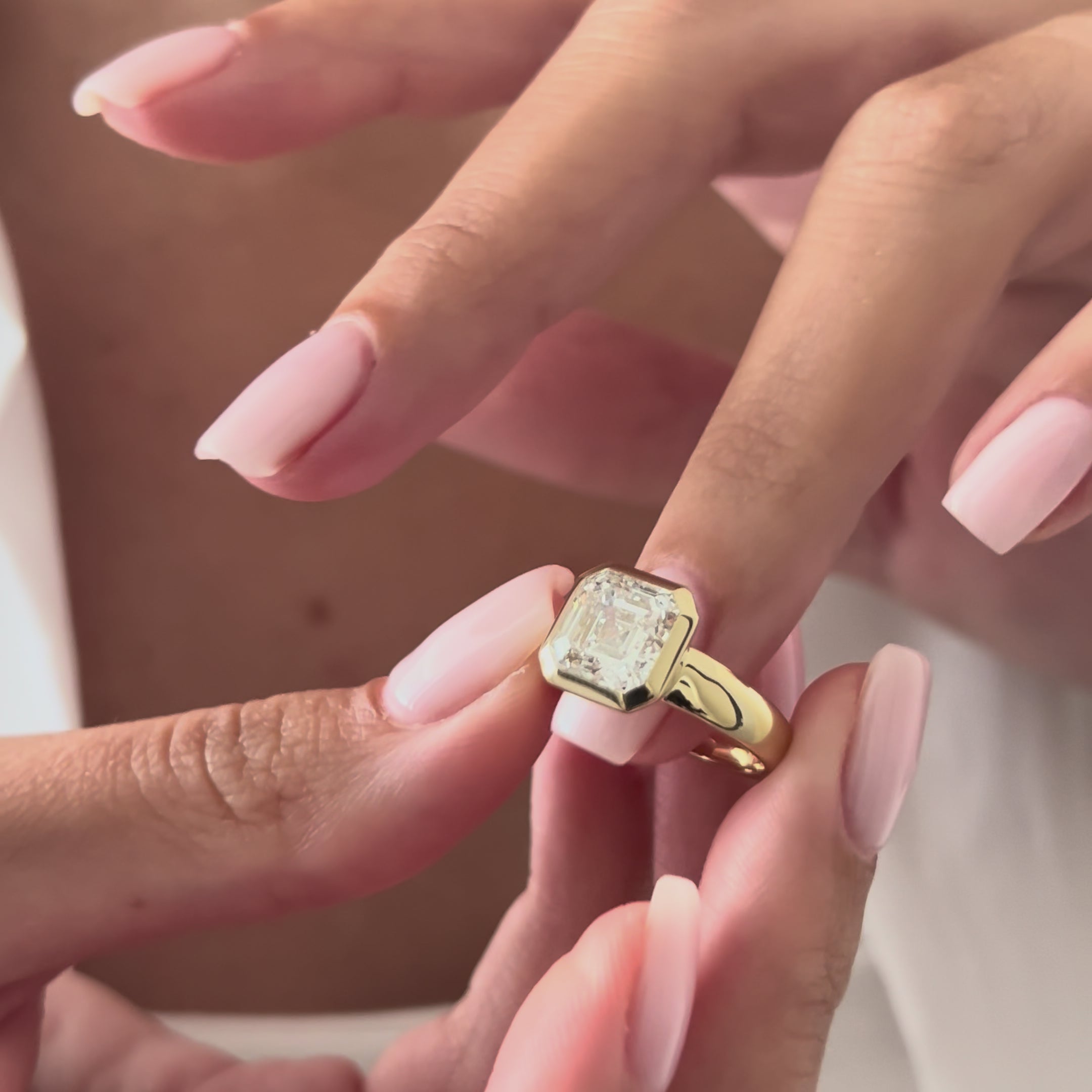 A stunning 3-carat Asscher-cut diamond sits in a sleek bezel setting, showcasing clean lines and a modern, refined style. The design al...