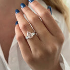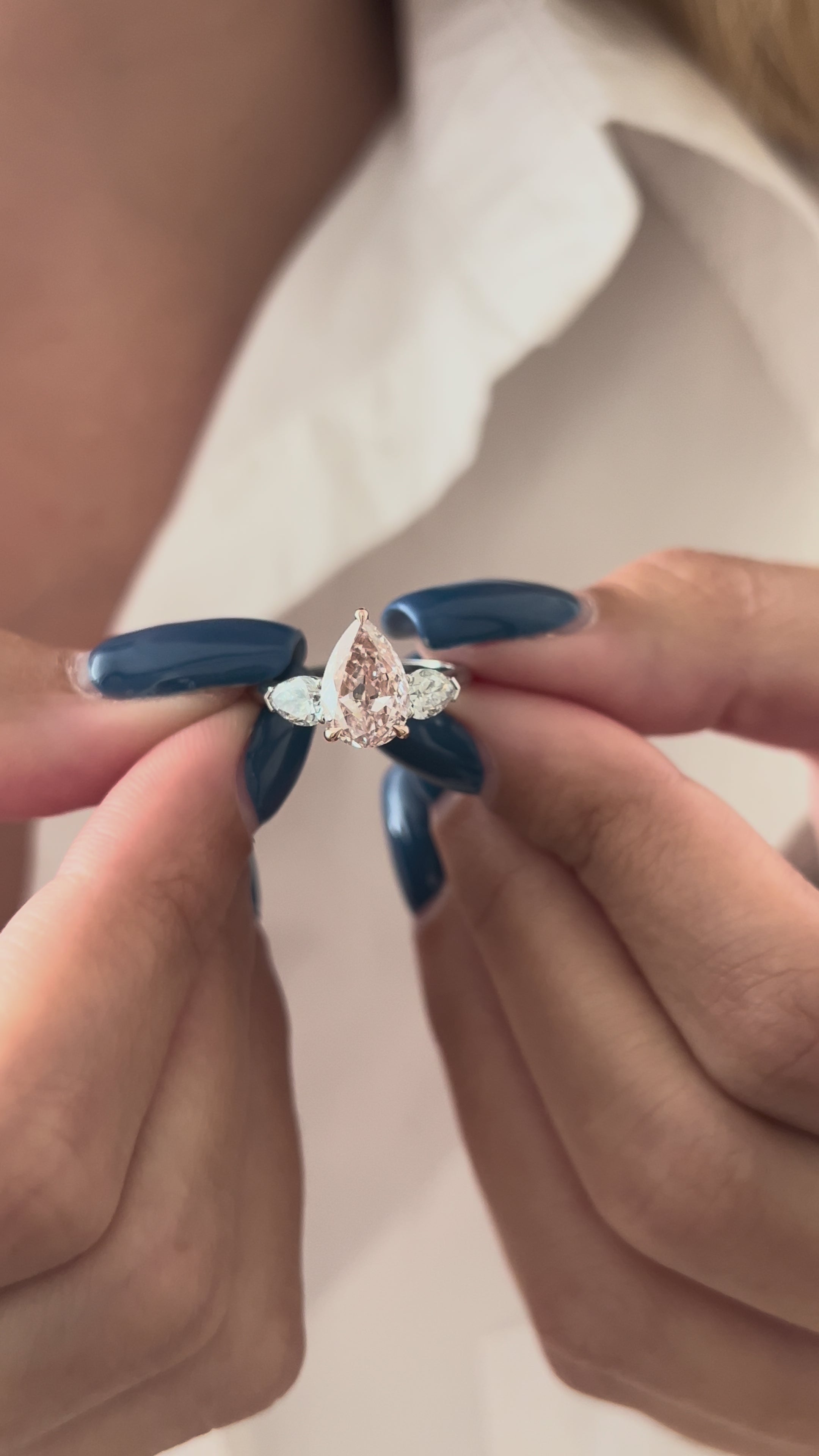 A stunning ring featuring a 2-carat pear-cut fancy vivid pink lab-grown diamond, flanked by two pear-shaped side diamonds totaling 0.7c...