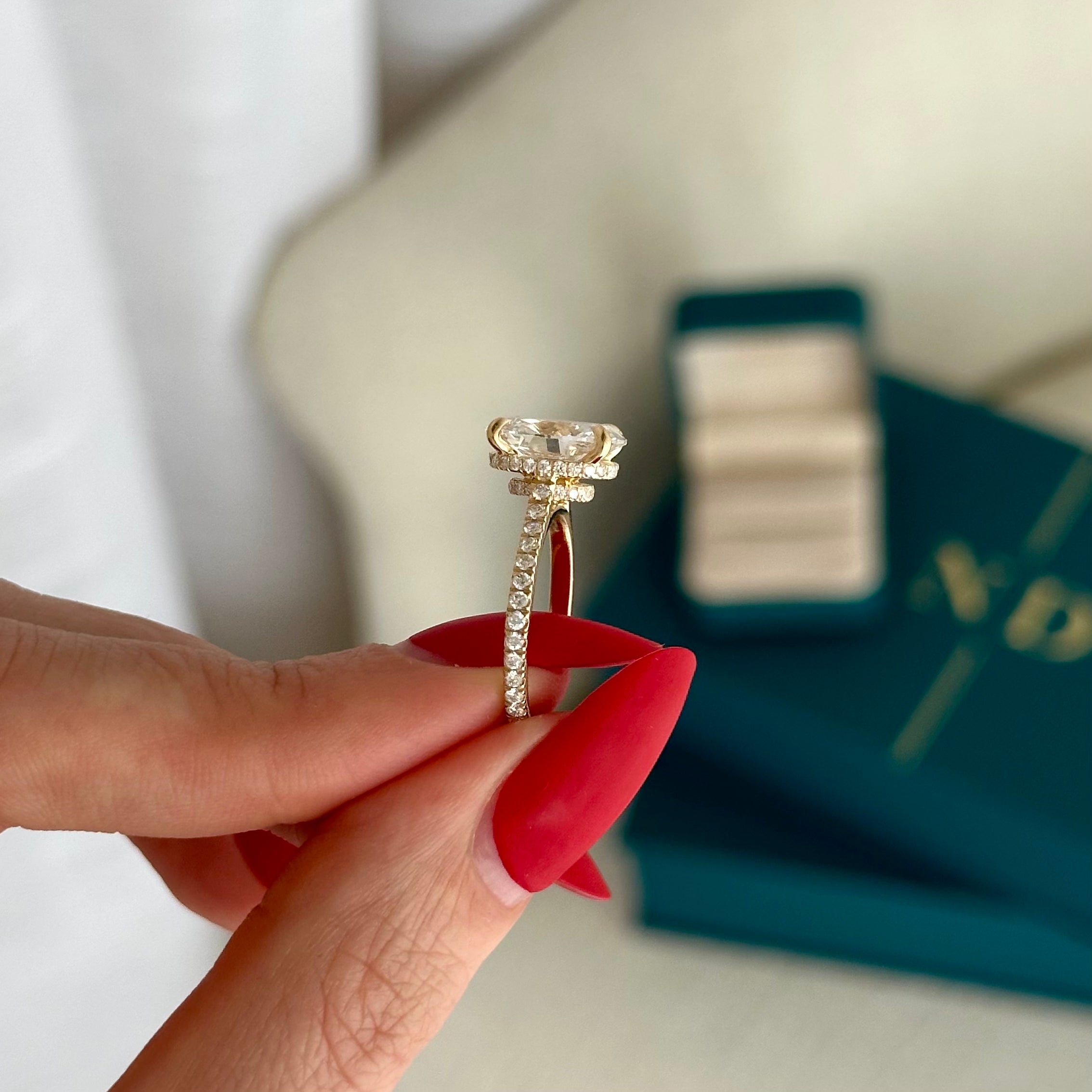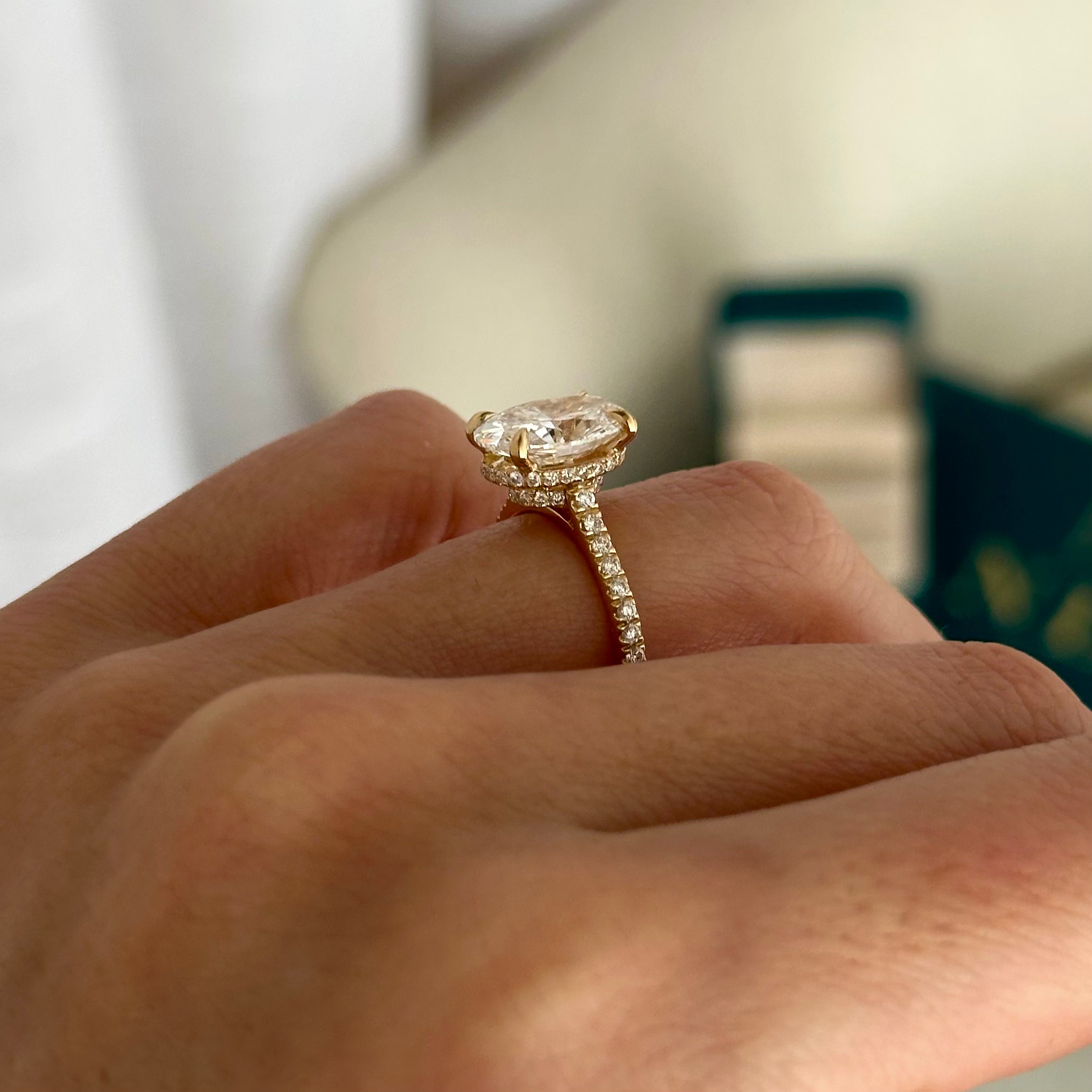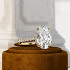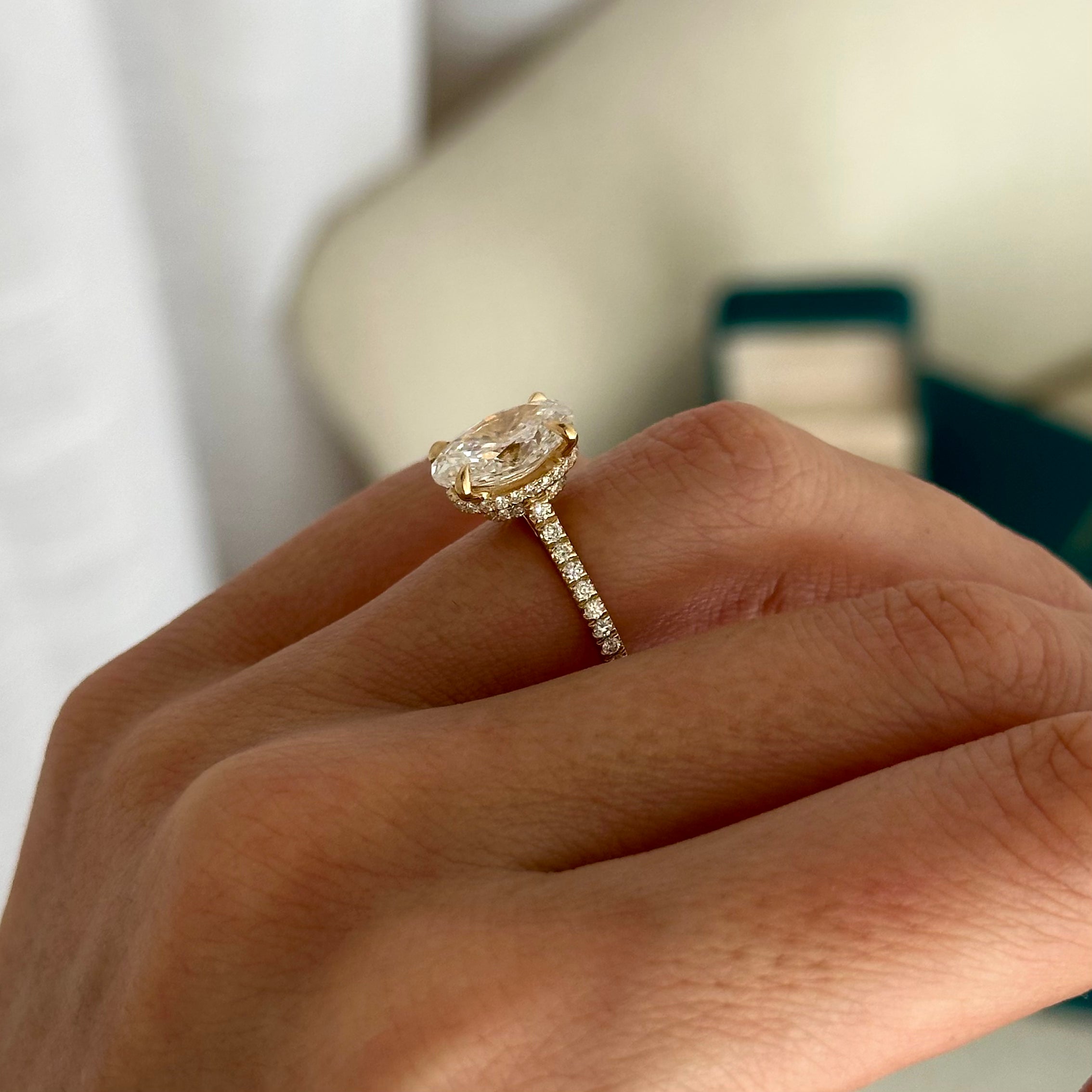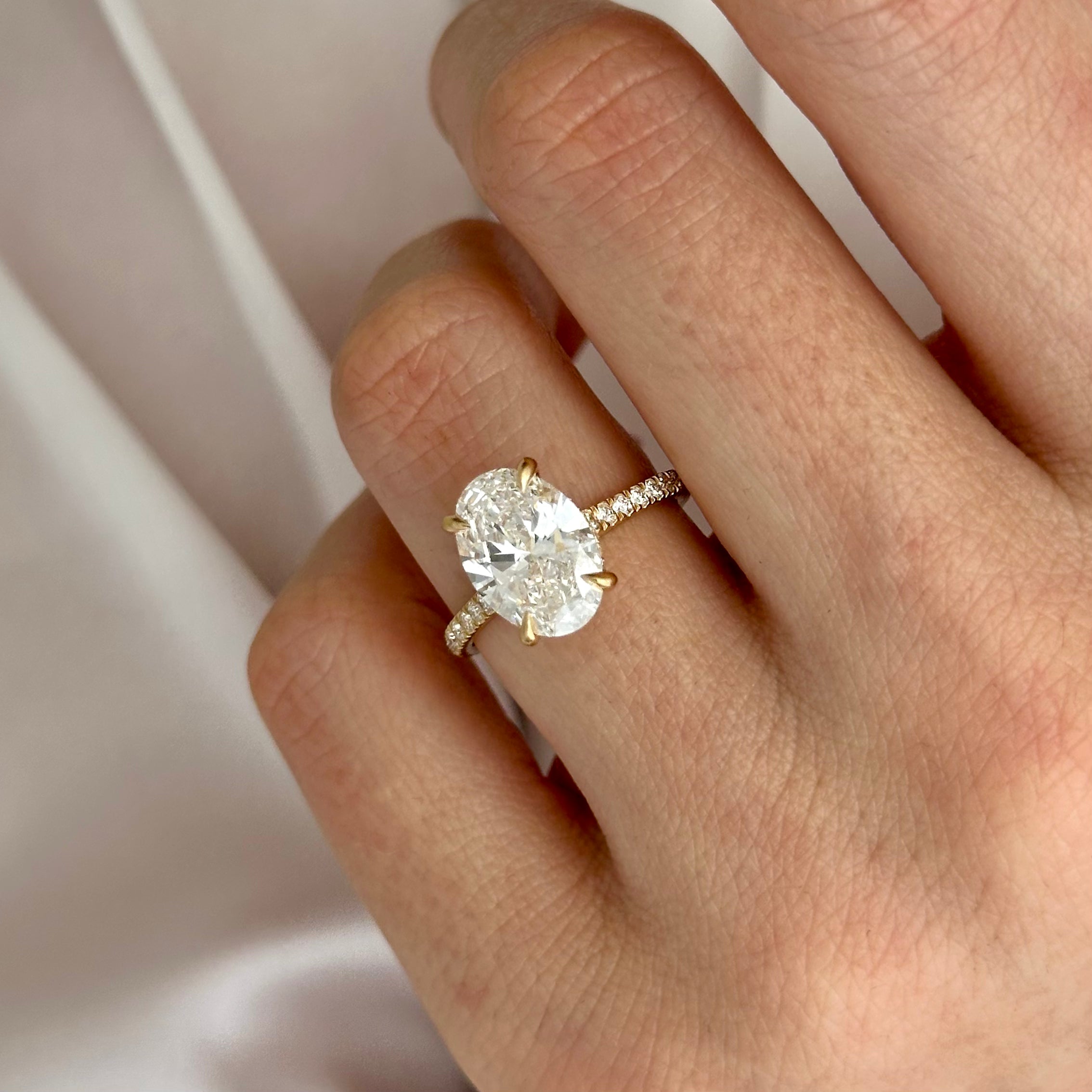 An exquisite engagement ring is truly one-of-a-kind, featuring a stunning 3-carat oval lab-grown diamond held in place by four secure c...