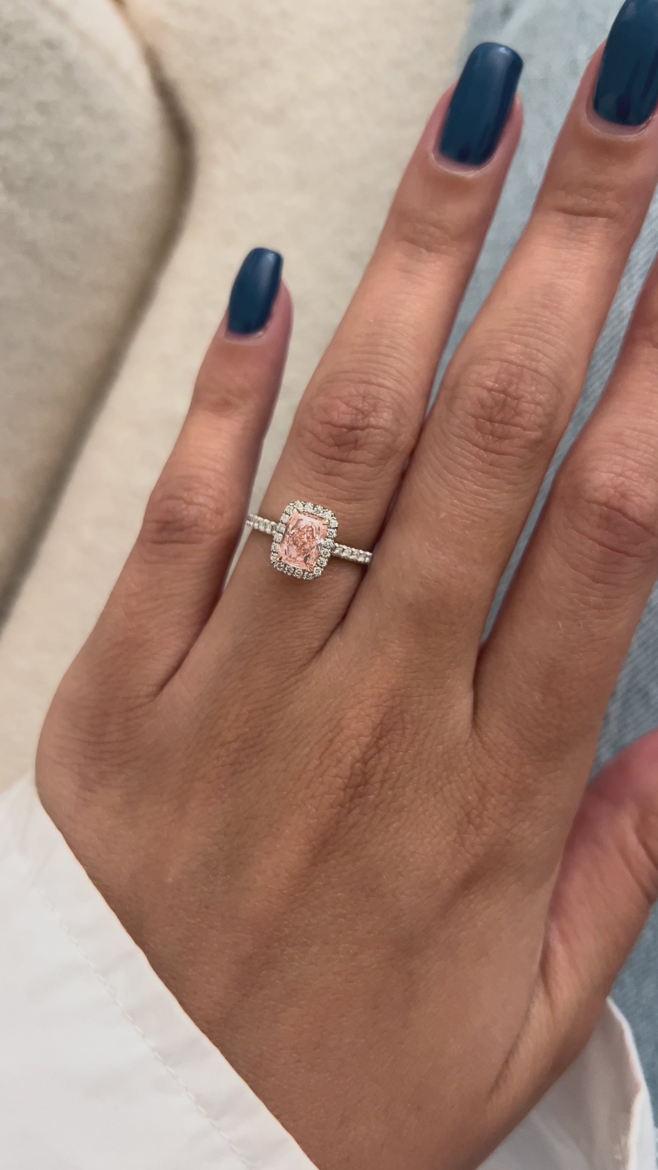 A captivating 1.1-carat elongated cushion fancy vivid pink lab-grown diamond ring is delicately set in a classic design featuring four ...