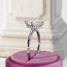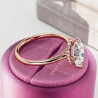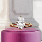 A stunning 2-carat oval lab-grown diamond engagement ring features a hidden halo and a cathedral setting. The kite claw prong setting s...