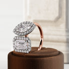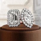 An exquisite Toi Et Moi ring showcasing a 1ct emerald-cut lab-grown diamond and a 1-carat marquise-cut lab-grown diamond, both adorned ...