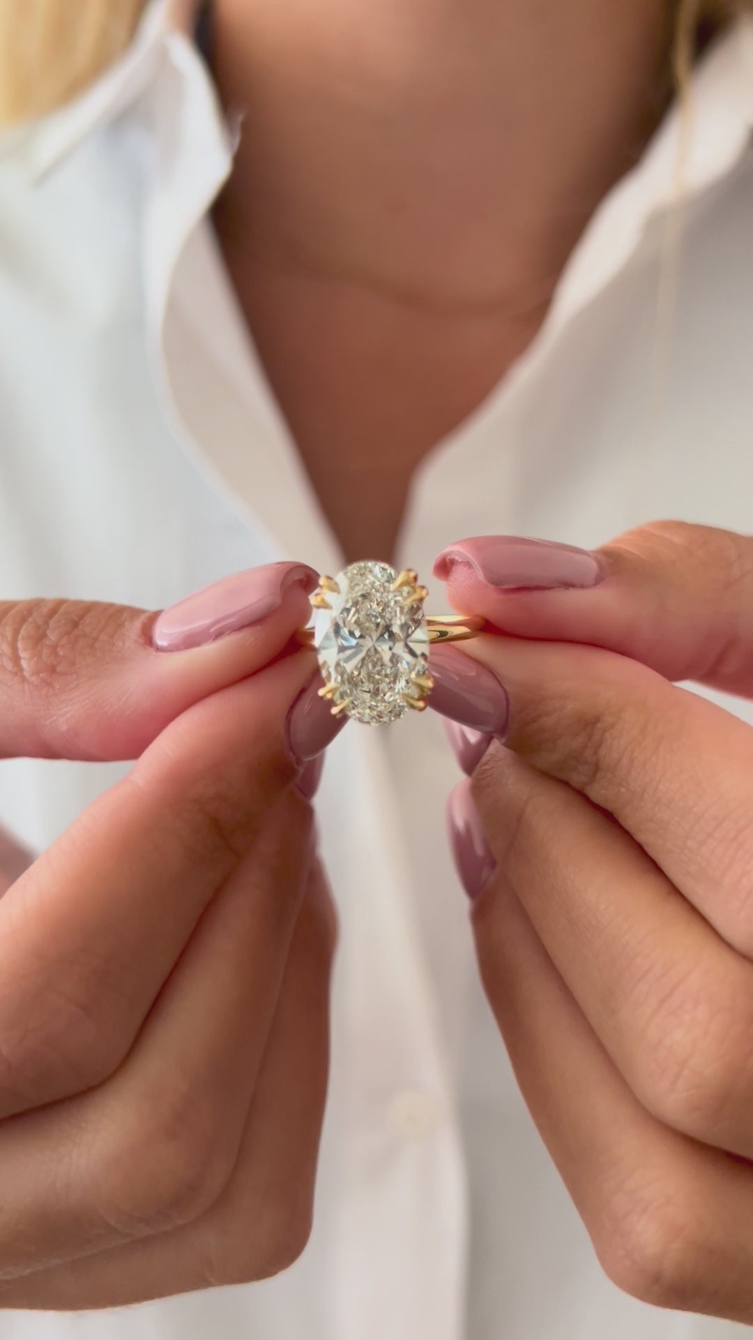 Introducing an exquisite solitaire ring featuring a captivating 5-carat oval lab-grown diamond. Held securely by double claw prongs, th...