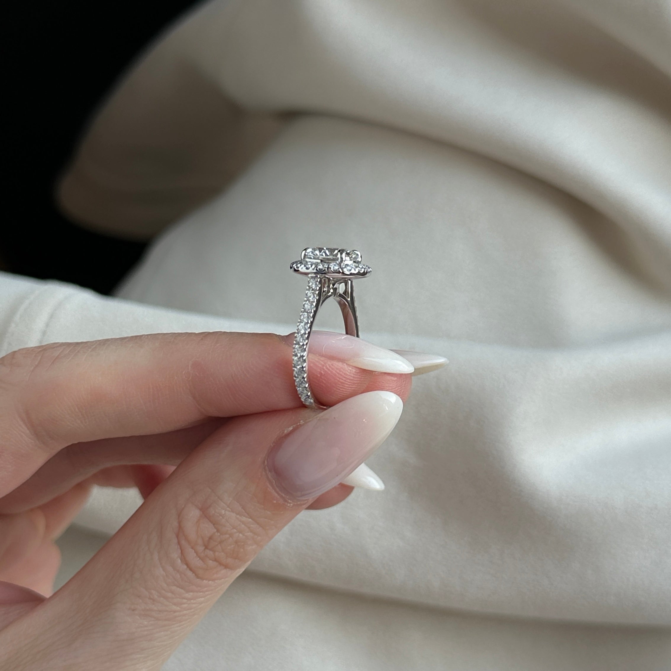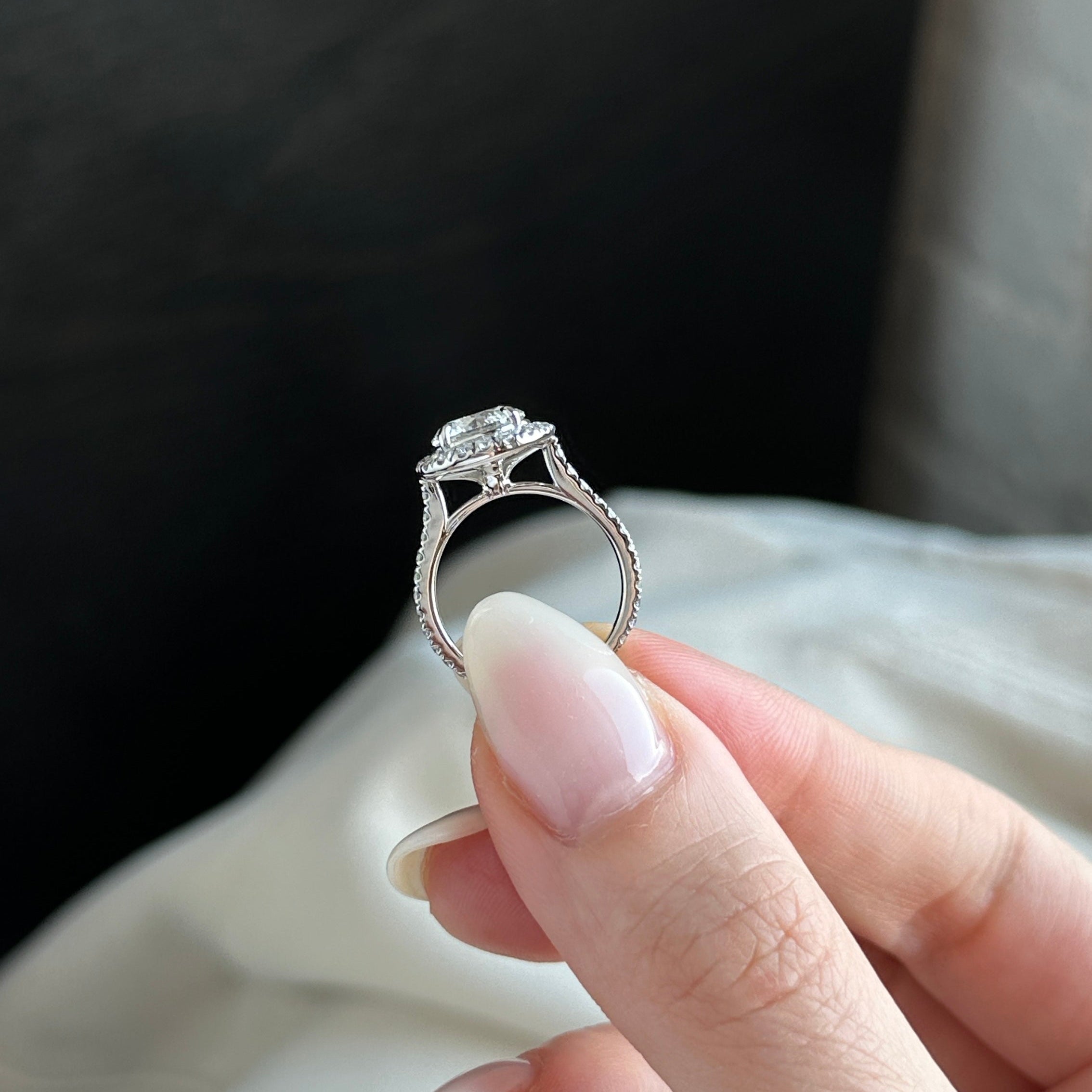 A stunning 2-carat round brilliant lab-grown diamond, elegantly showcased in a mesmerizing halo setting. This cathedral-style masterpie...