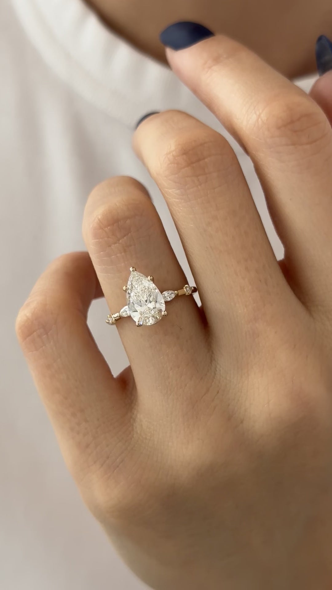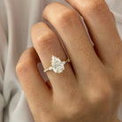 A dainty engagement ring featuring a 2-carat pear-shaped lab-grown diamond as the center stone, flanked by two elegant marquise-cut sid...