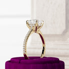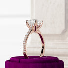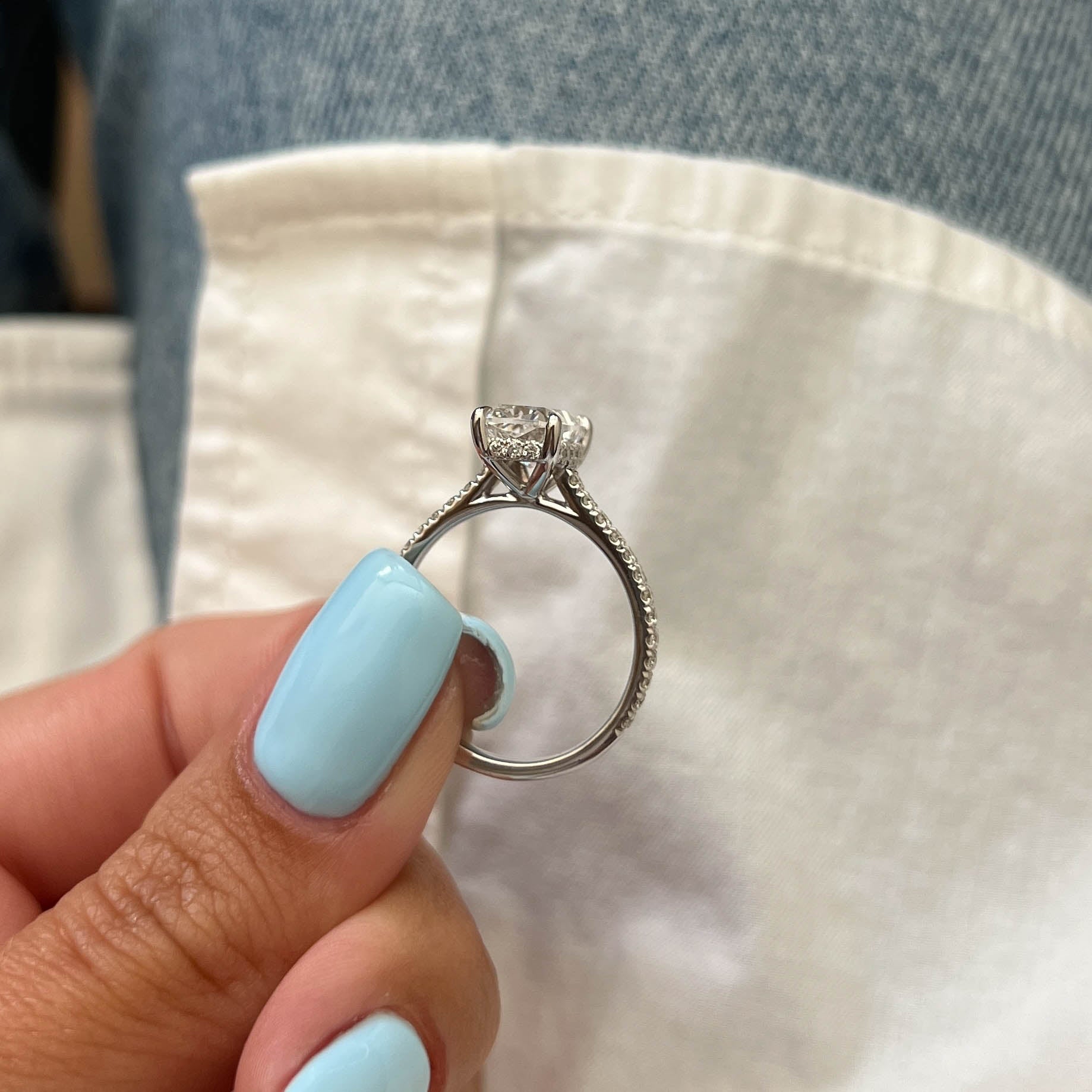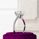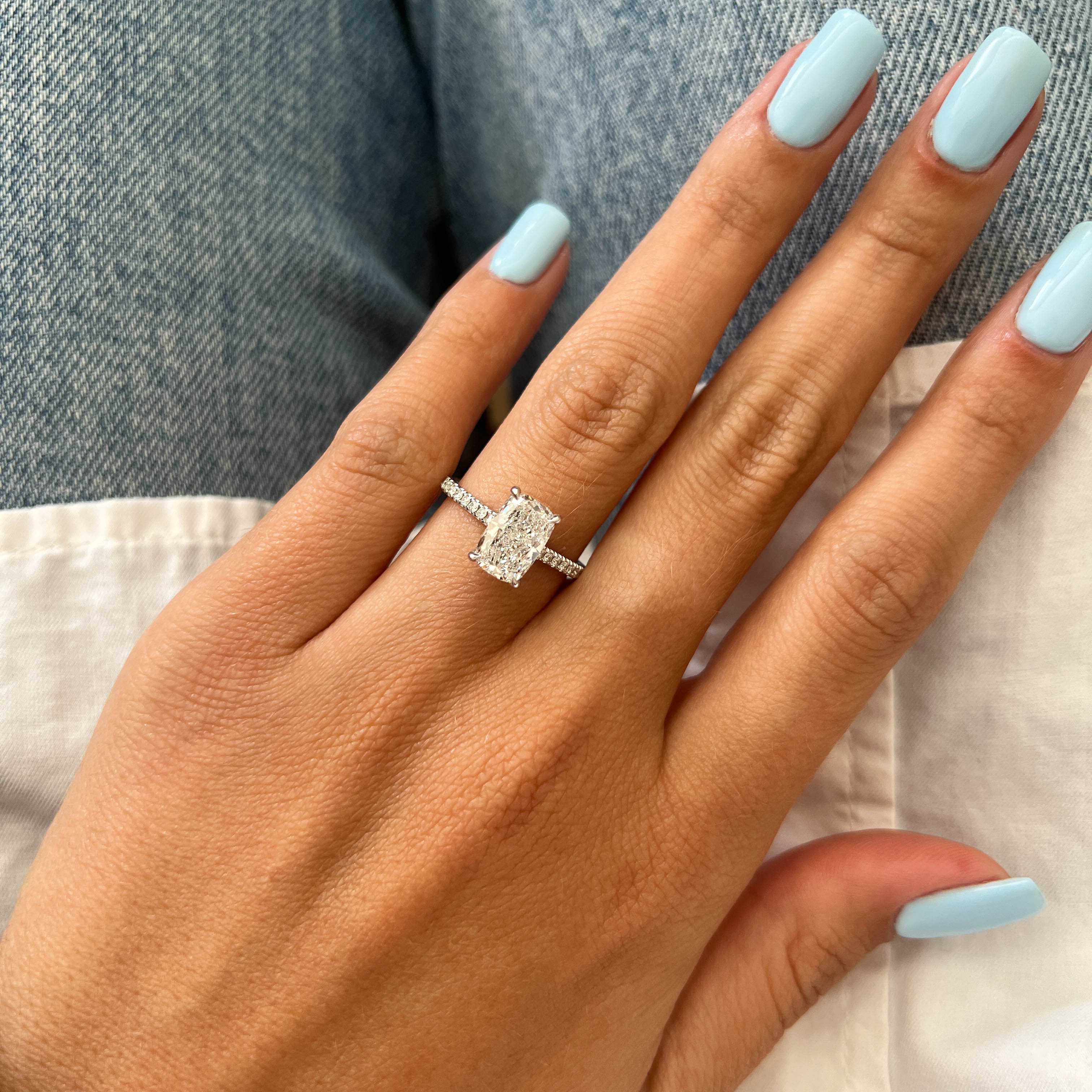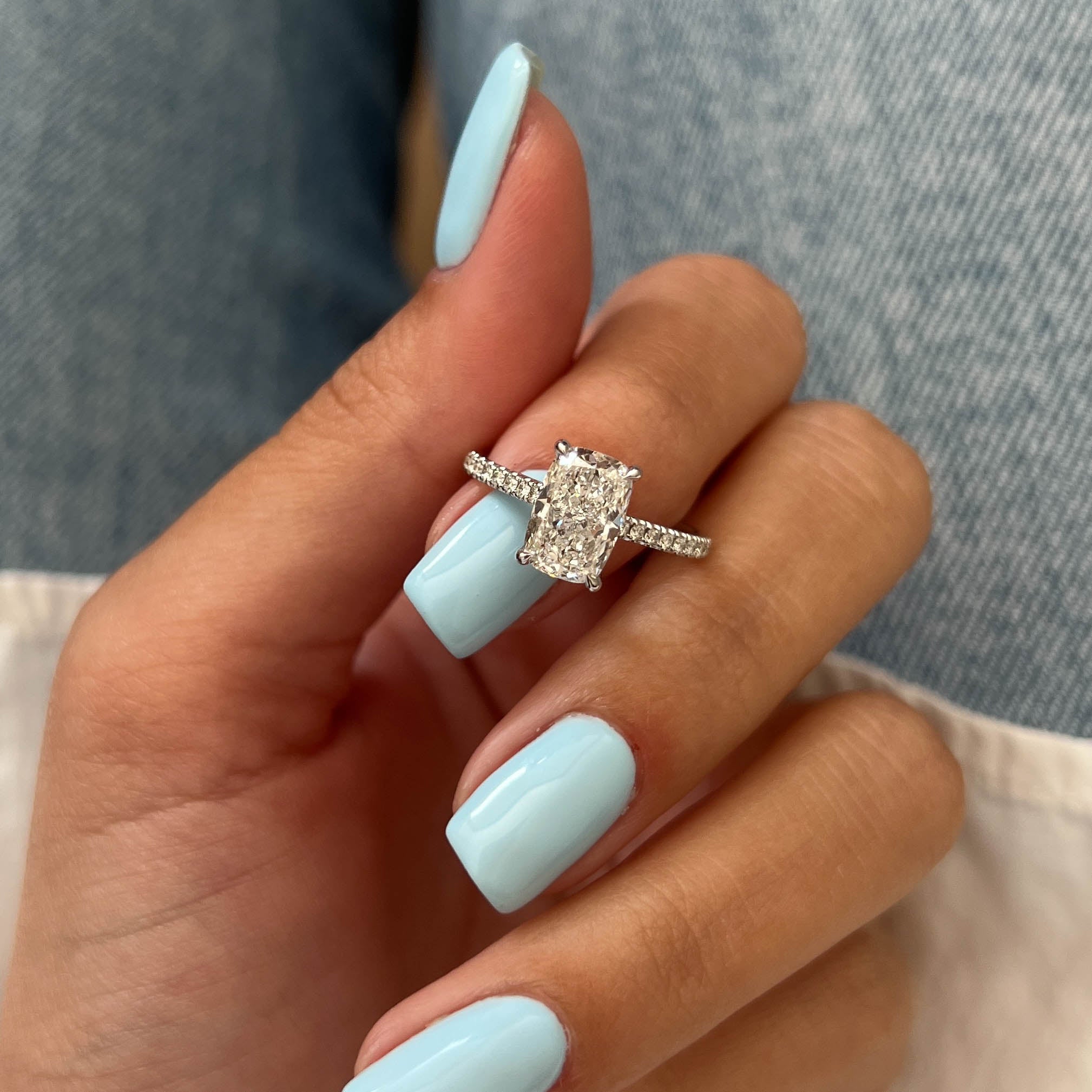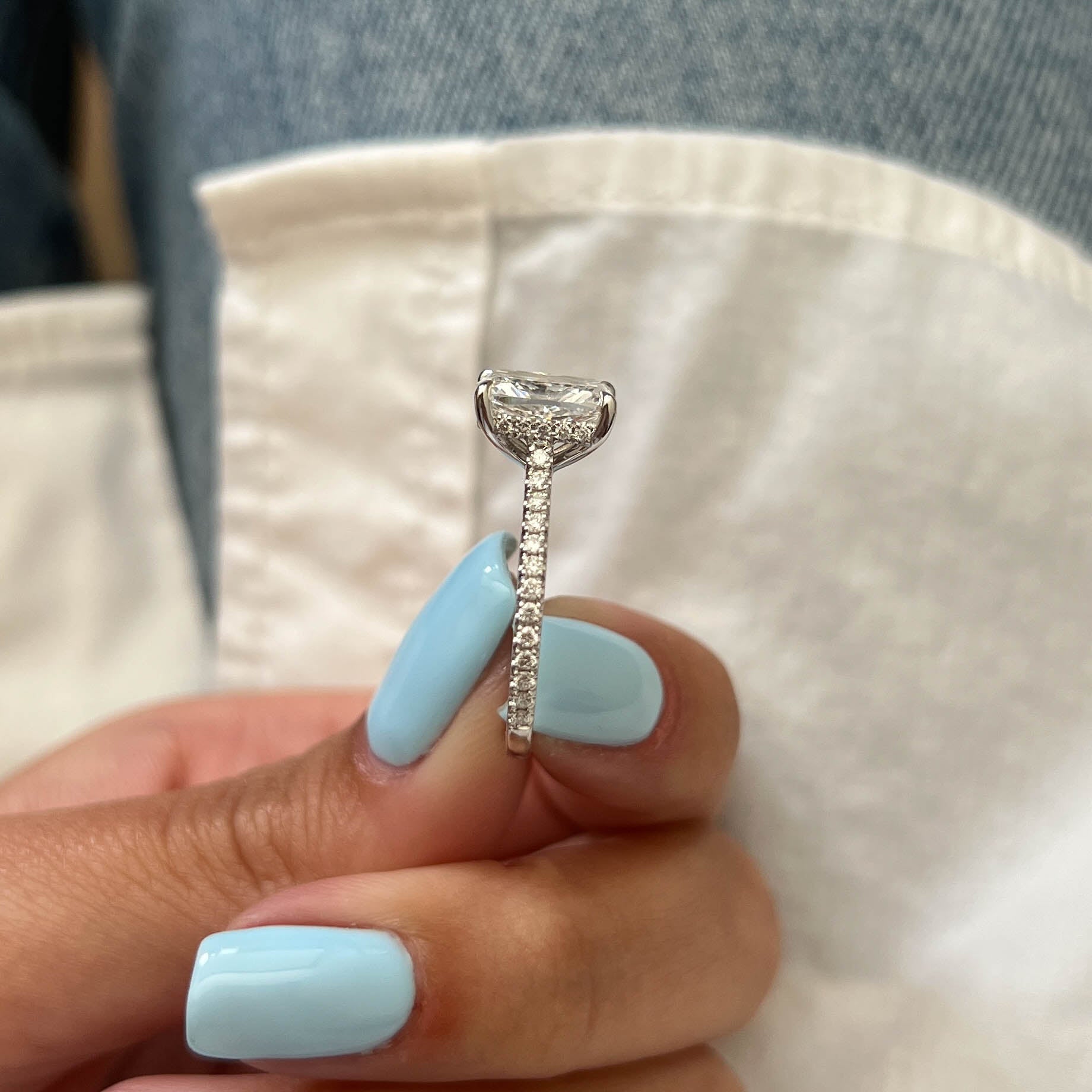 An engagement ring featuring a striking 2-carat elongated cushion-cut lab-grown diamond, elegantly set in an east-west orientation and ...