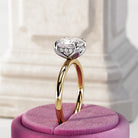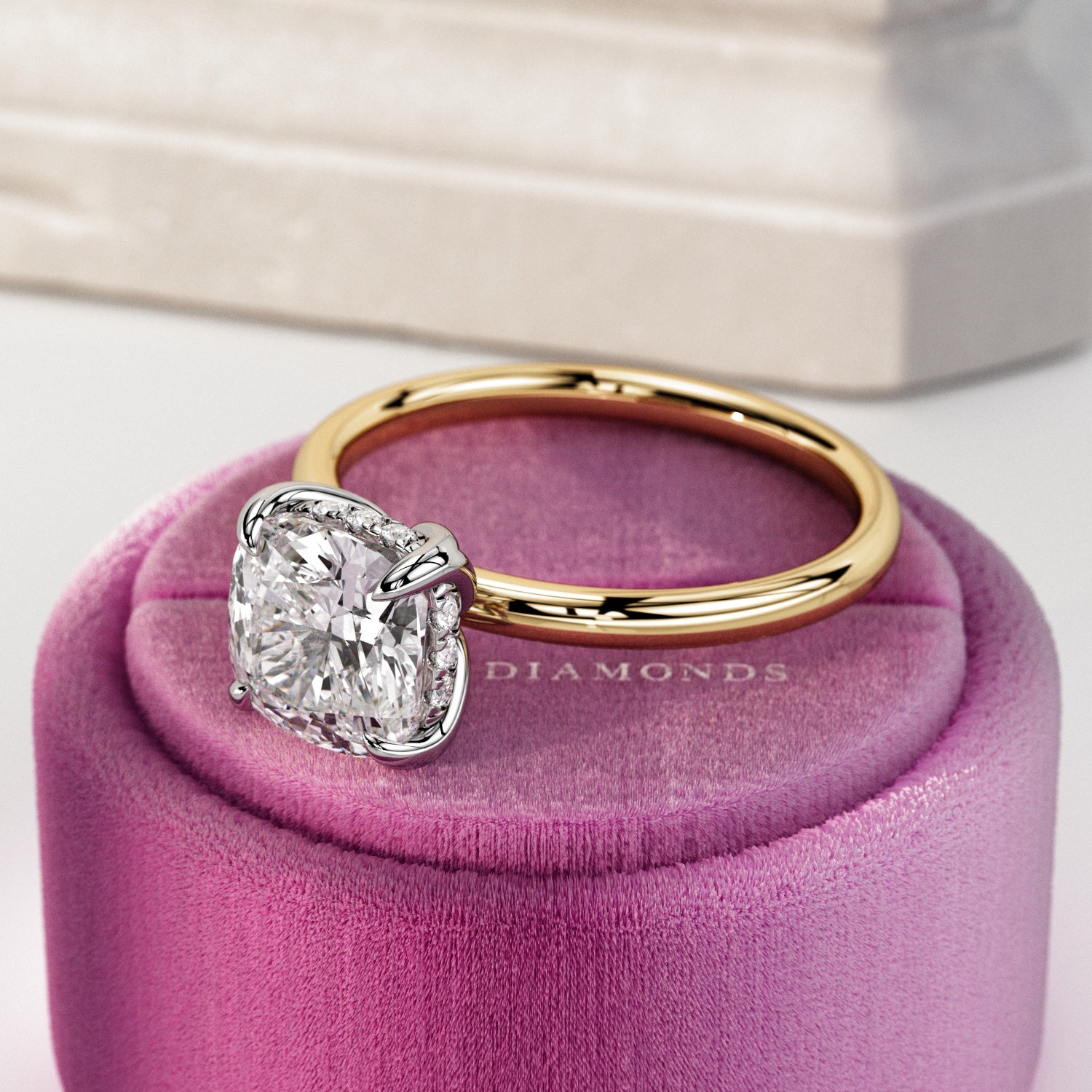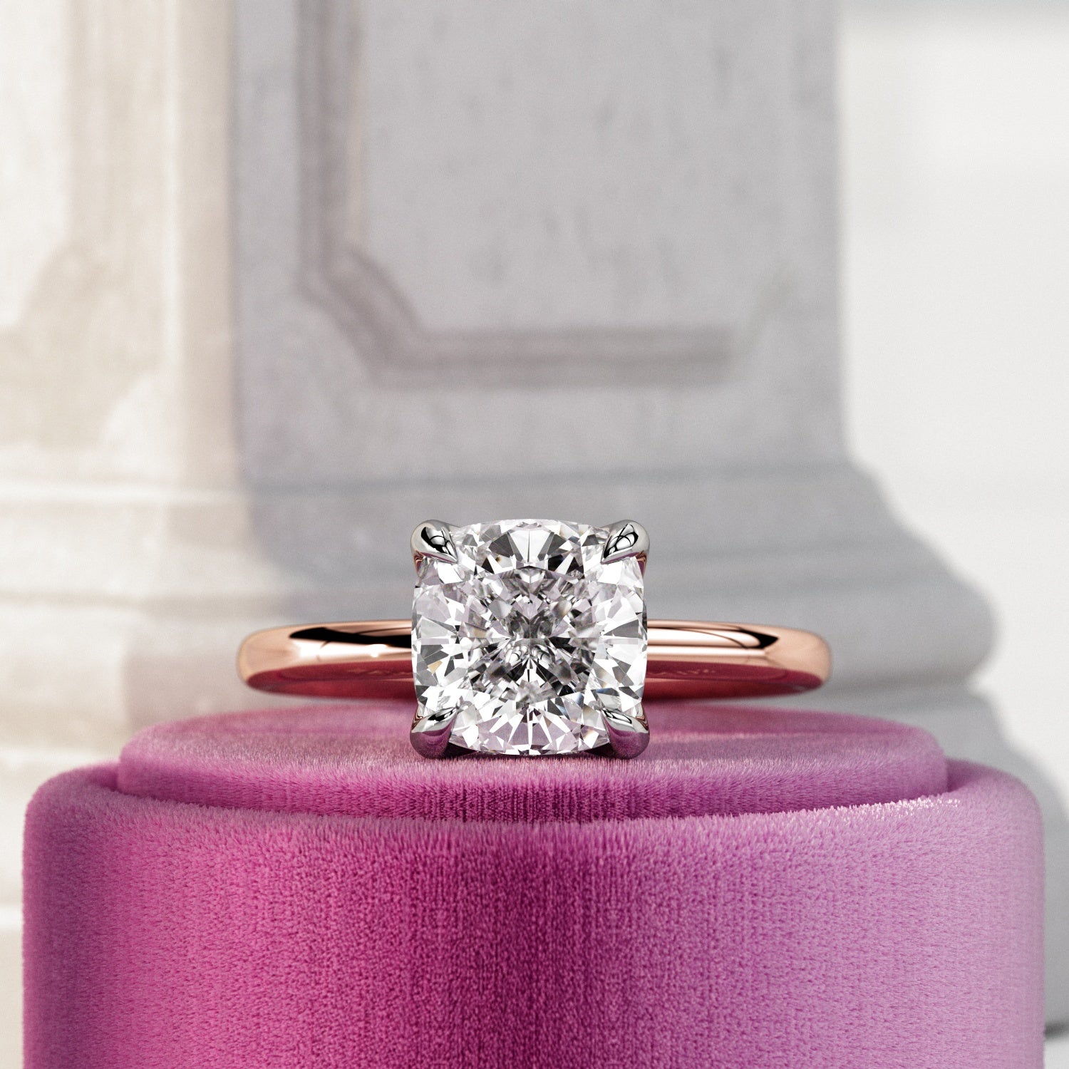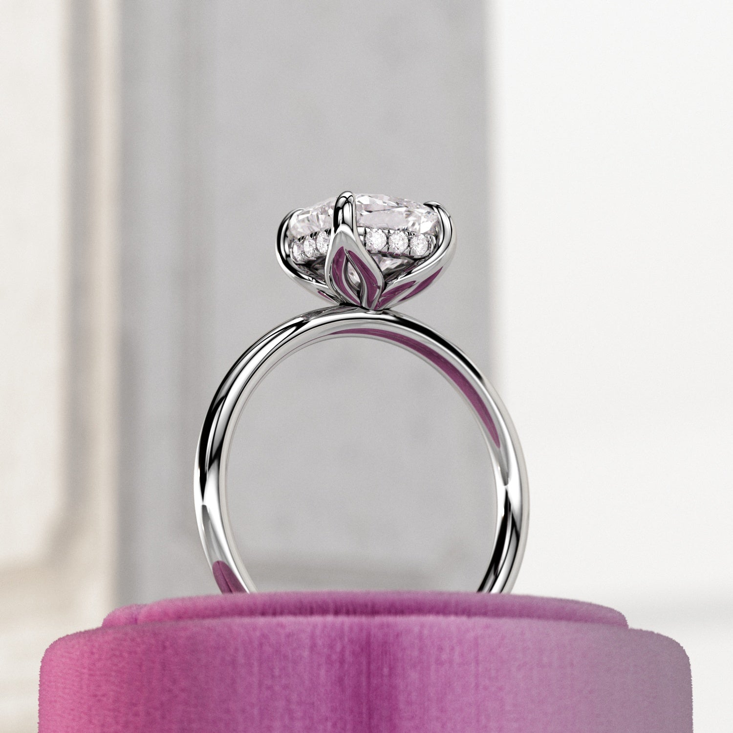 The exquisite 2-carat cushion lab-grown diamond ring features prongs designed in a delicate lotus flower pattern, adding a unique and e...