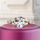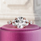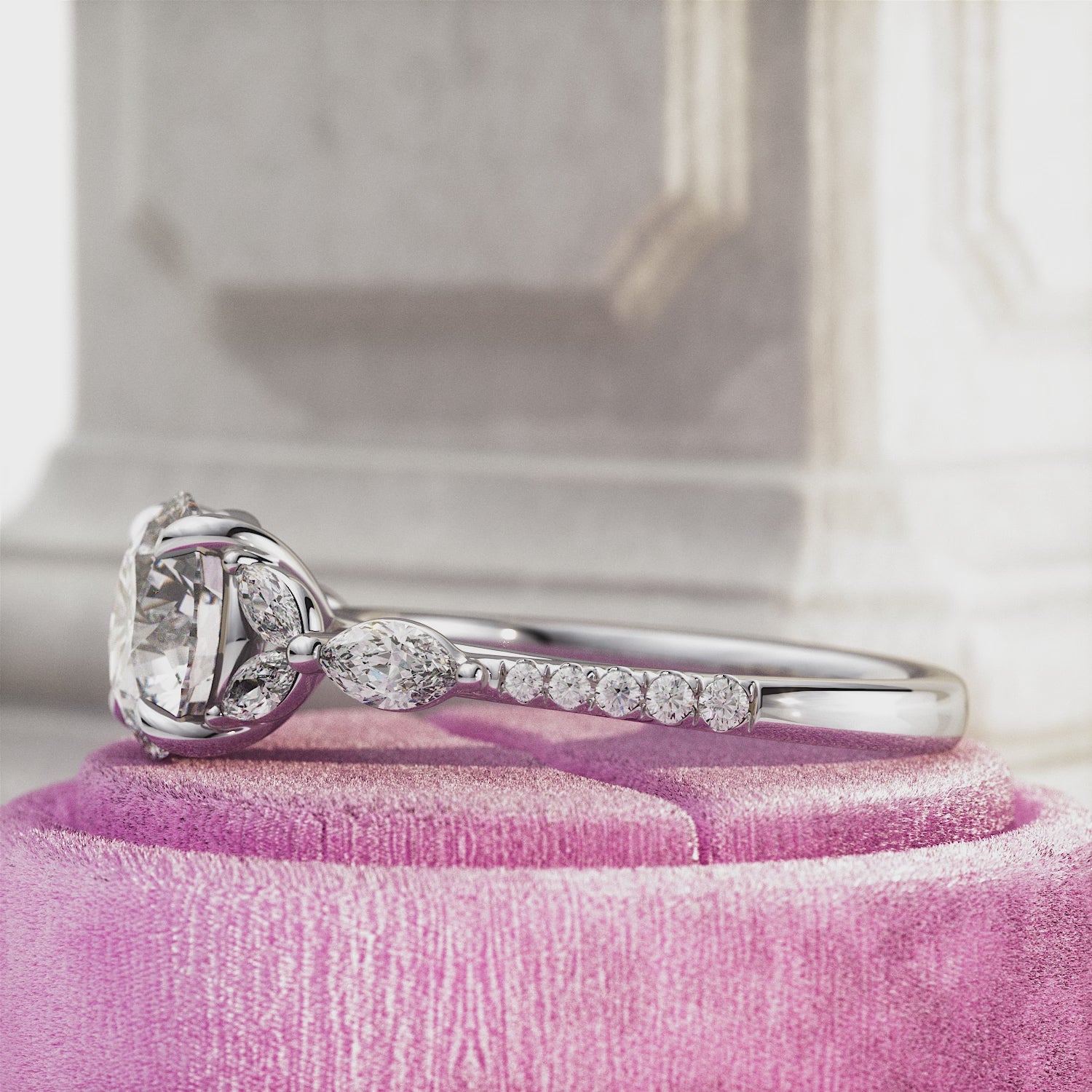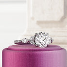 A stunning 2-carat round brilliant lab-grown diamond is set in a nature-inspired engagement ring, featuring marquise and round side dia...