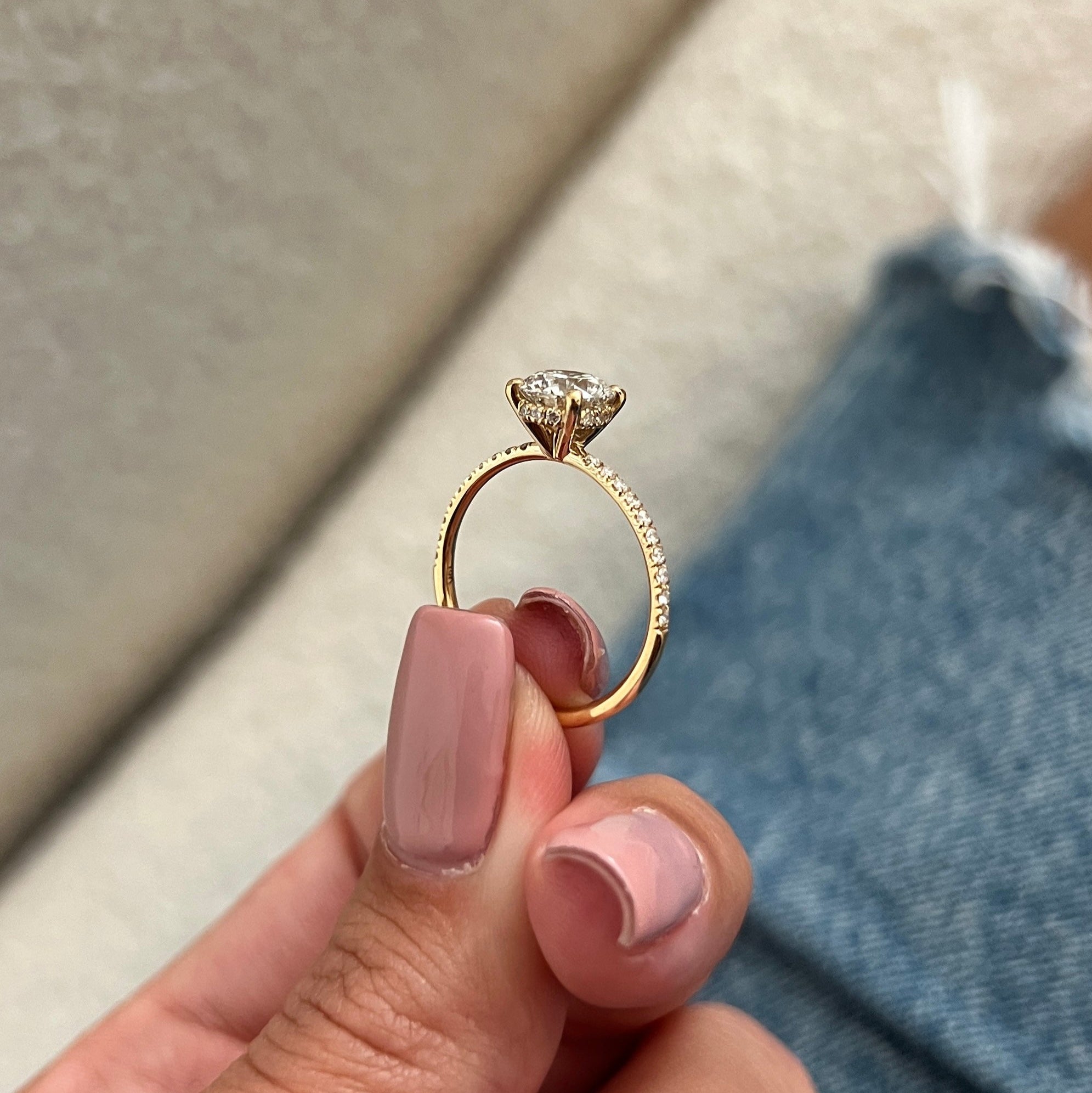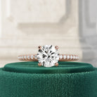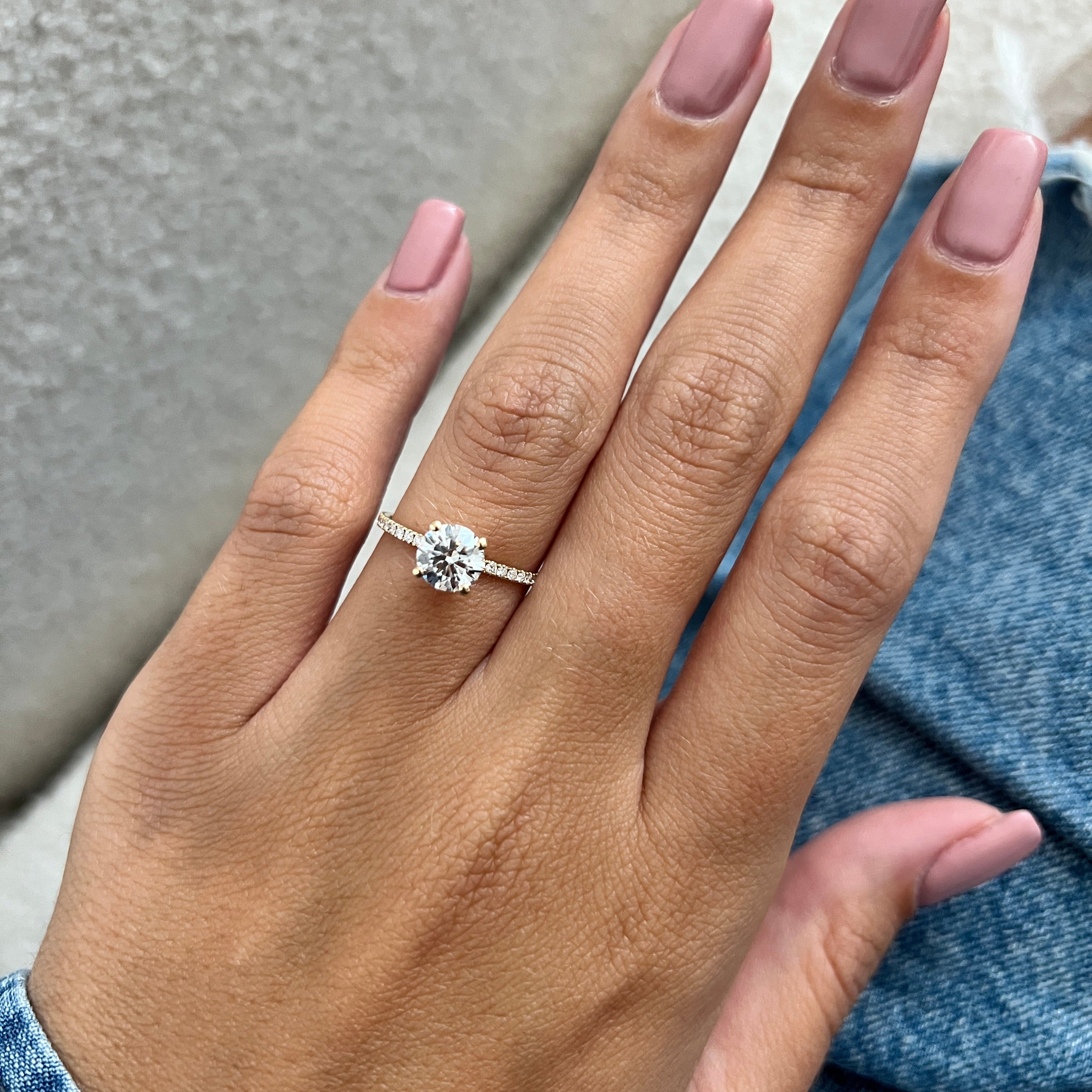 A stunning engagement ring showcasing a 1 carat round brilliant lab-grown CVD diamond in a four-prong setting. Micro pavé diamonds line...