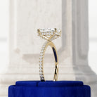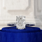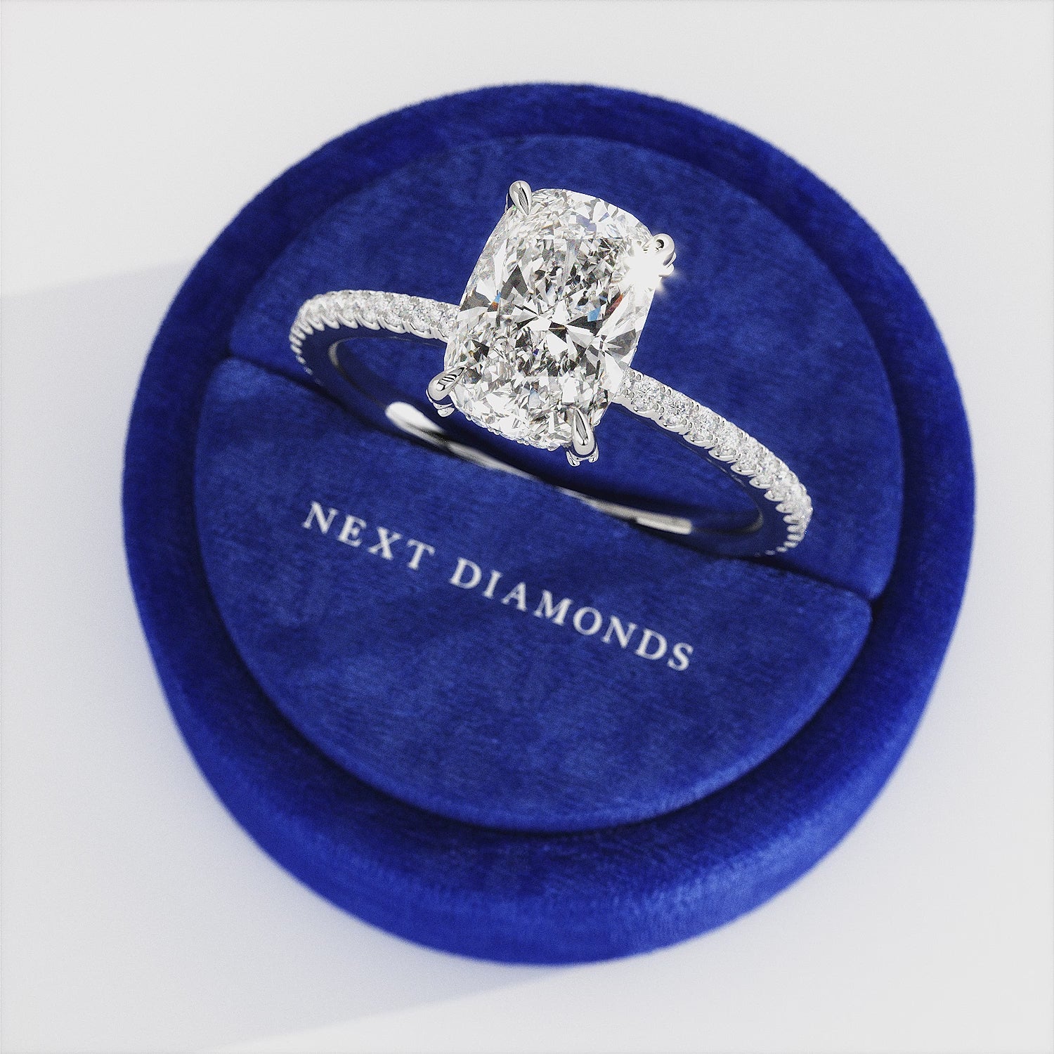 This exquisite engagement ring is adorned with diamonds at every turn. Featuring a prominent 2-carat elongated cushion lab-grown diamon...