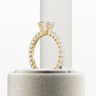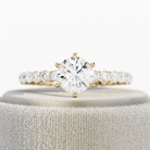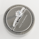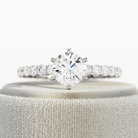 A uniquely designed engagement ring is a true standout, featuring a 1.0-carat center stone securely held by six prongs. The band is ado...