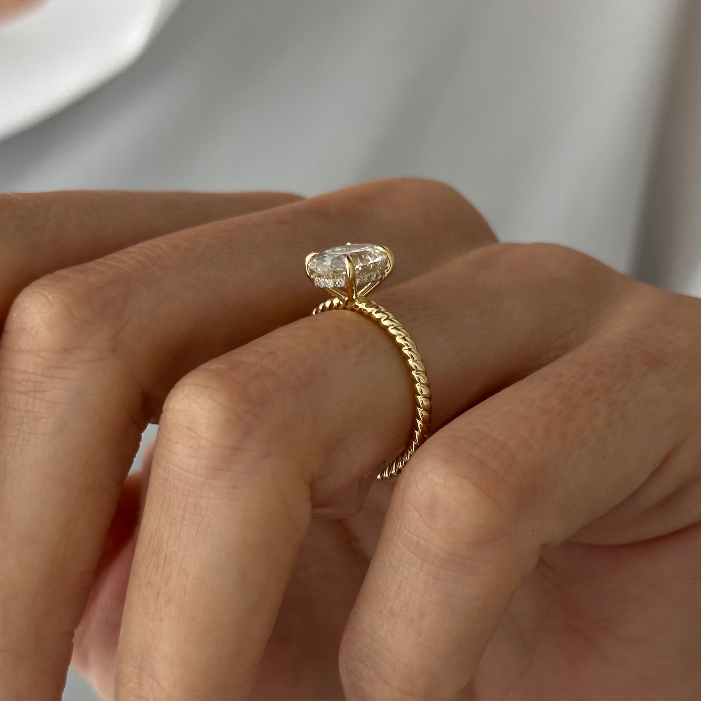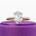 Featuring a dainty 2 carat oval lab-grown diamond that radiates with brilliance, it is held in a stunning twisted rope shank design tha...