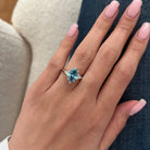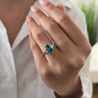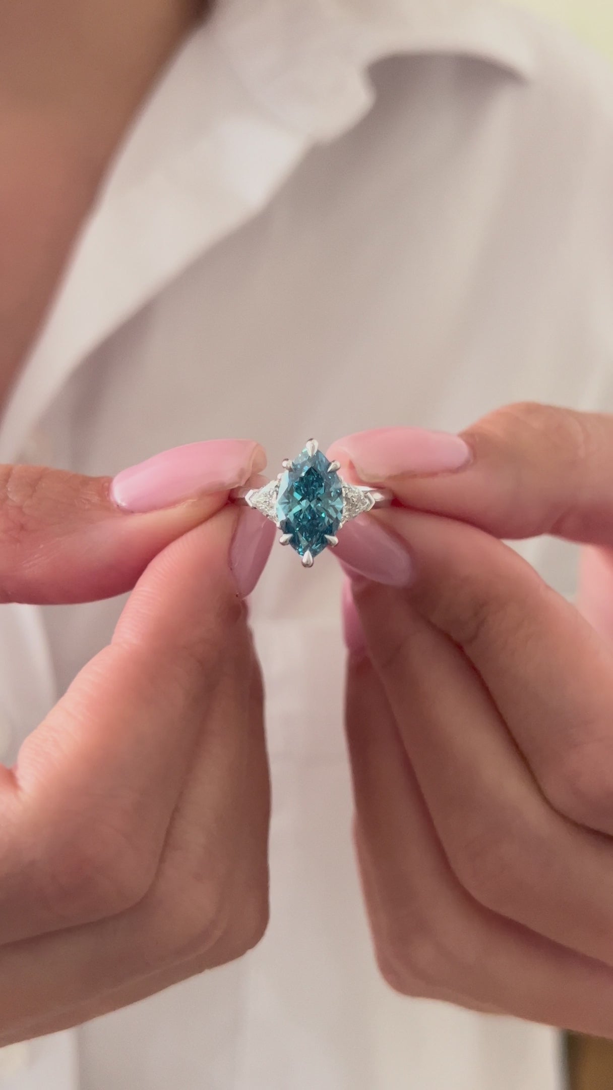 A remarkable 2-carat marquise fancy vivid blue lab-grown diamond ring, set in a classic three-stone design with six dainty claw prongs....