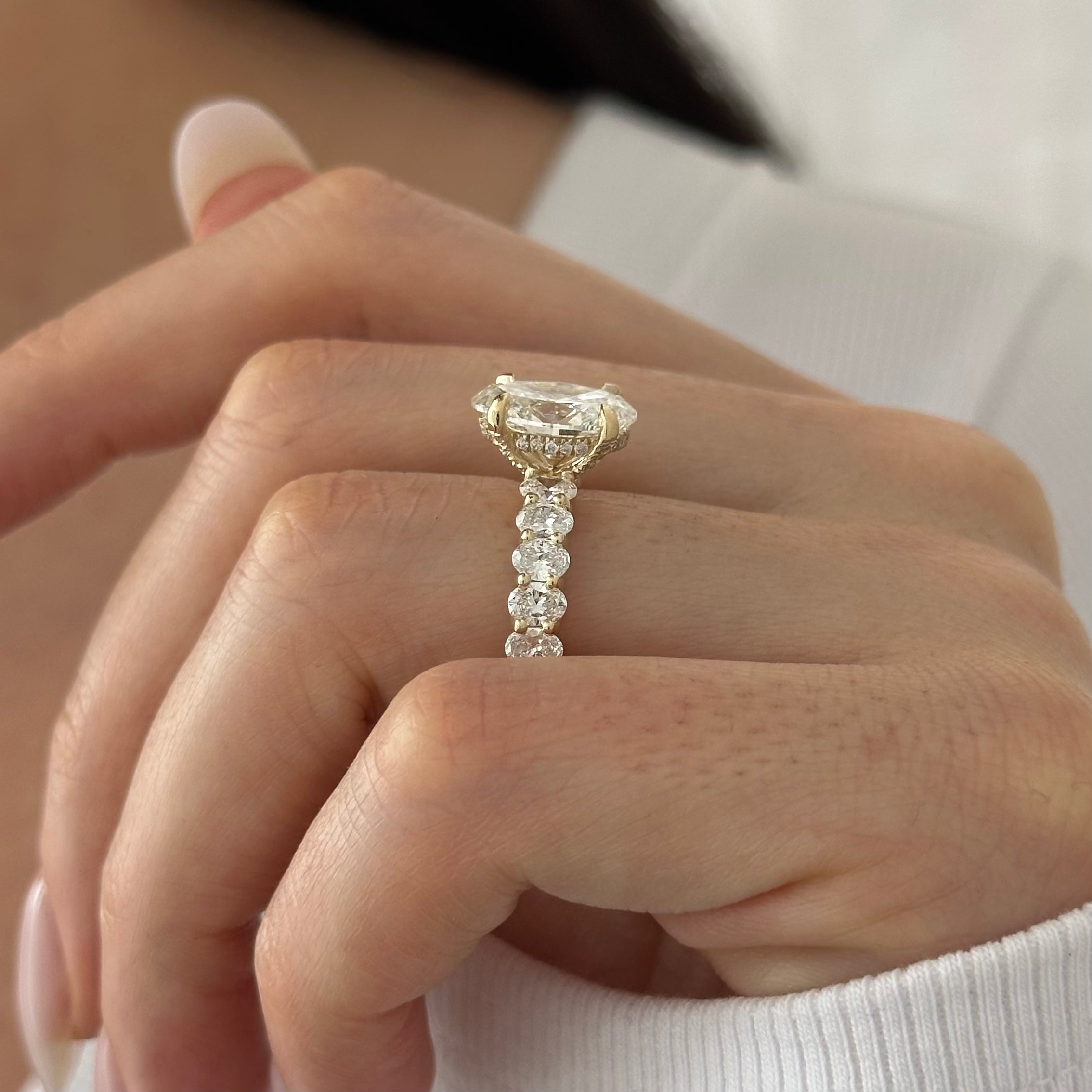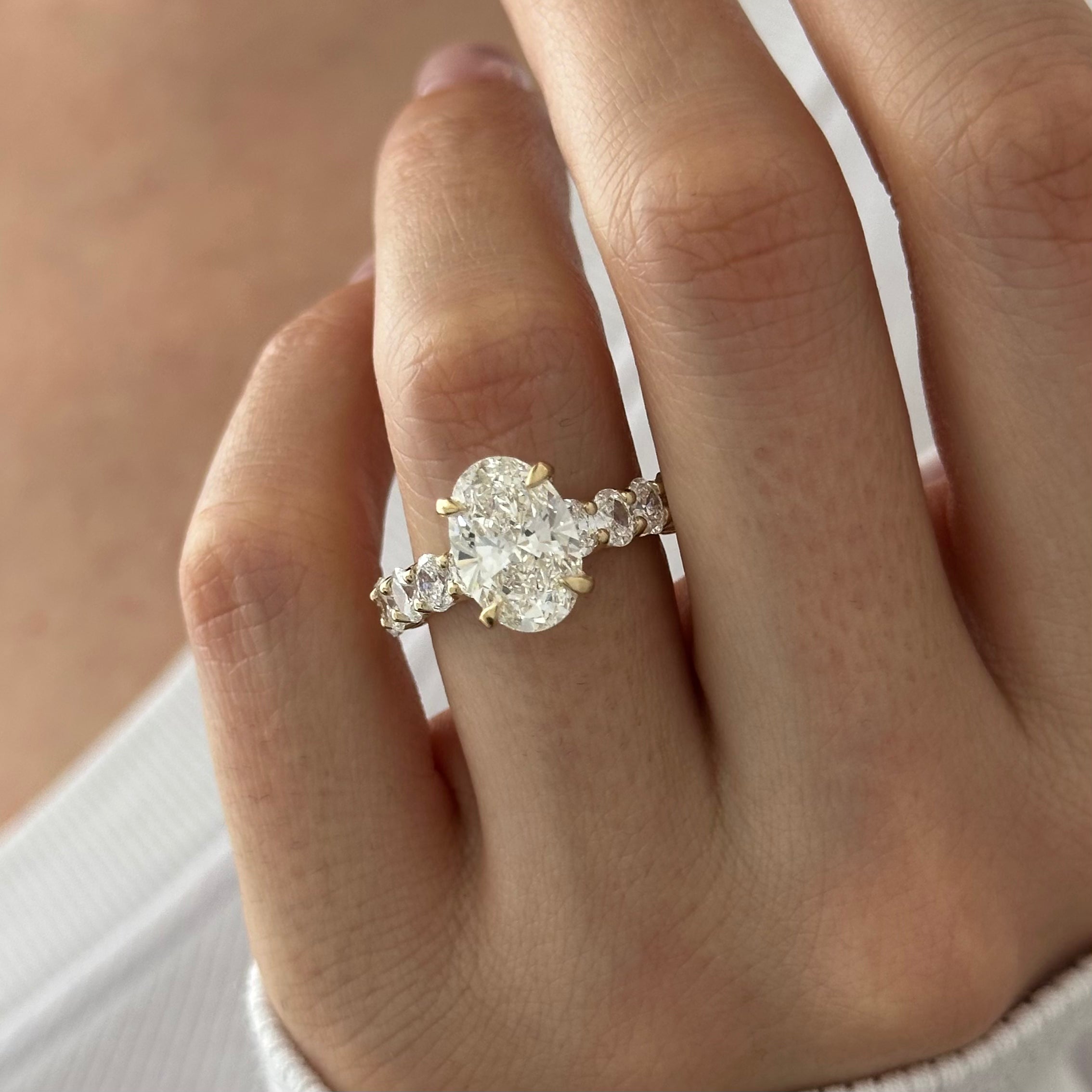 This exquisite ring boasts a striking 3 carat oval lab grown diamond as its centerpiece, exhibiting unparalleled brilliance and fire. E...