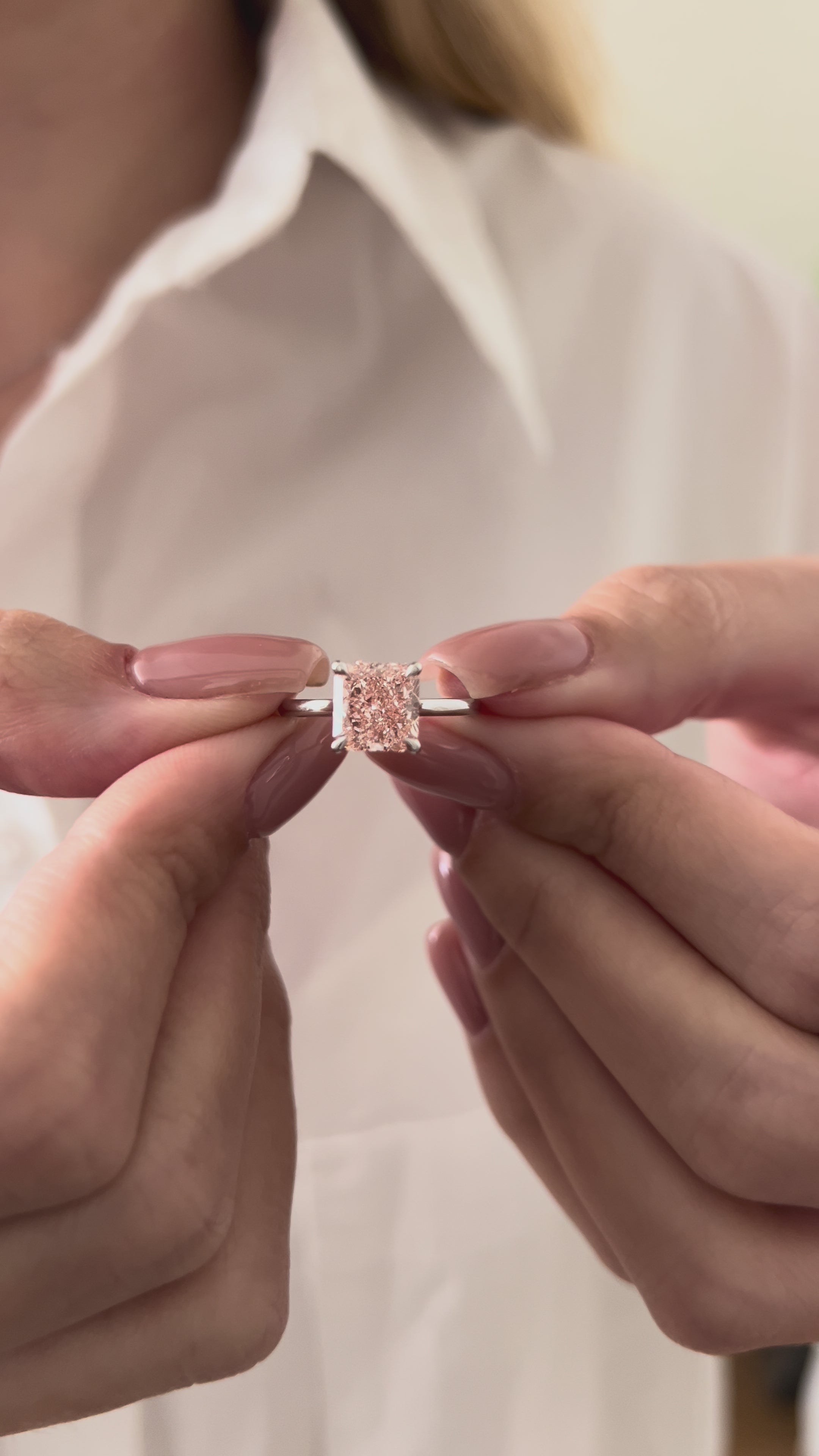 A captivating 2-carat square radiant fancy vivid pink lab-grown diamond ring, delicately set in a classic solitaire design featuring fo...