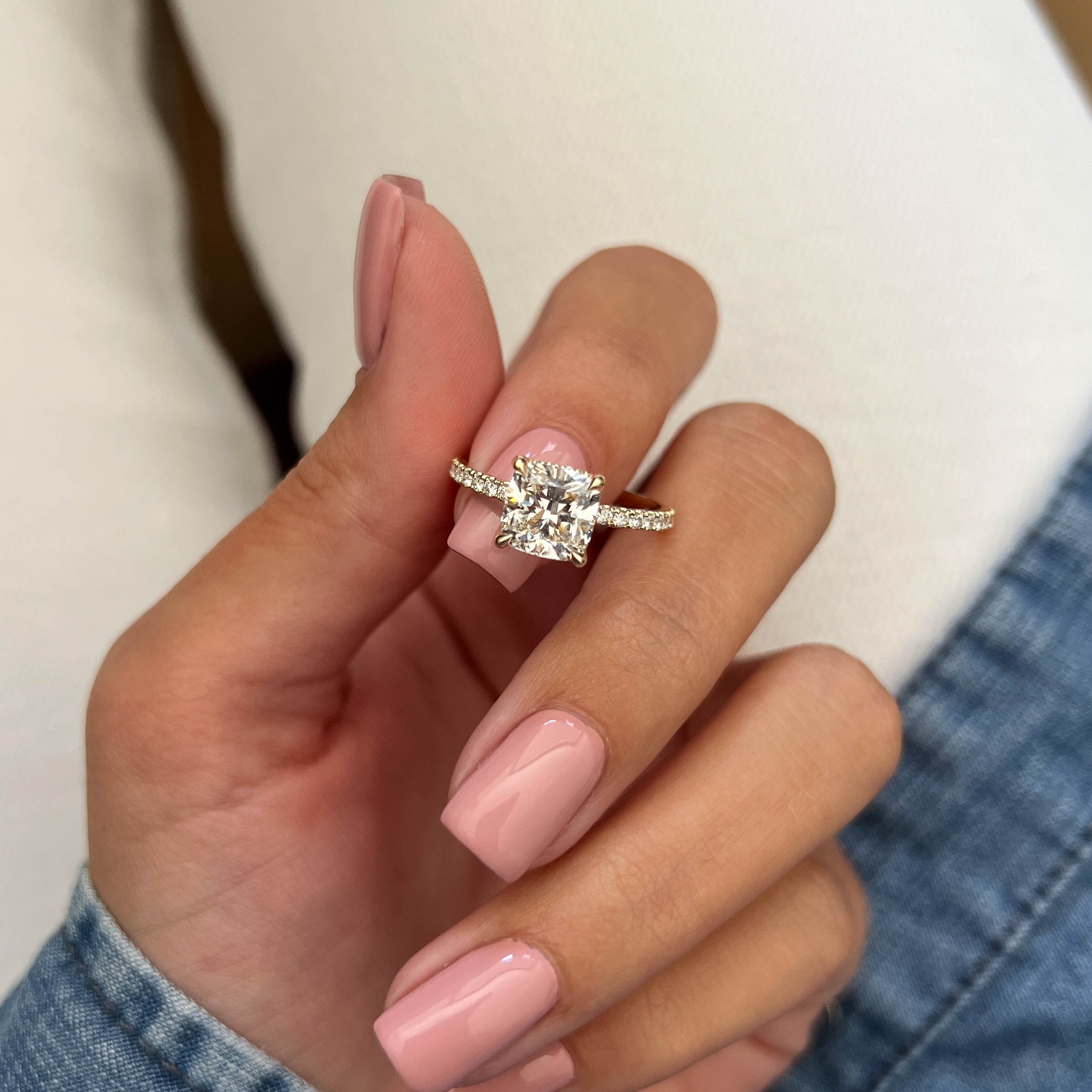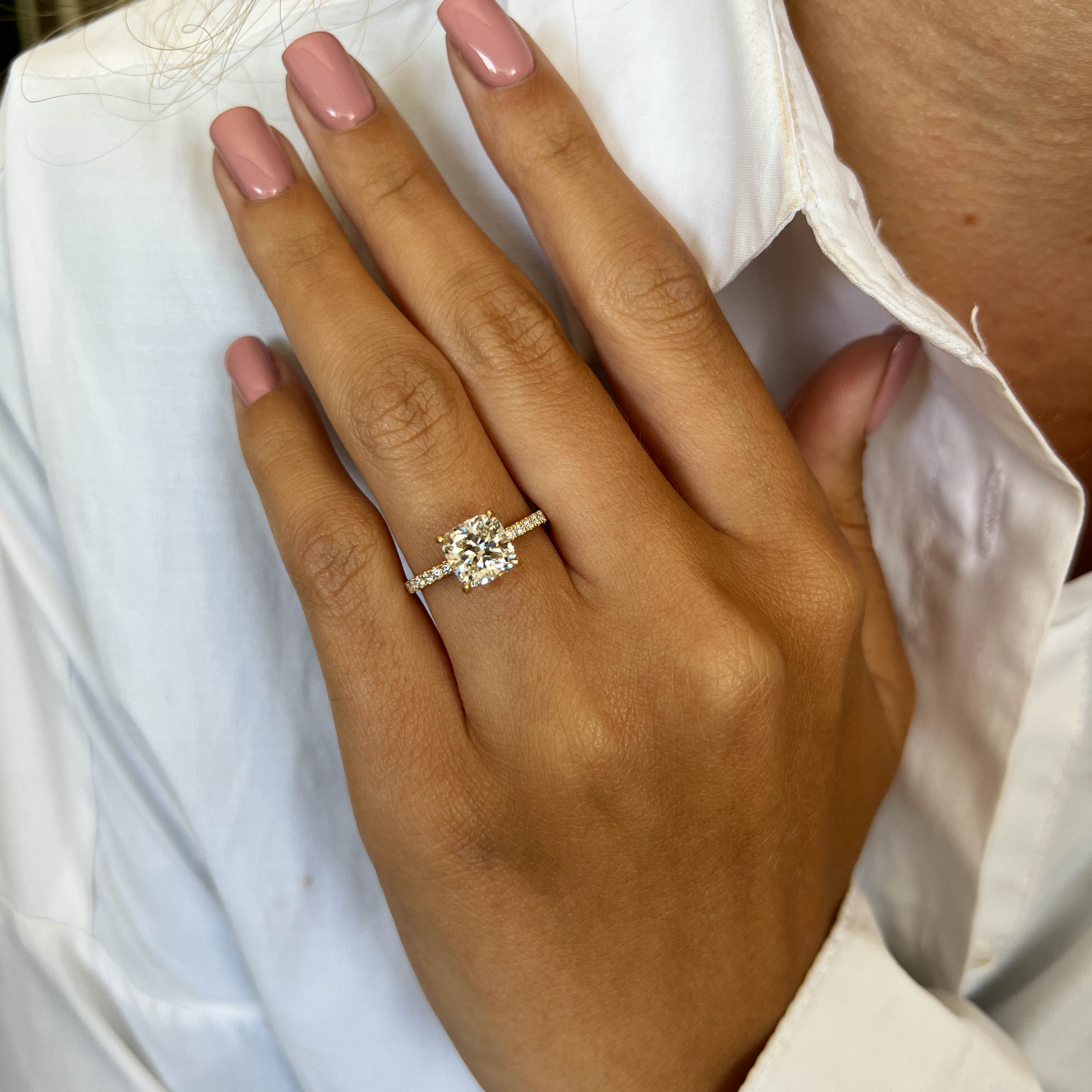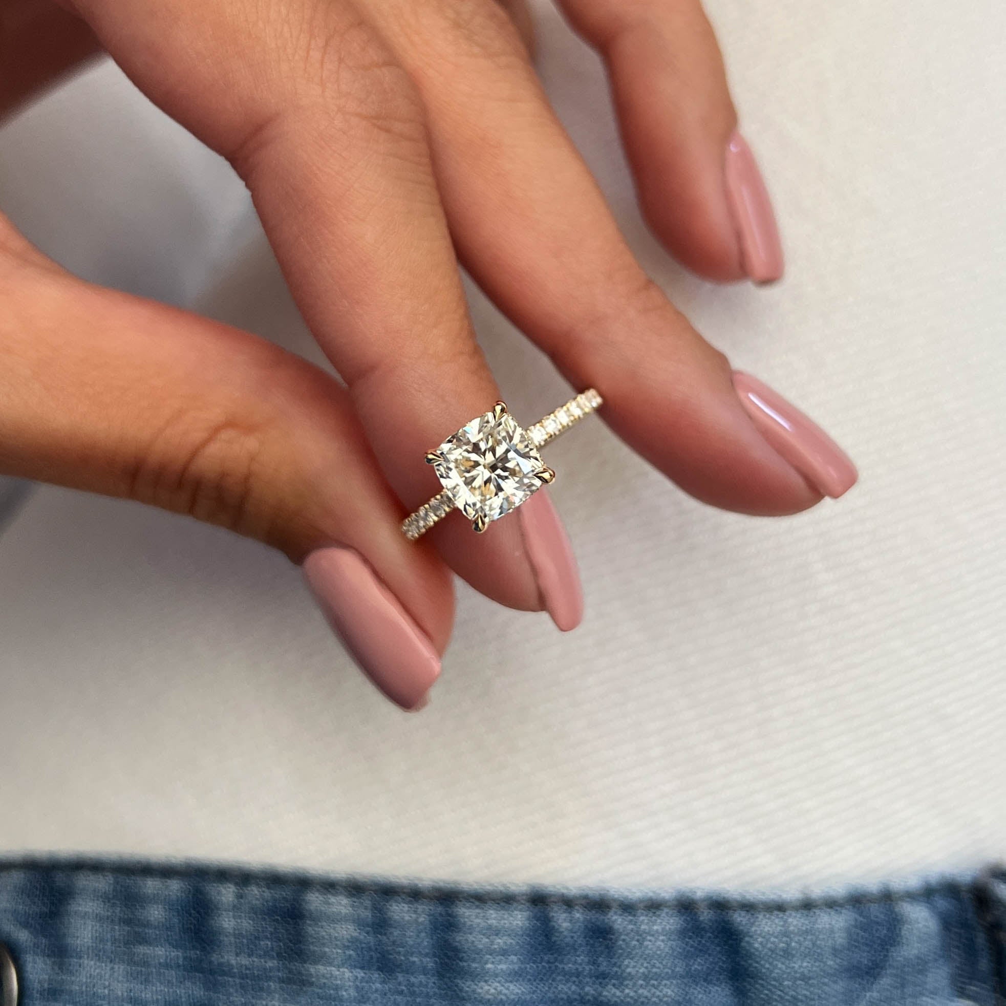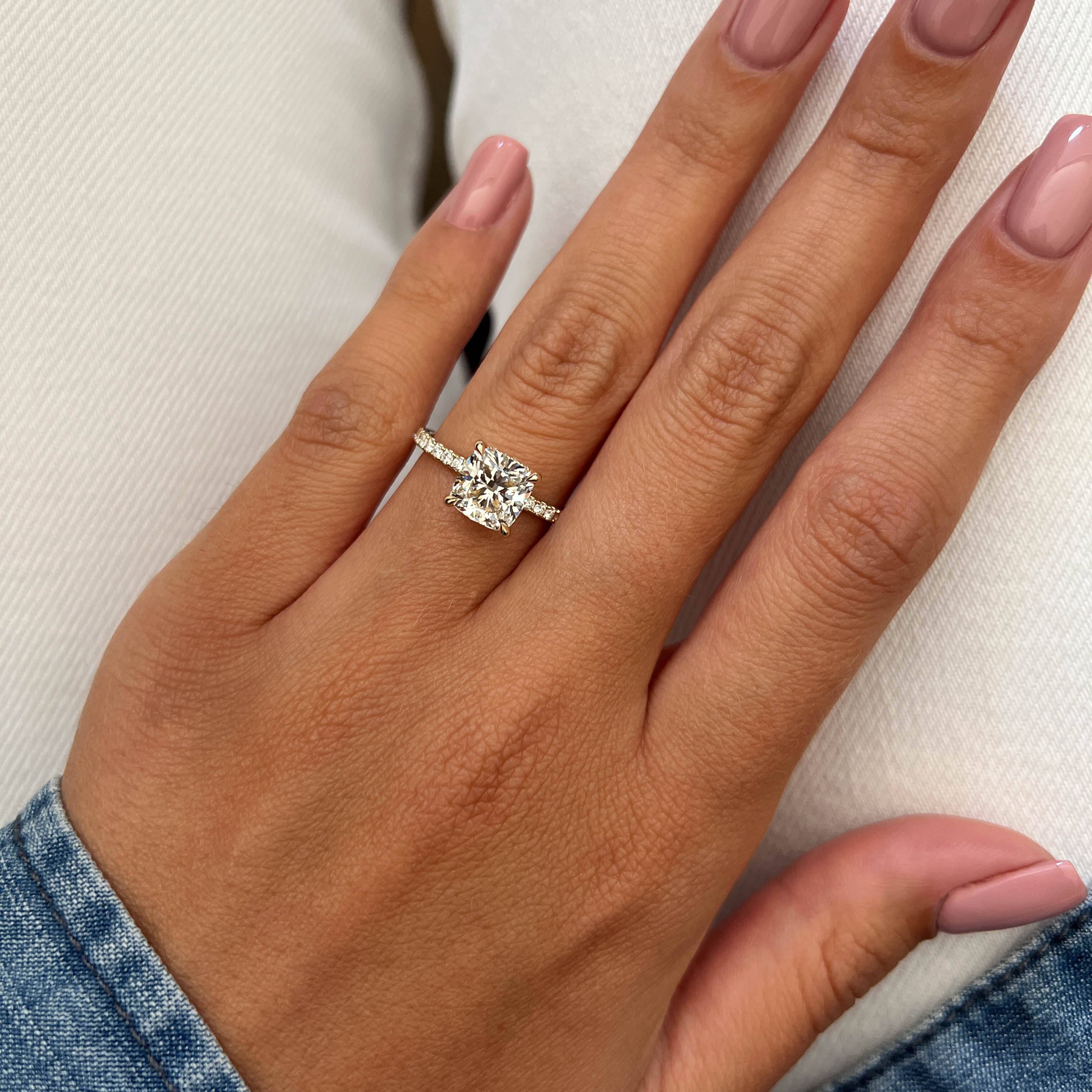 A classic engagement ring features a dazzling 2-carat cushion lab-grown diamond at its center, accented by a delicate hidden halo for a...