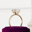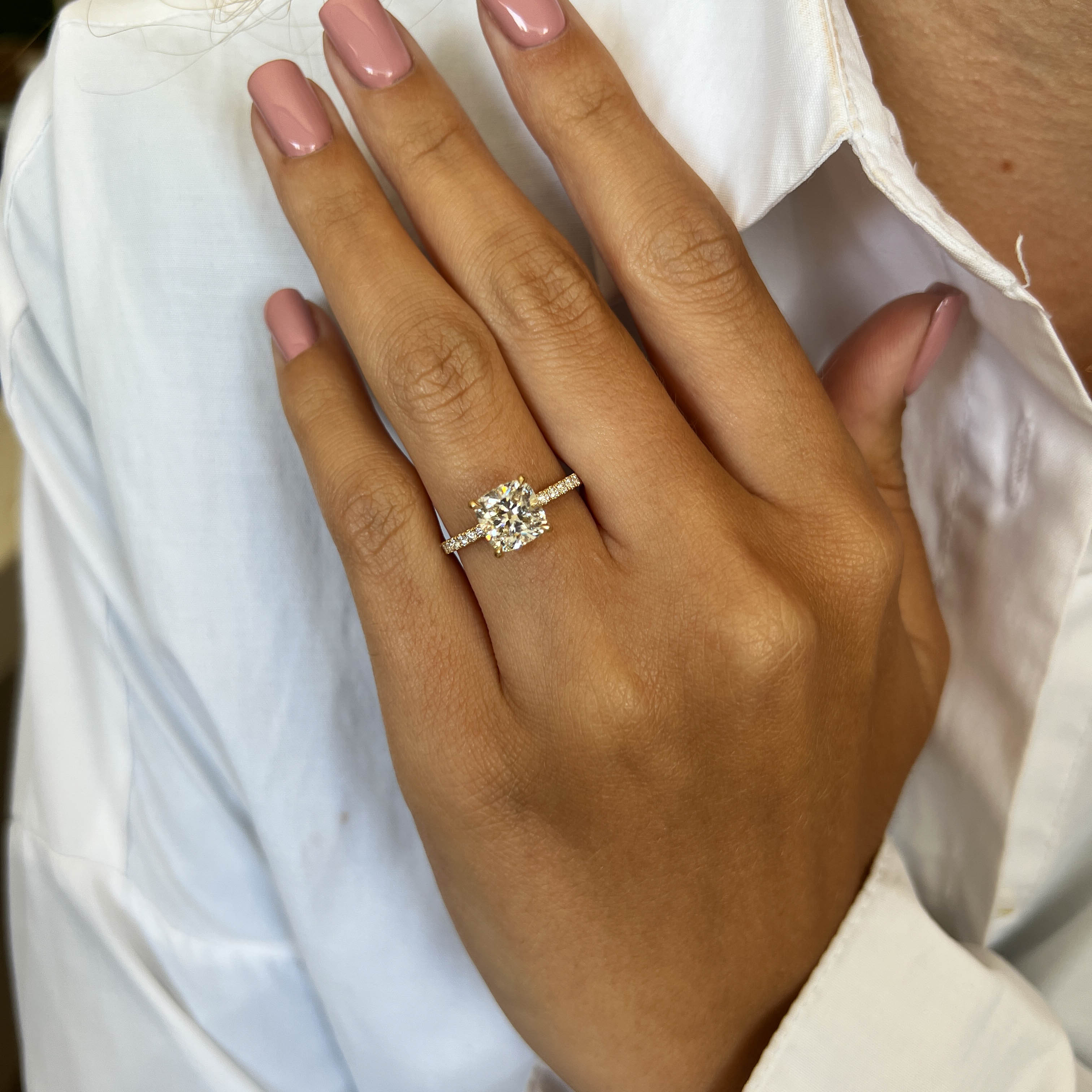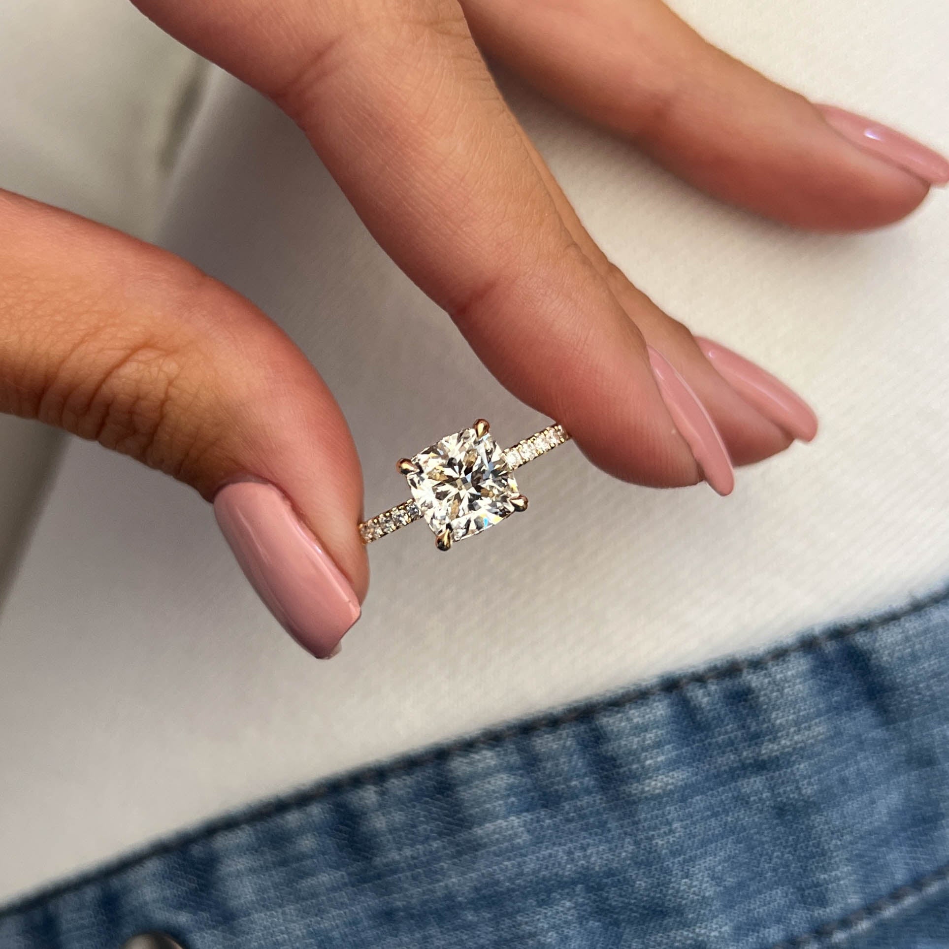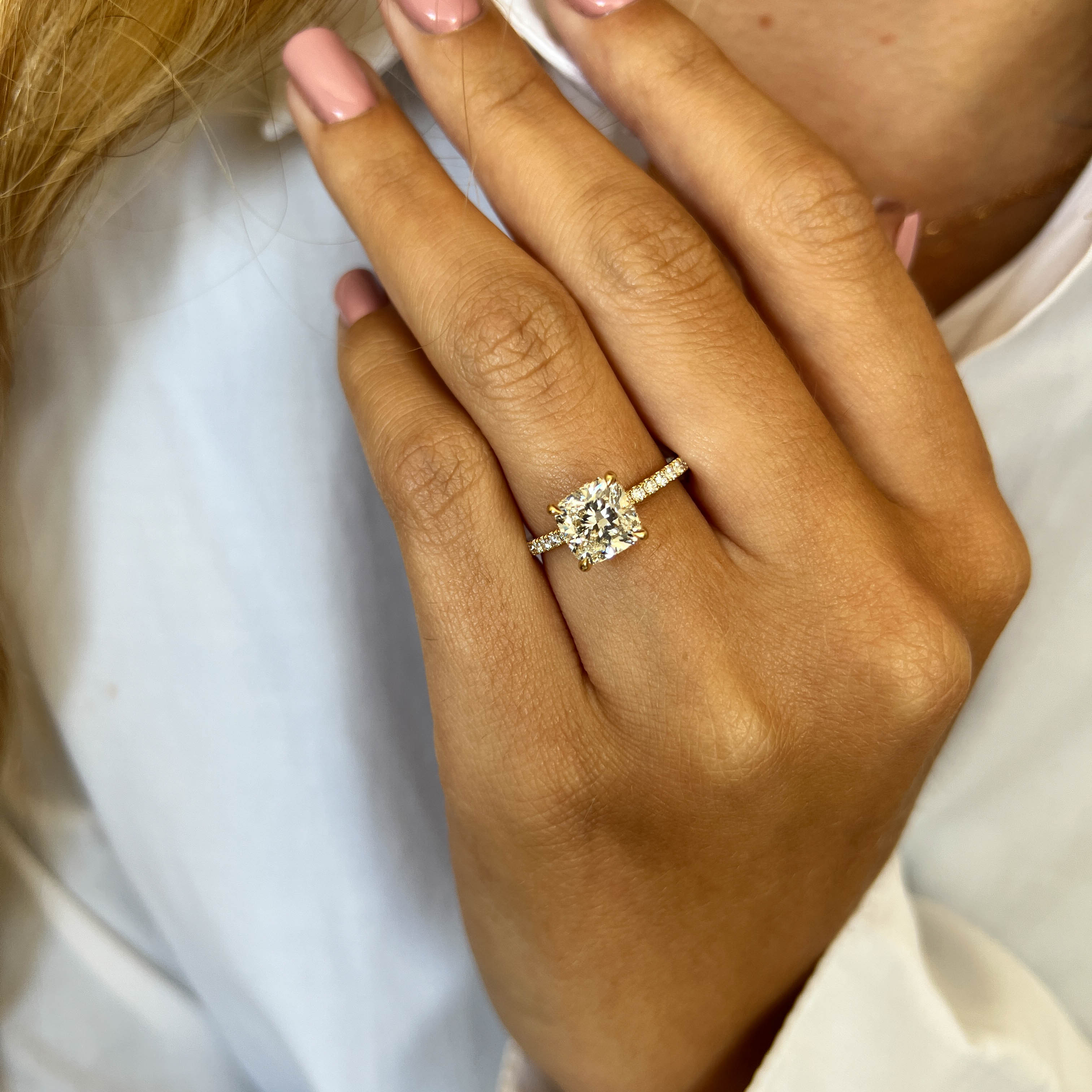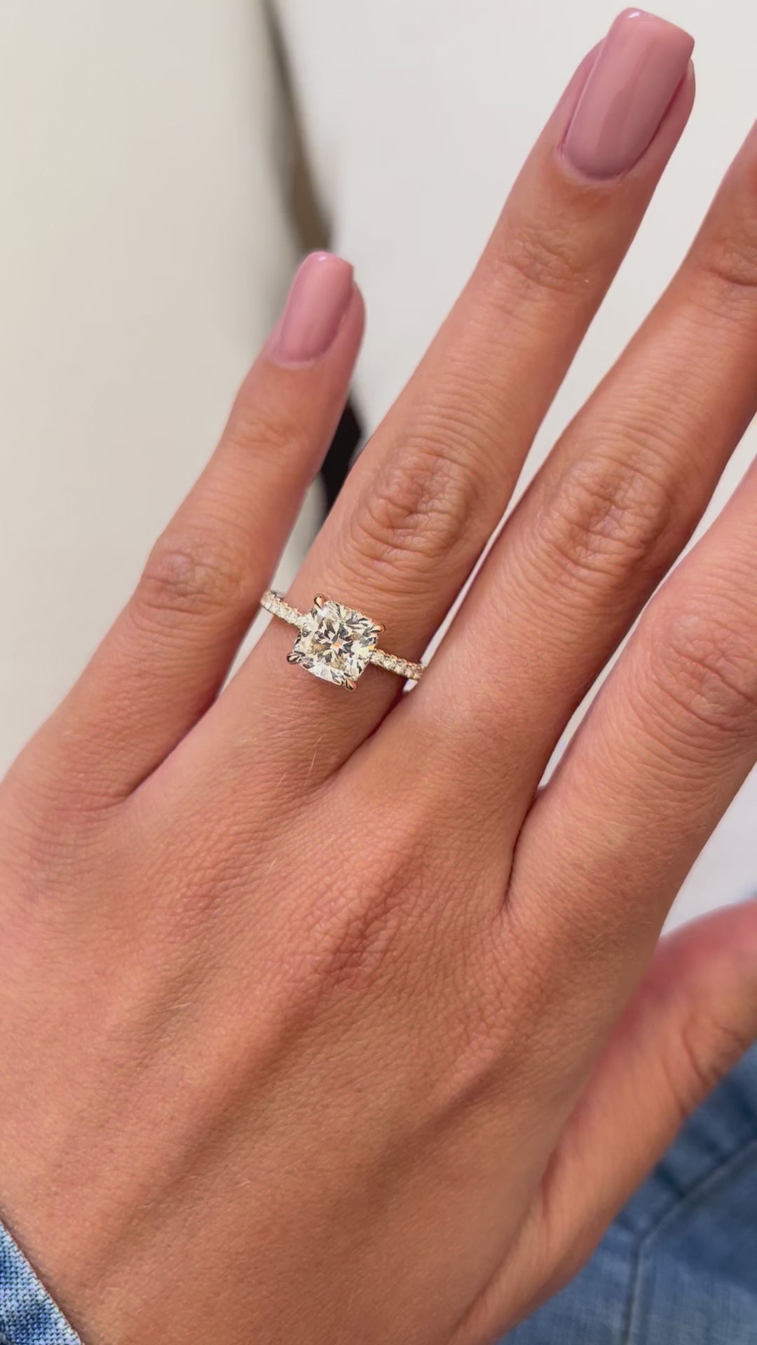 A classic engagement ring features a dazzling 2-carat cushion lab-grown diamond at its center, accented by a delicate hidden halo for a...