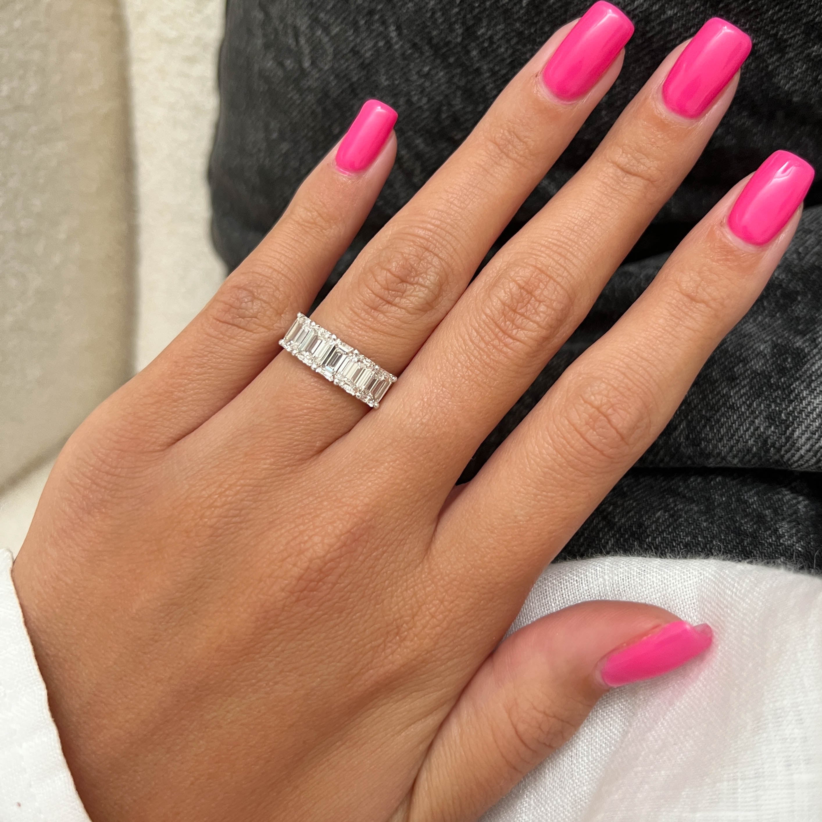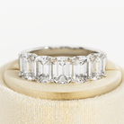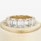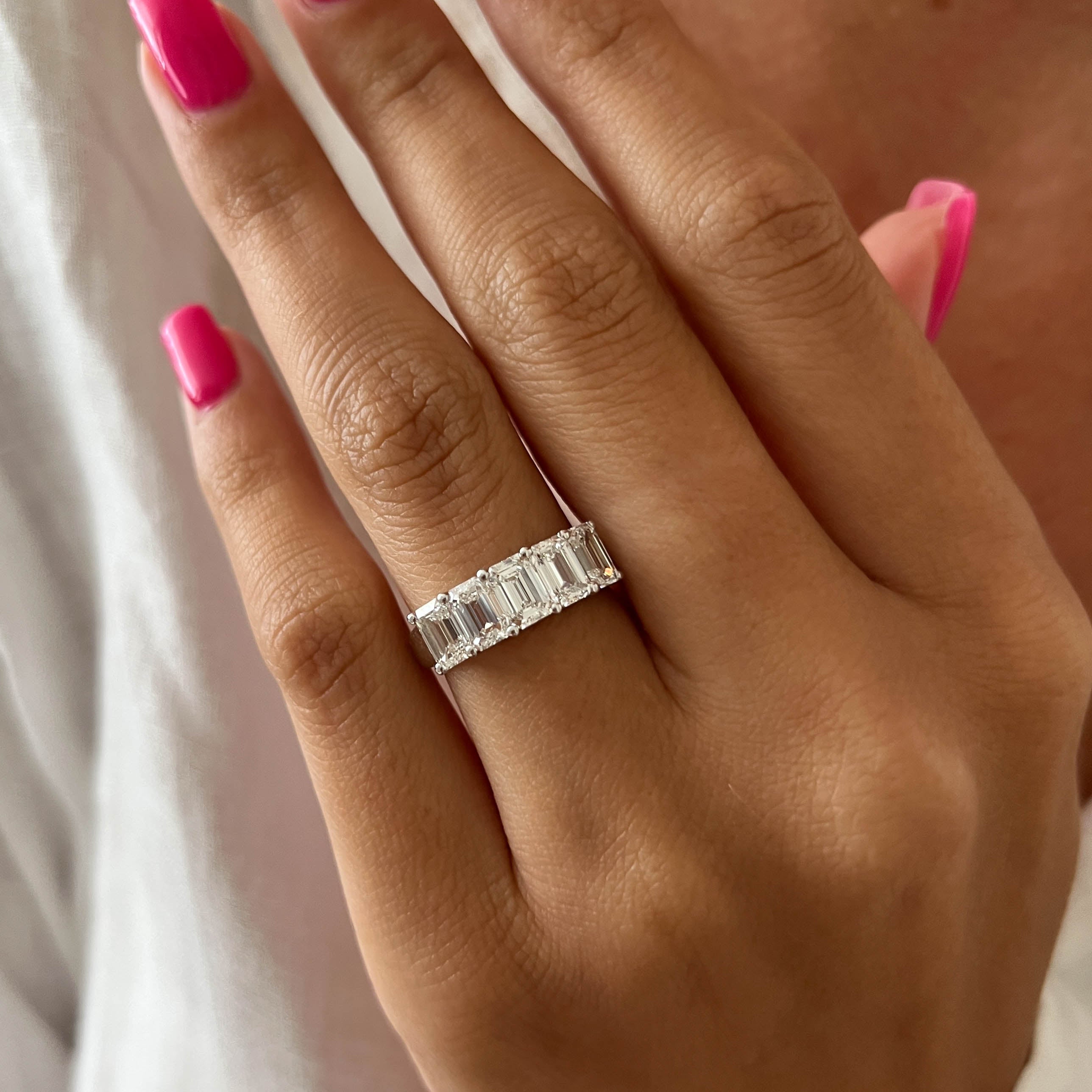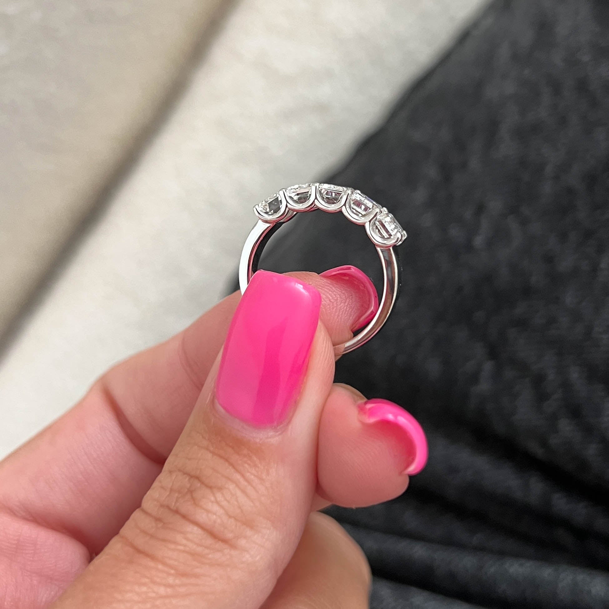 A stunning five-stone band showcases a total carat weight of 2.5, with each emerald-cut lab-grown diamond weighing 0.5 carats. The U-sh...