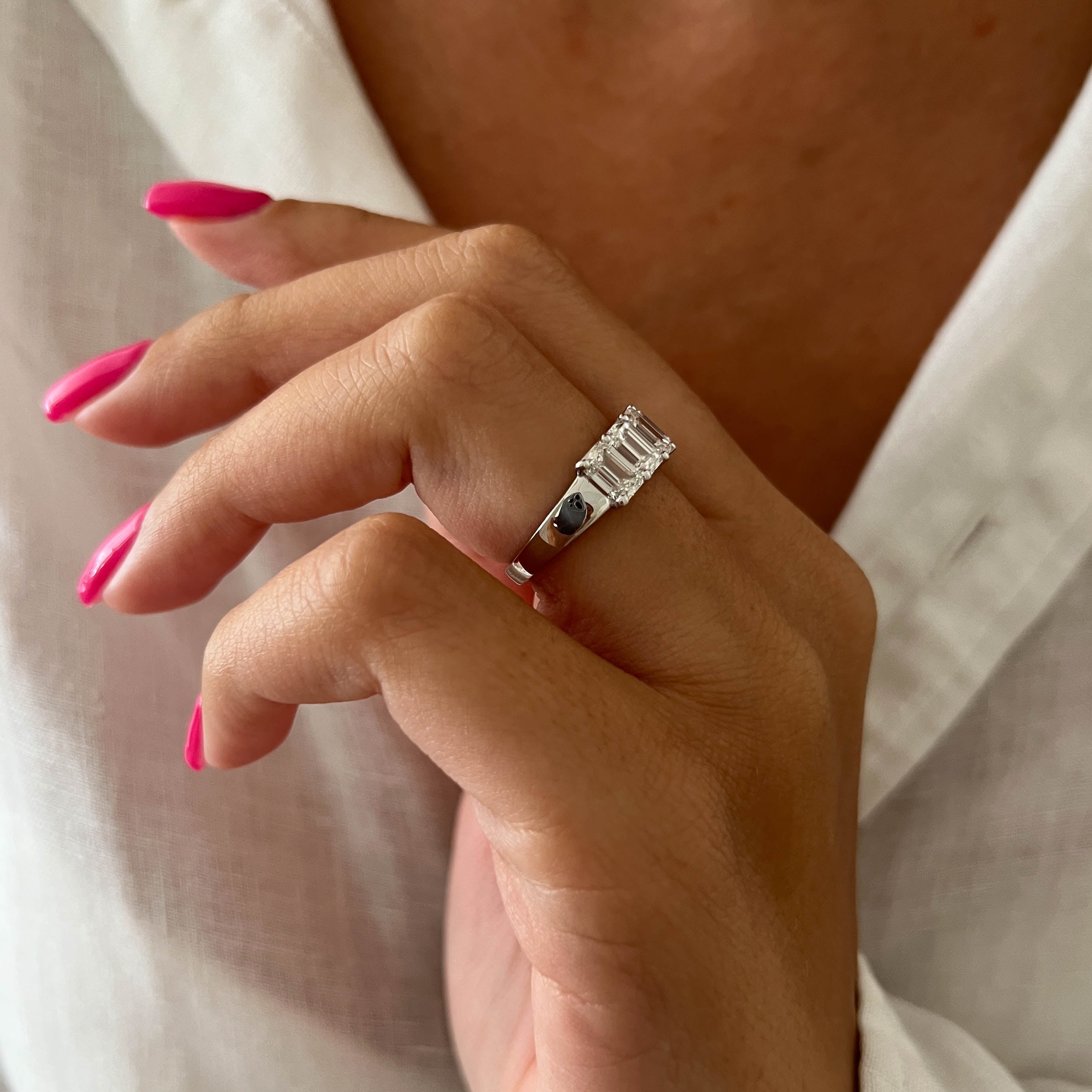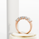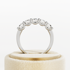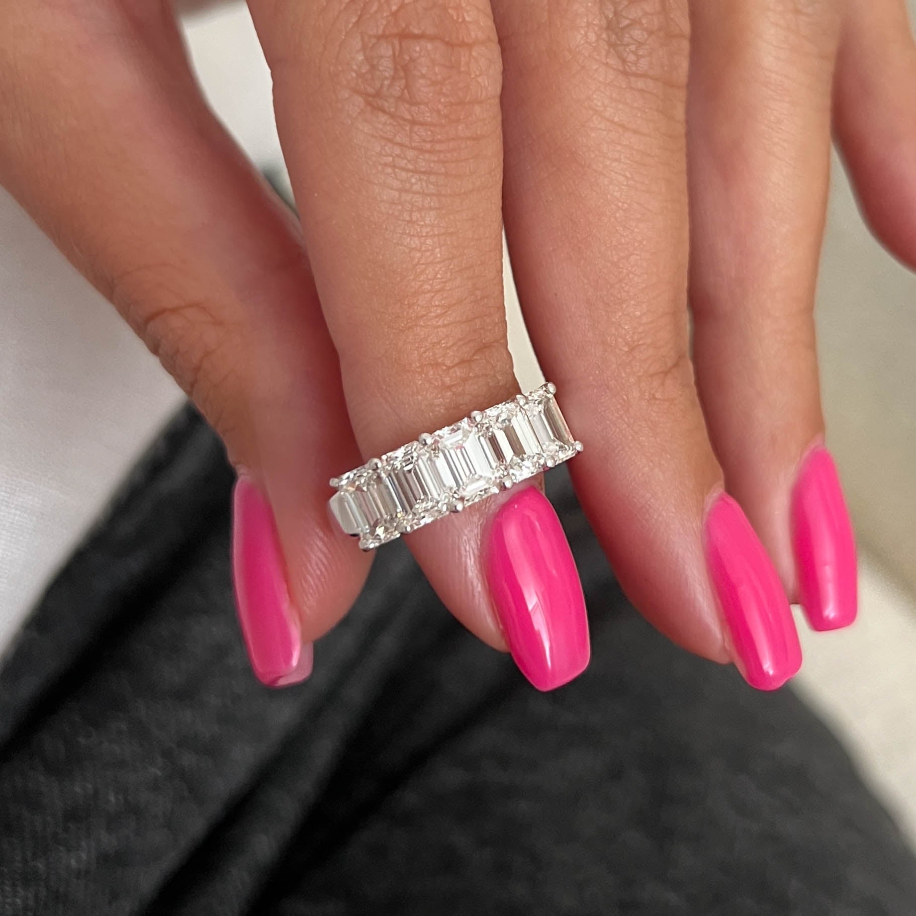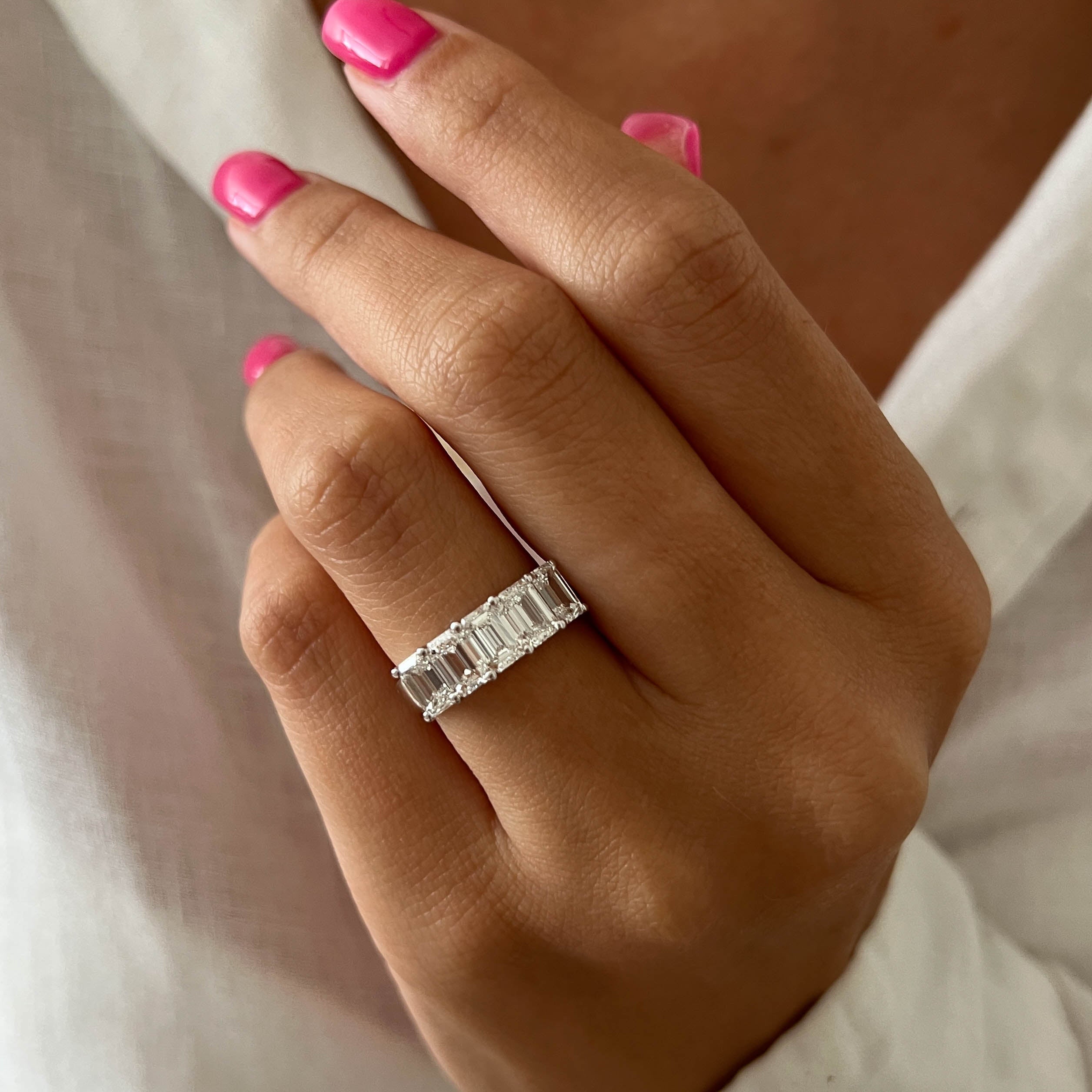 A stunning five-stone band showcases a total carat weight of 2.5, with each emerald-cut lab-grown diamond weighing 0.5 carats. The U-sh...
